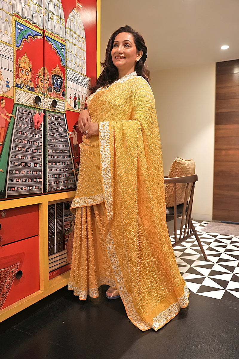GOLDEN YELLOW ETERNAL DOT BANDHANI SILK SAREE WITH MUKAISH WORK