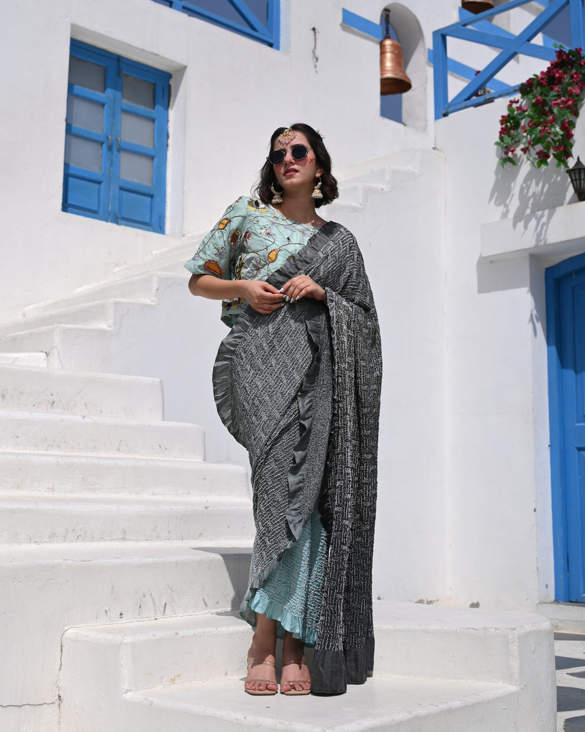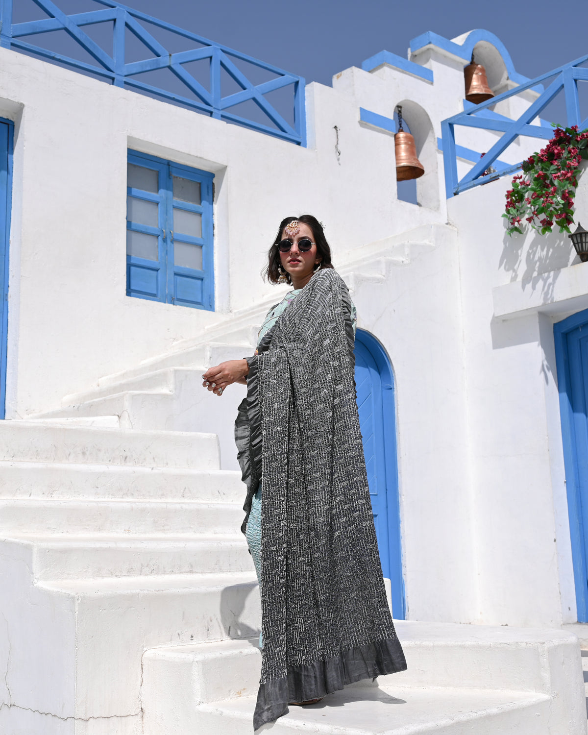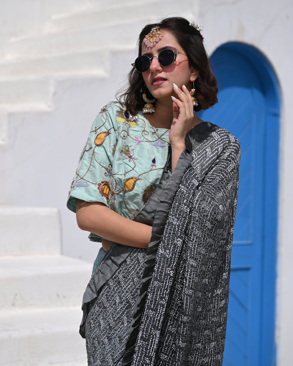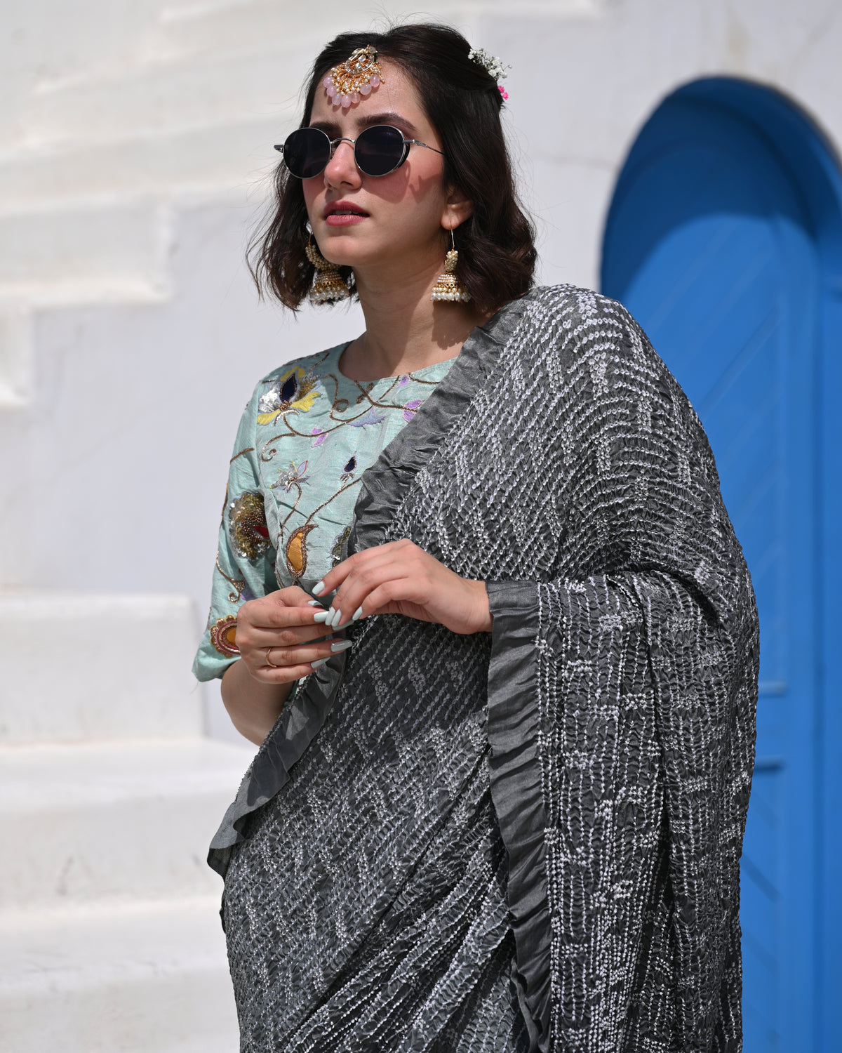BLUE-GREY BROKEN LINES GEOMETRIC BANDHANI SILK SAREE