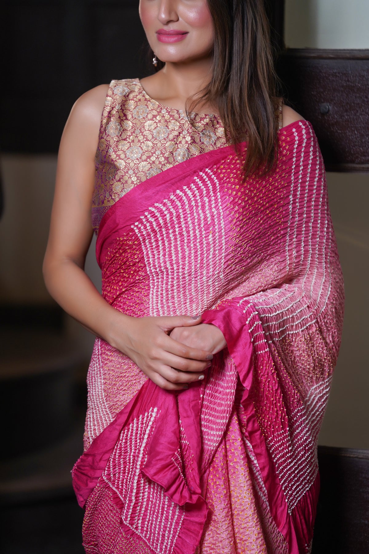 PINK LINES AND DOTS BANDHANI SILK SAREE