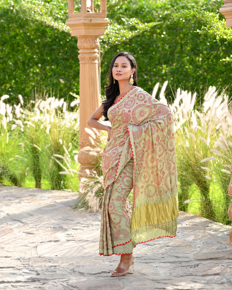 LIGHT GREEN CIRCLES OF LIFE BANDHANI SILK SAREE