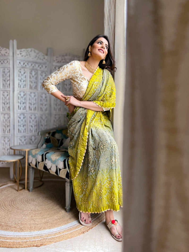 GREEN-GREY JAPANESE BANDHANI SILK SAREE