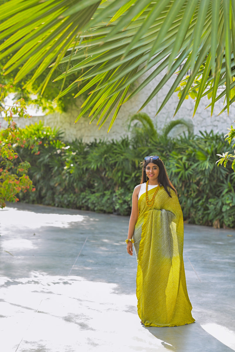 MUSTARD YELLOW YIN-YANG HALF FULL HALF EMPTY ETERNAL DOT BANDHANI SILK SAREE