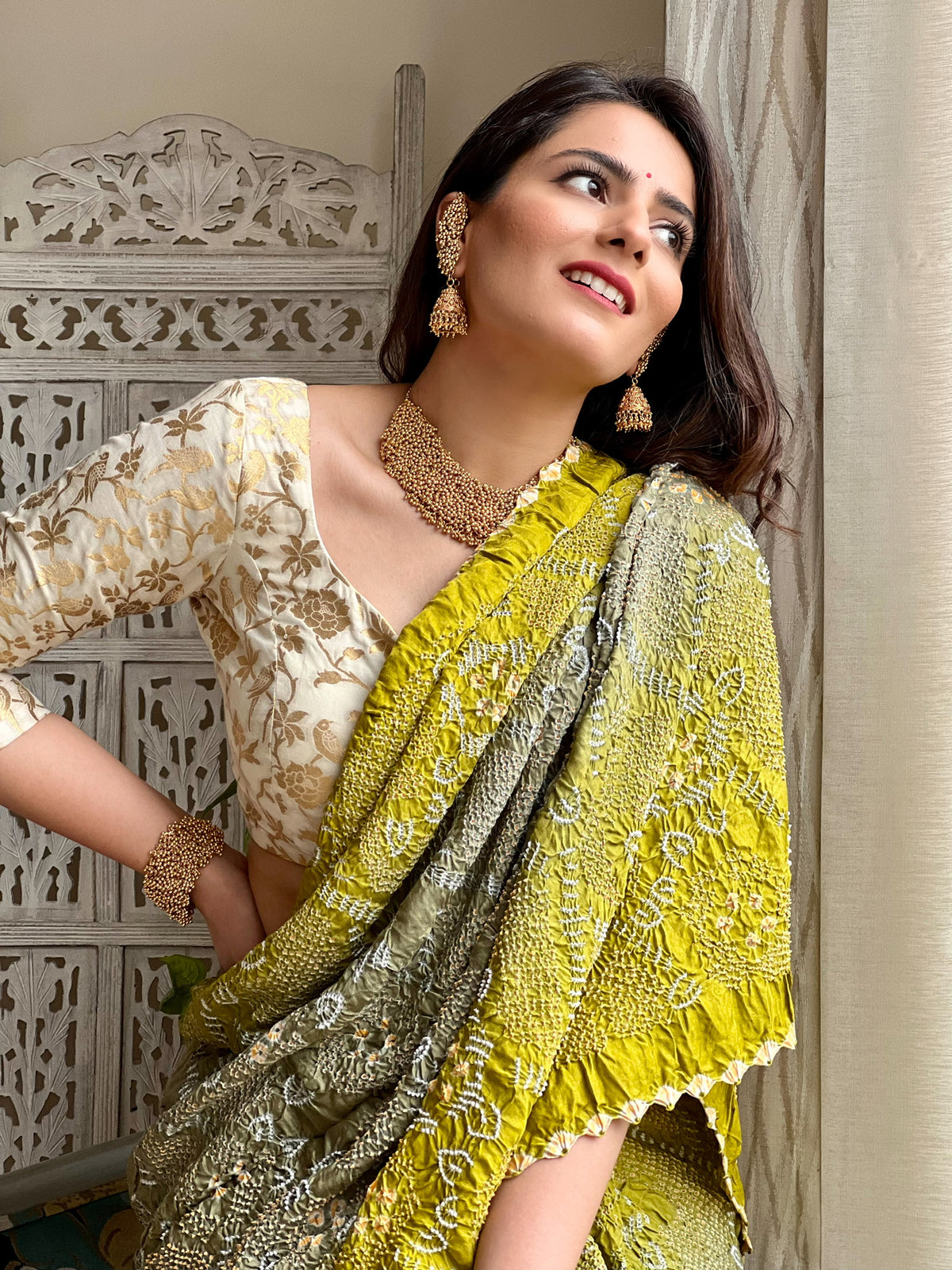 GREEN-GREY JAPANESE BANDHANI SILK SAREE