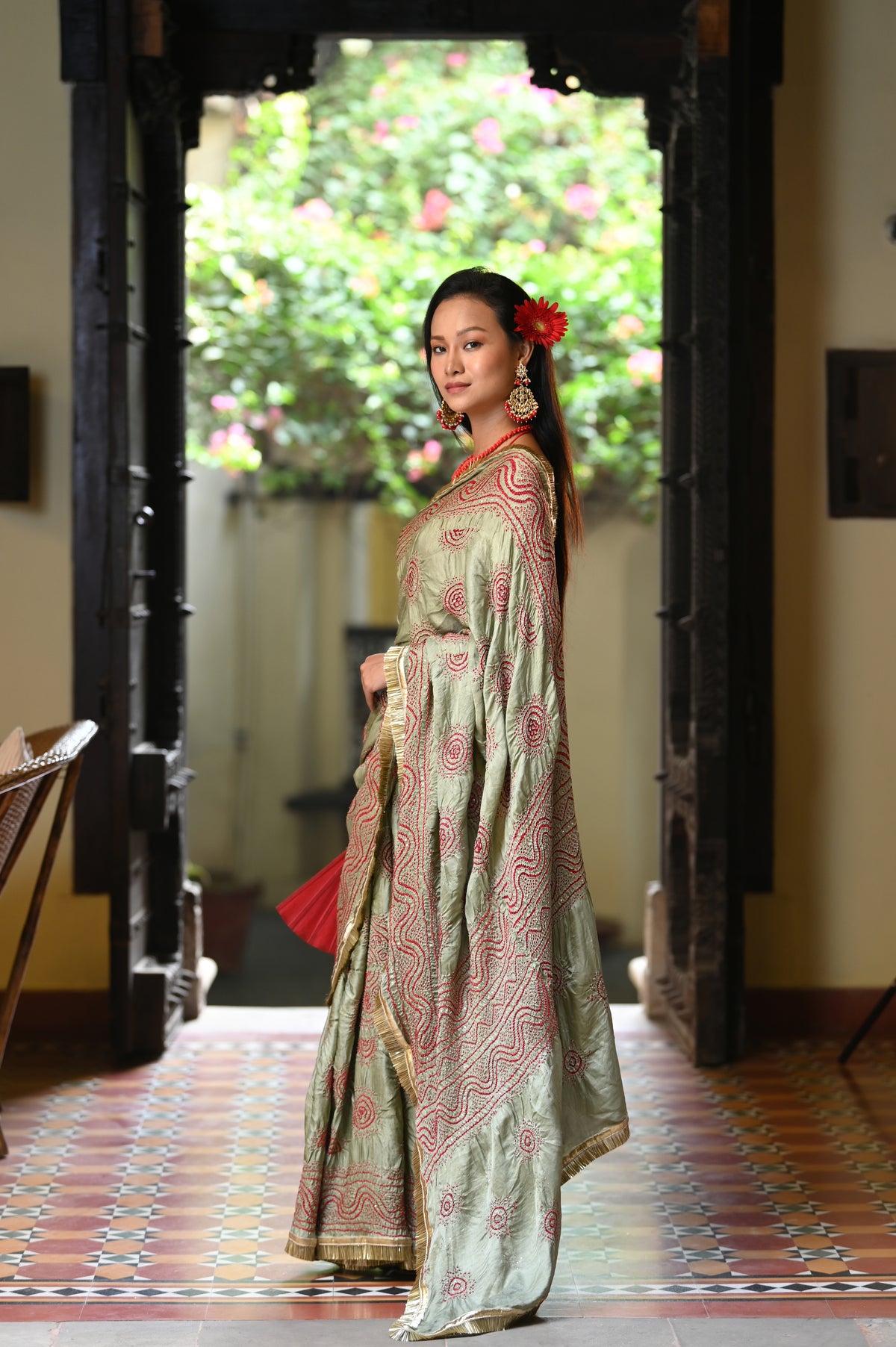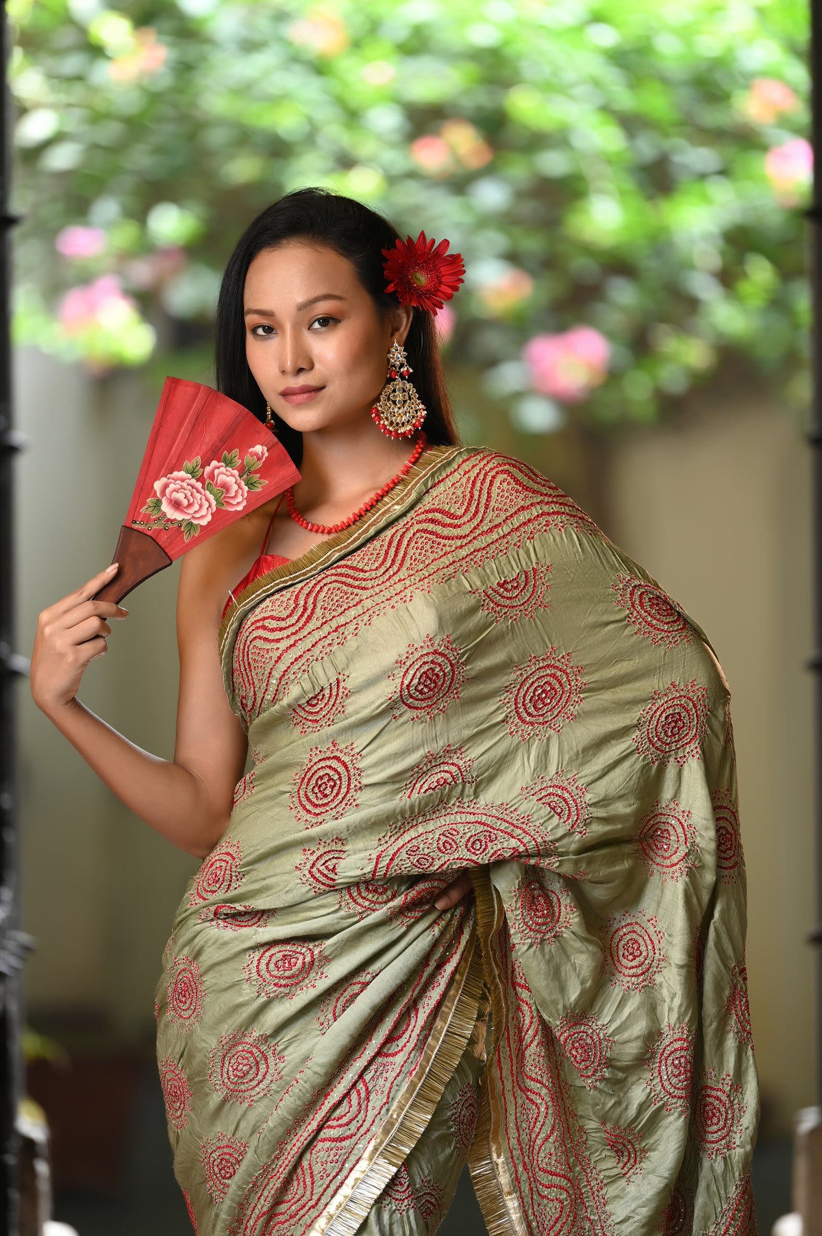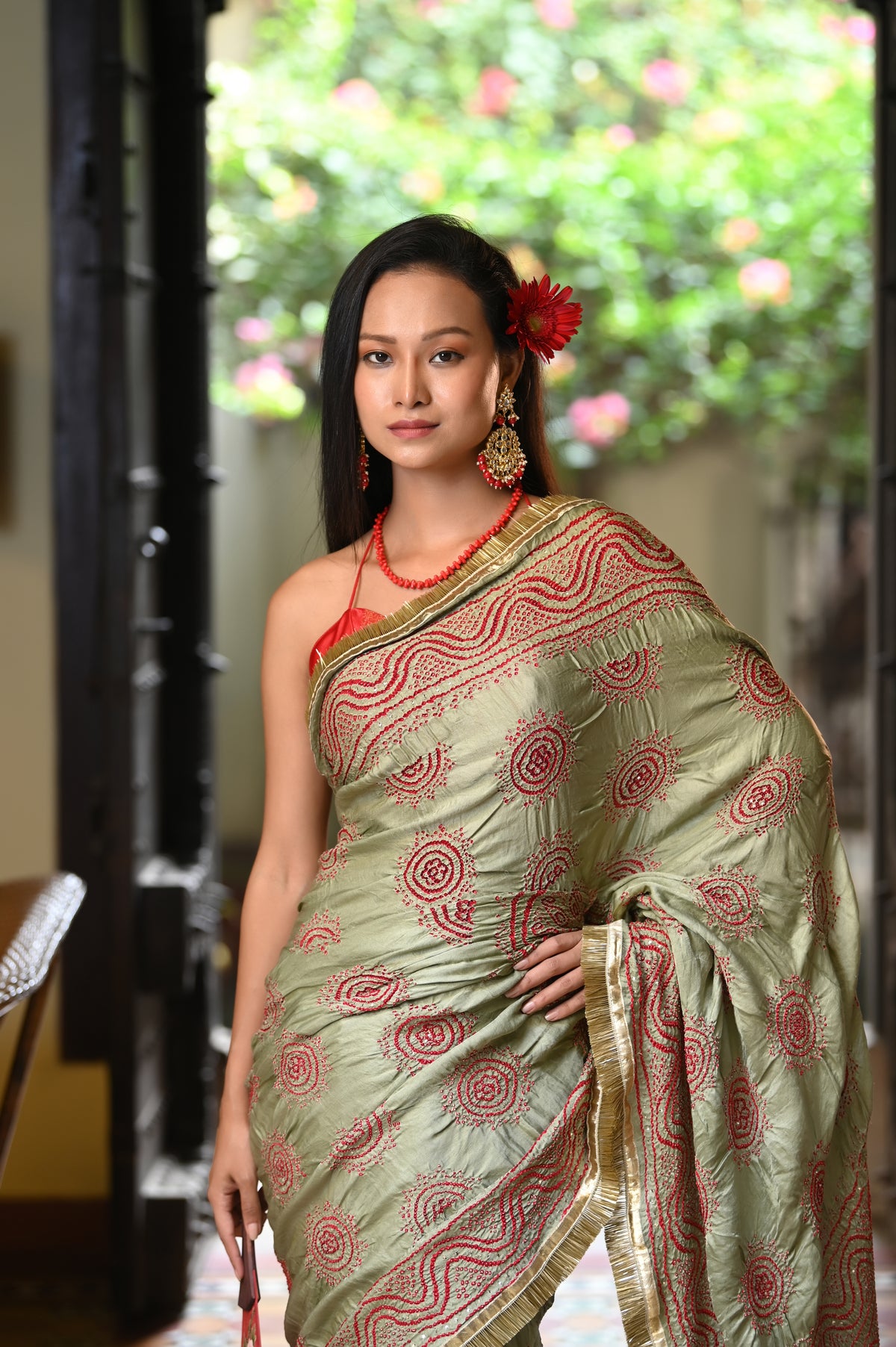 LIGHT GREEN CLASSIC TRADITIONAL LADDU BANDHANI SILK SAREE WITH MUKAISH WORK AND KIRAN BORDER