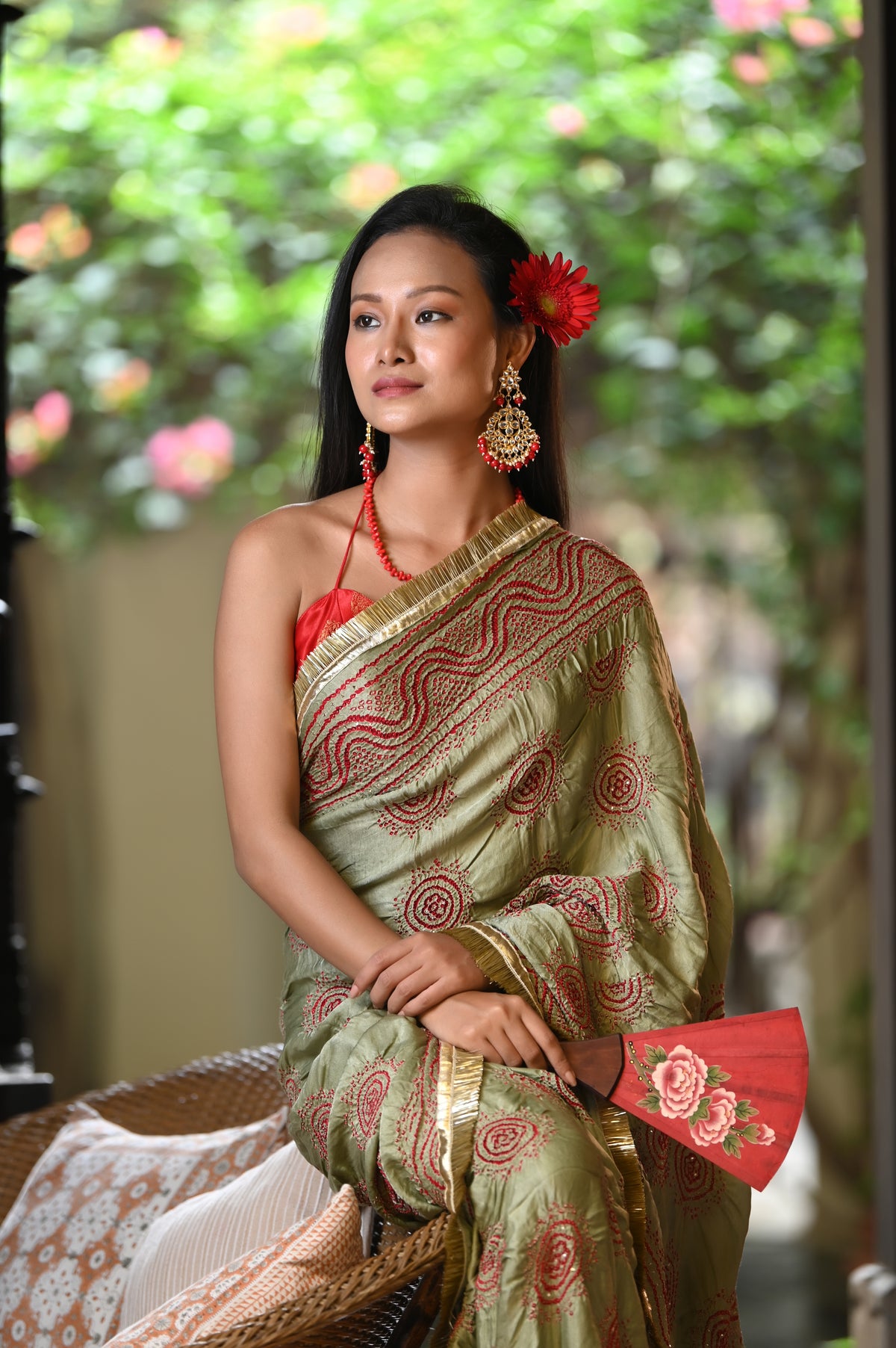 The Neelgar Classic Traditional Laddu Saree features elements of traditional bandhani, enhanced with Neelgar's elegant touch and unique palette of colors, not found traditionally. This saree beautifully blends old-world charm with contemporary sophistication.