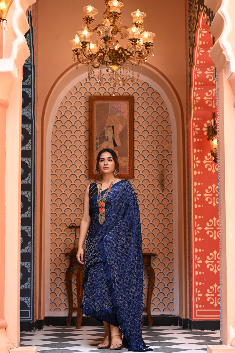 GEOMETRIC NEW DIAMOND BANDHANI SILK SAREE INDIGO BLUE