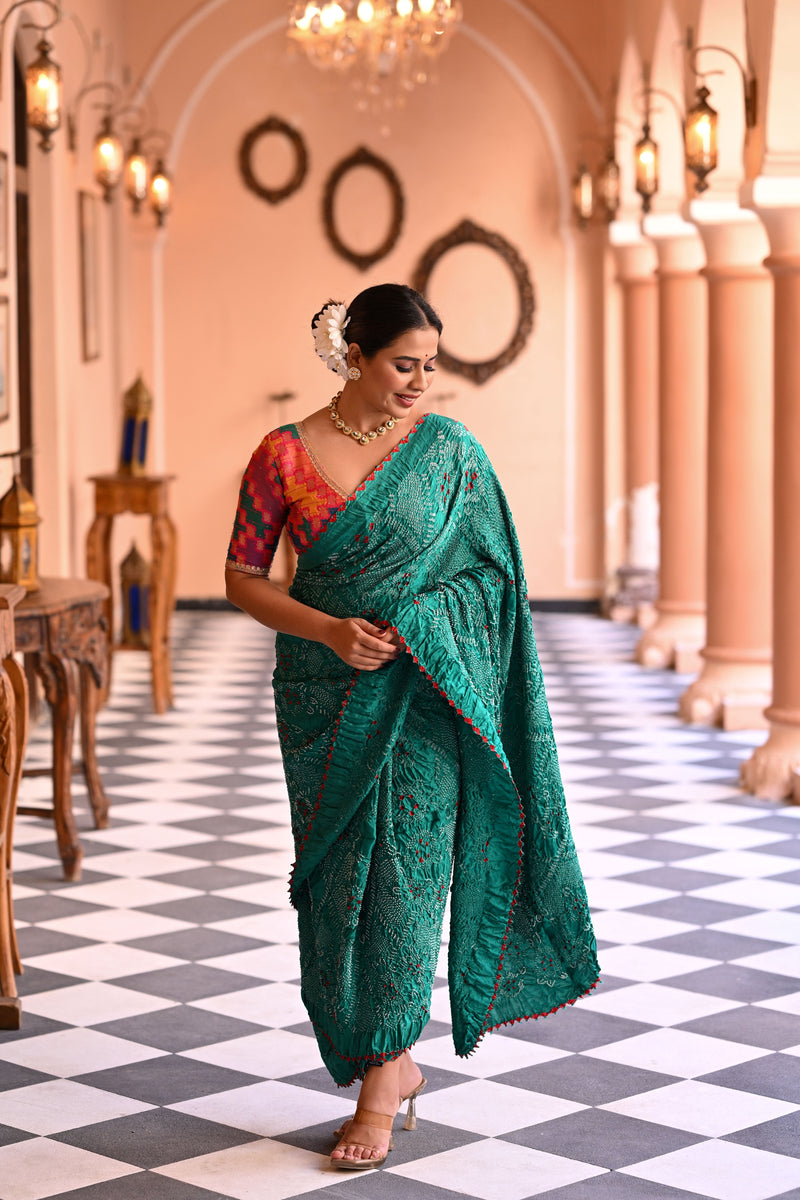 BLUE-GREEN ETERNAL DOTS BANDHANI SILK SAREE