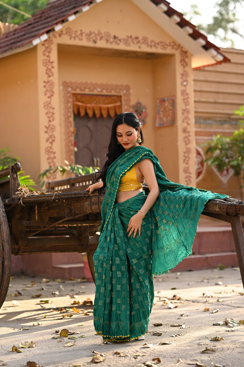 GREEN ETERNAL DOTS BANDHANI SILK SAREE WITH MUKAISH