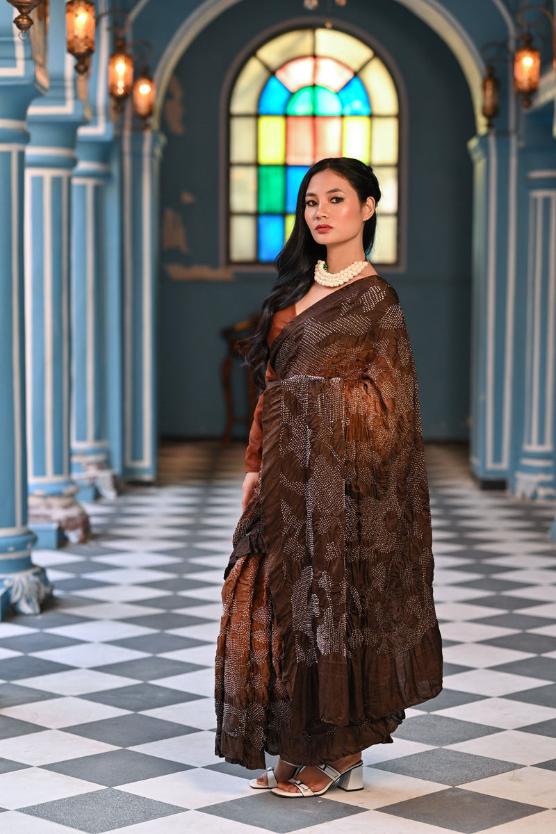 BROWN ABSTRACT BANDHANI SILK SAREE