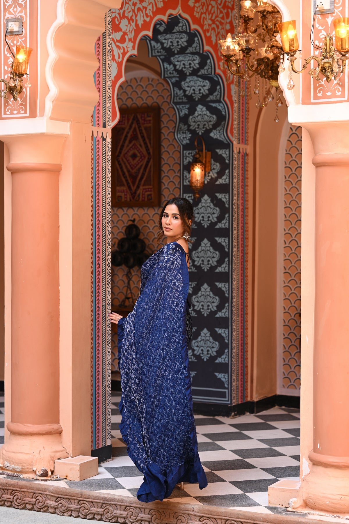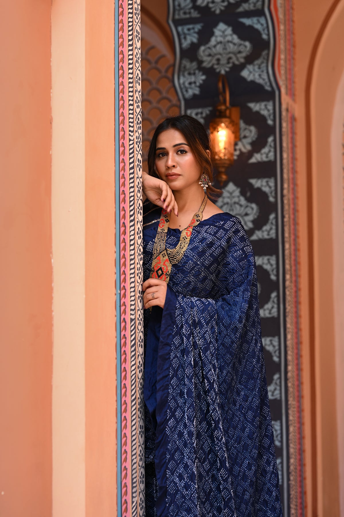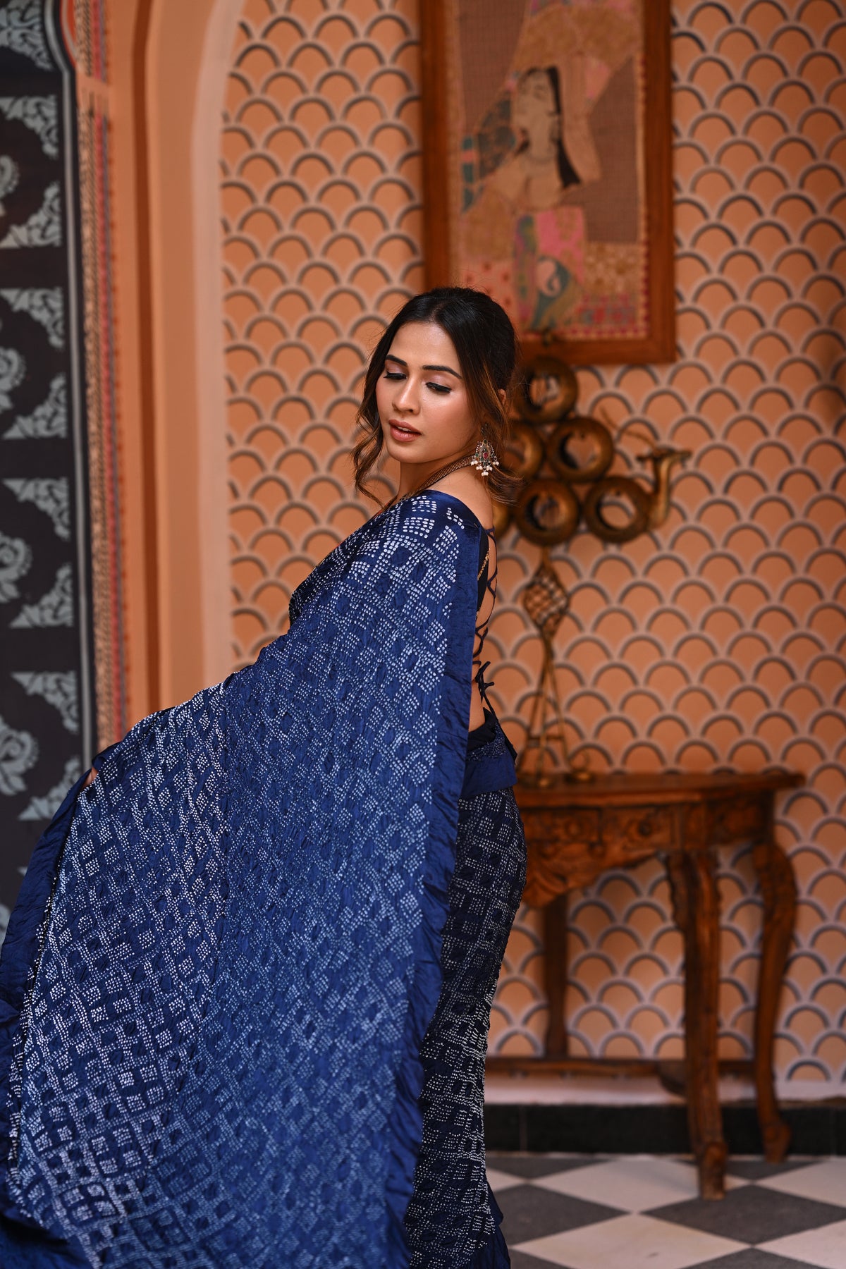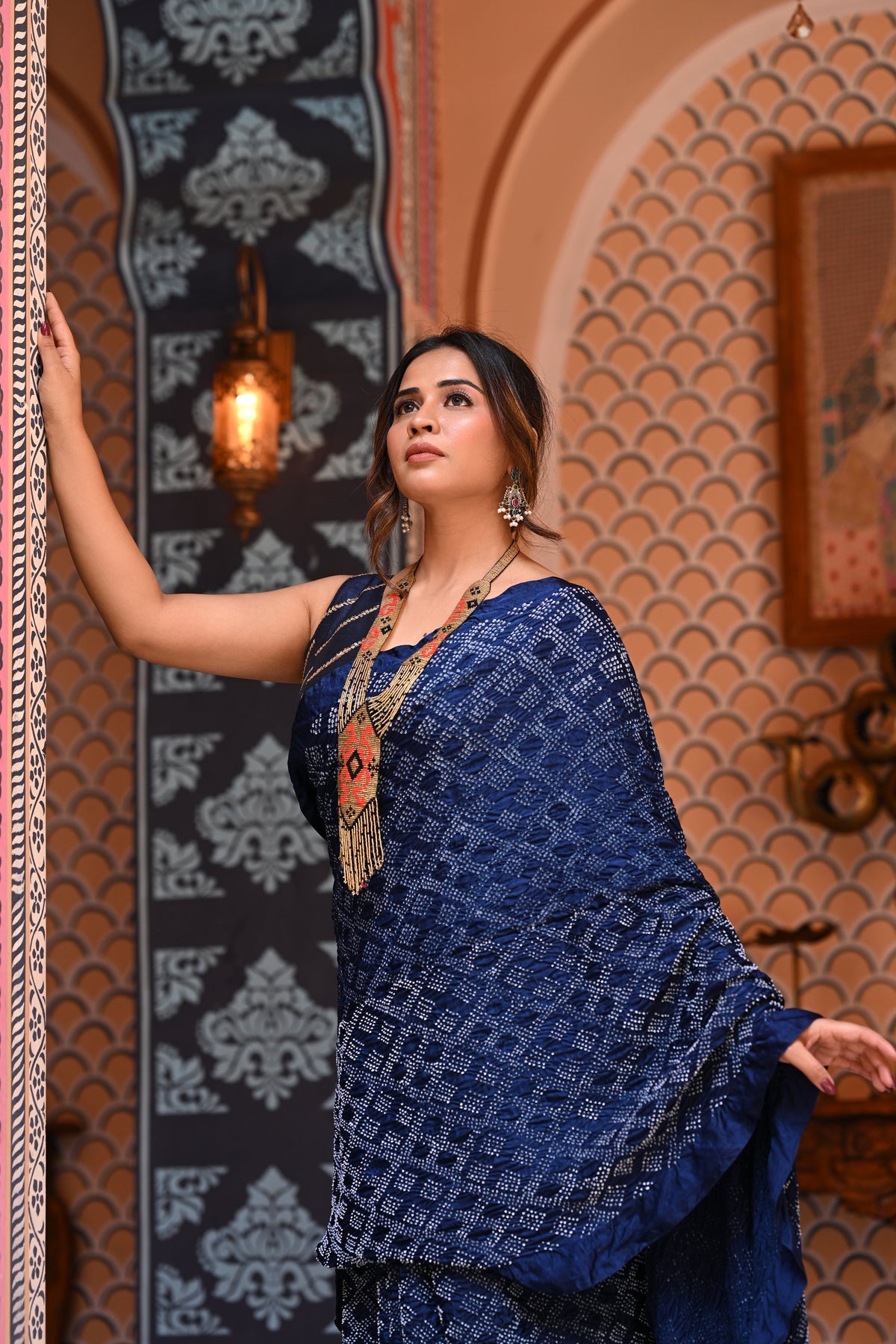 GEOMETRIC NEW DIAMOND BANDHANI SILK SAREE INDIGO BLUE