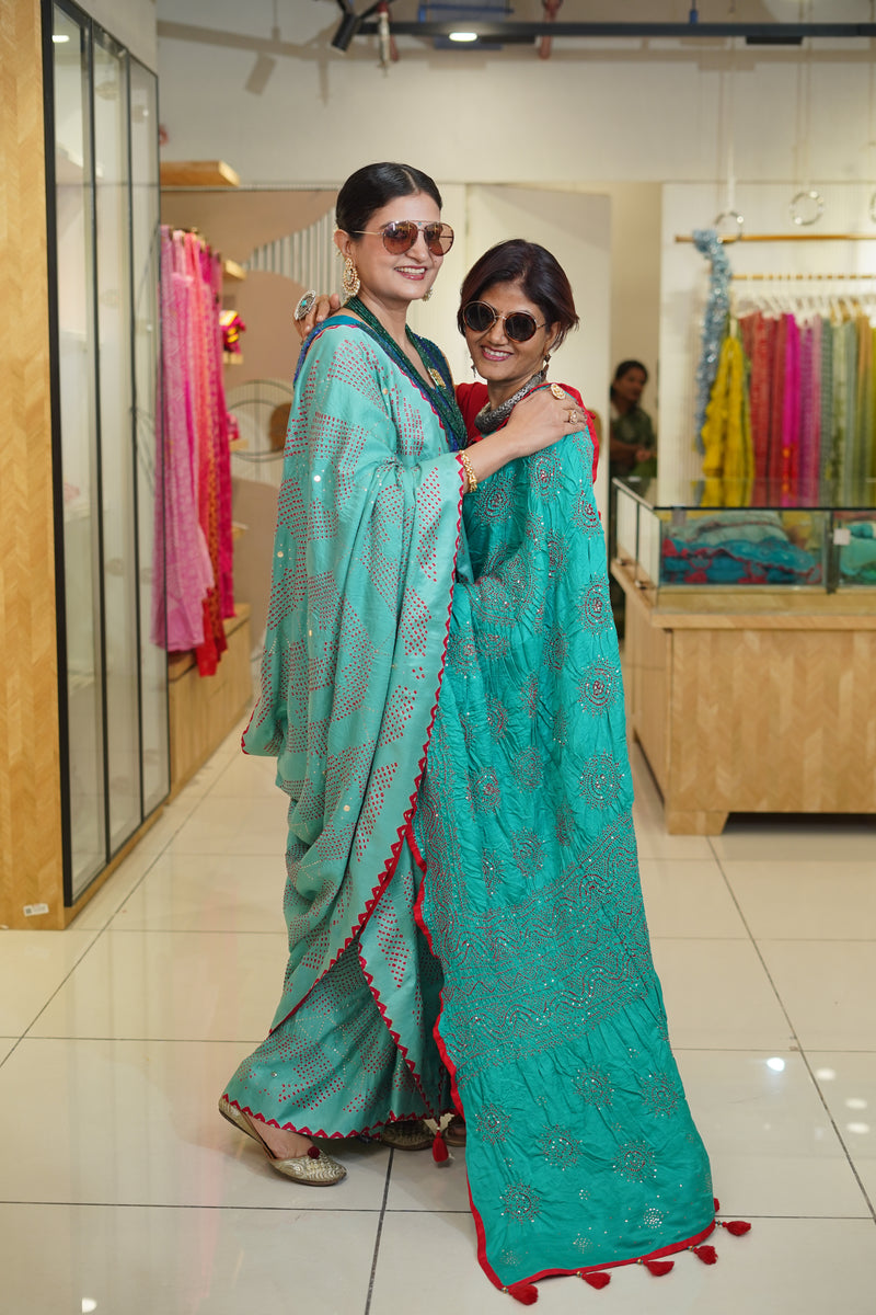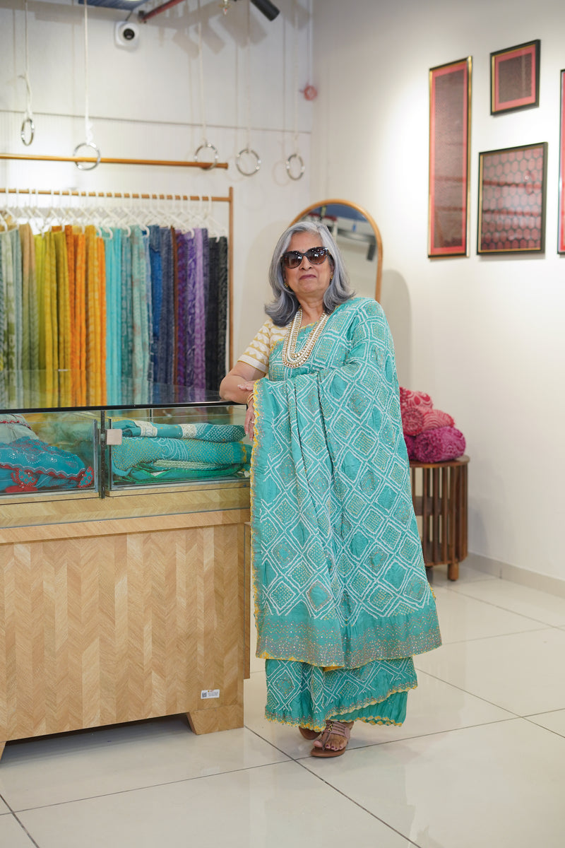 INDIGO BLUE WAVES OF THE SEA BANDHANI SILK SAREE WITH MUKAISH WORK AND SILK BORDER