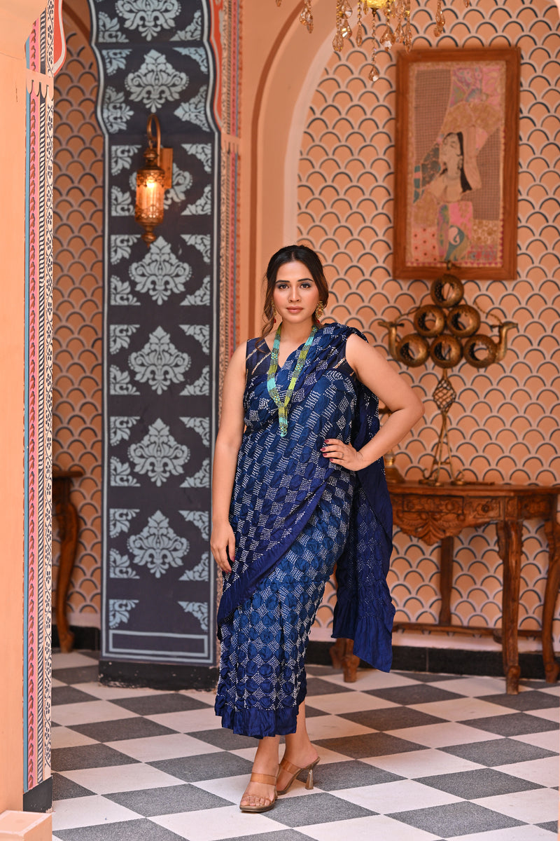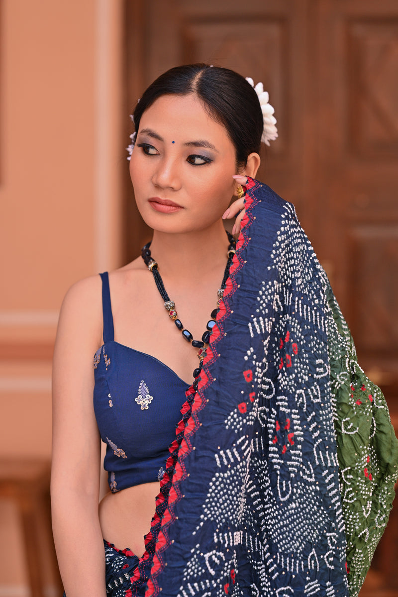 INDIGO BLUE JAPANESE BANDHANI SILK SAREE WITH MUKAISH WORK