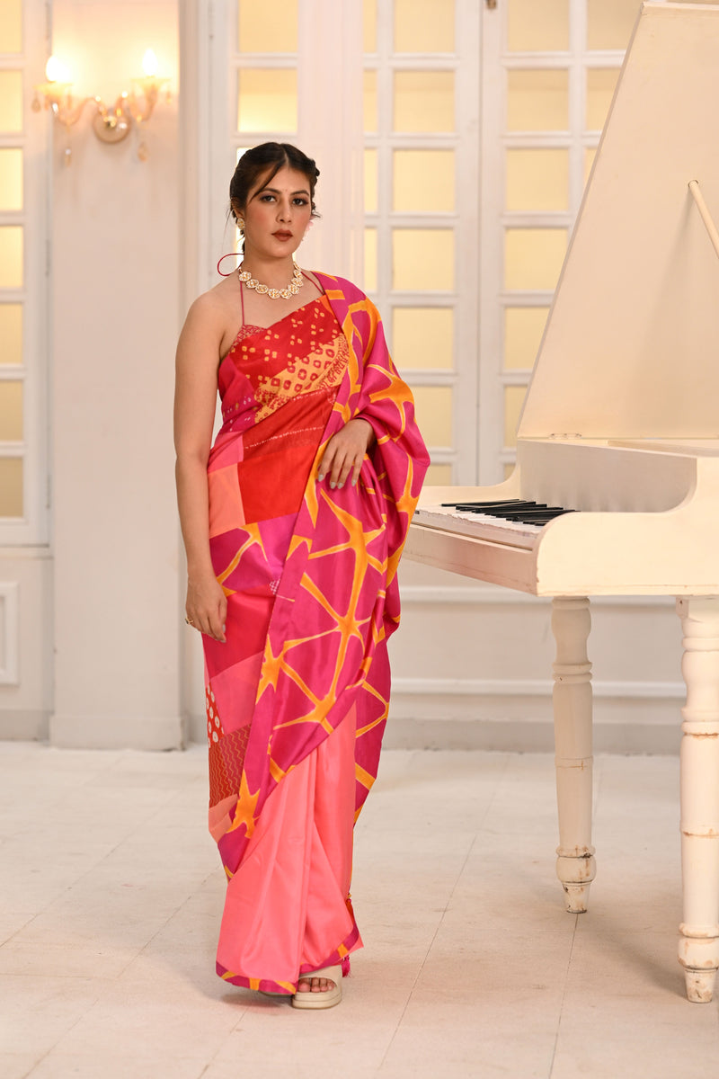 RED-PINK BAARADOZI PATCHWORK REVERSIBLE SILK SAREE