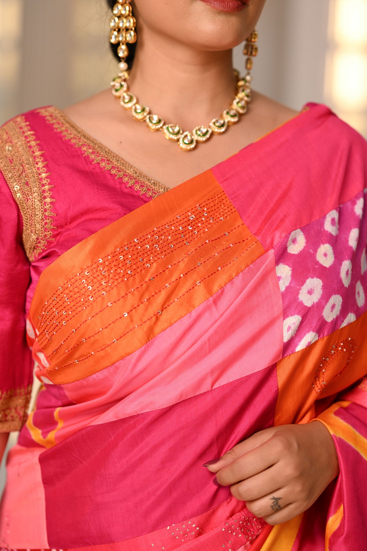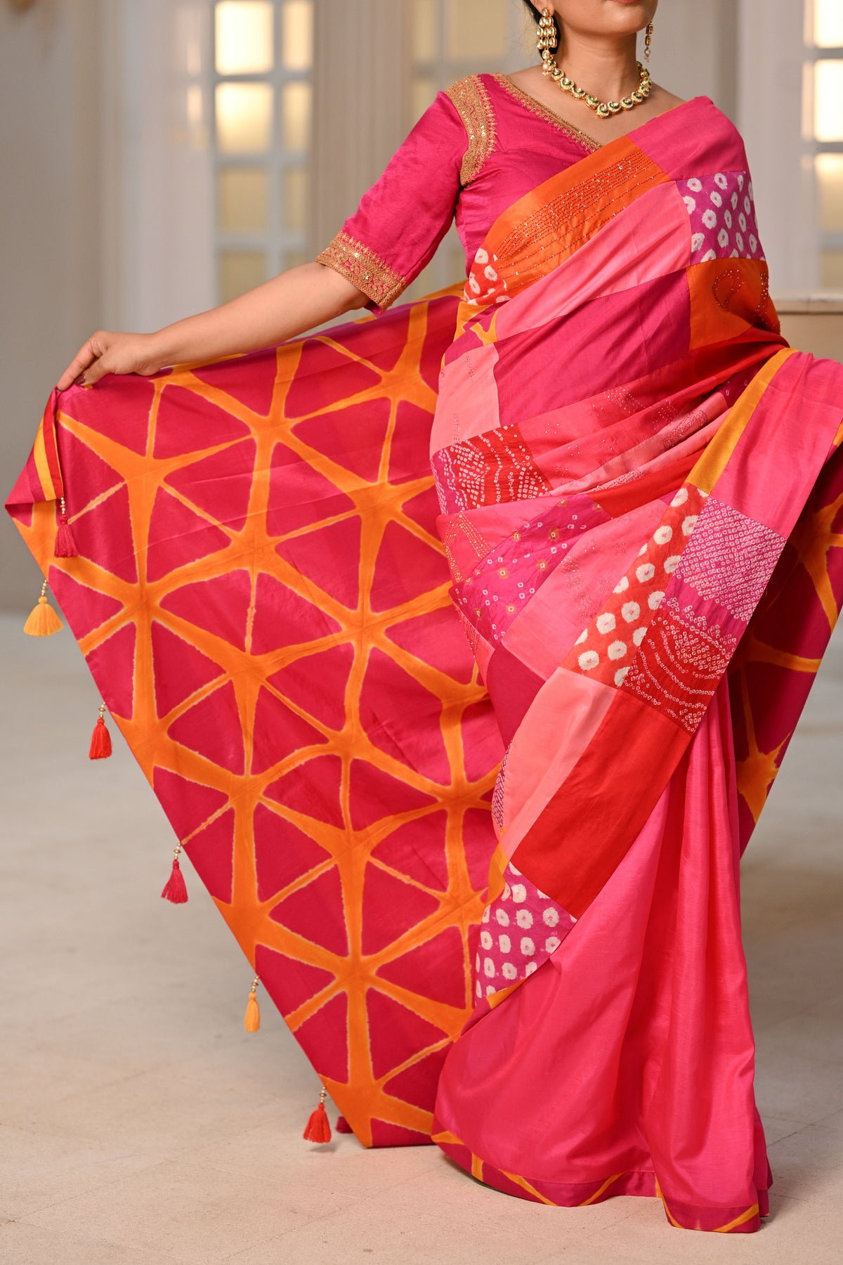 Our Reversible Patchwork Bandhani Dupattas, Stoles, and Sarees embody the perfect blend of tradition and versatility. Each piece is thoughtfully designed with two distinct sides, allowing you to switch between styles with ease. On one side, you'll find an intricate patchwork of fabrics, each carefully stitched together to form a unique mosaic of textures and patterns. The reverse side features either a classic bandhani design or a striking block print and wavy leheriya, offering a contrasting yet complementary look. This dual design allows you to choose between a bold, artisanal appearance or a more understated, refined elegance. Each piece in this collection is a one-of-a-kind creation, with patches that share a consistent color theme but vary in design, ensuring that no two items are exactly alike. Perfect for any occasion, they are a statement of style, tradition, and individuality, adapting effortlessly to your mood and wardrobe needs.