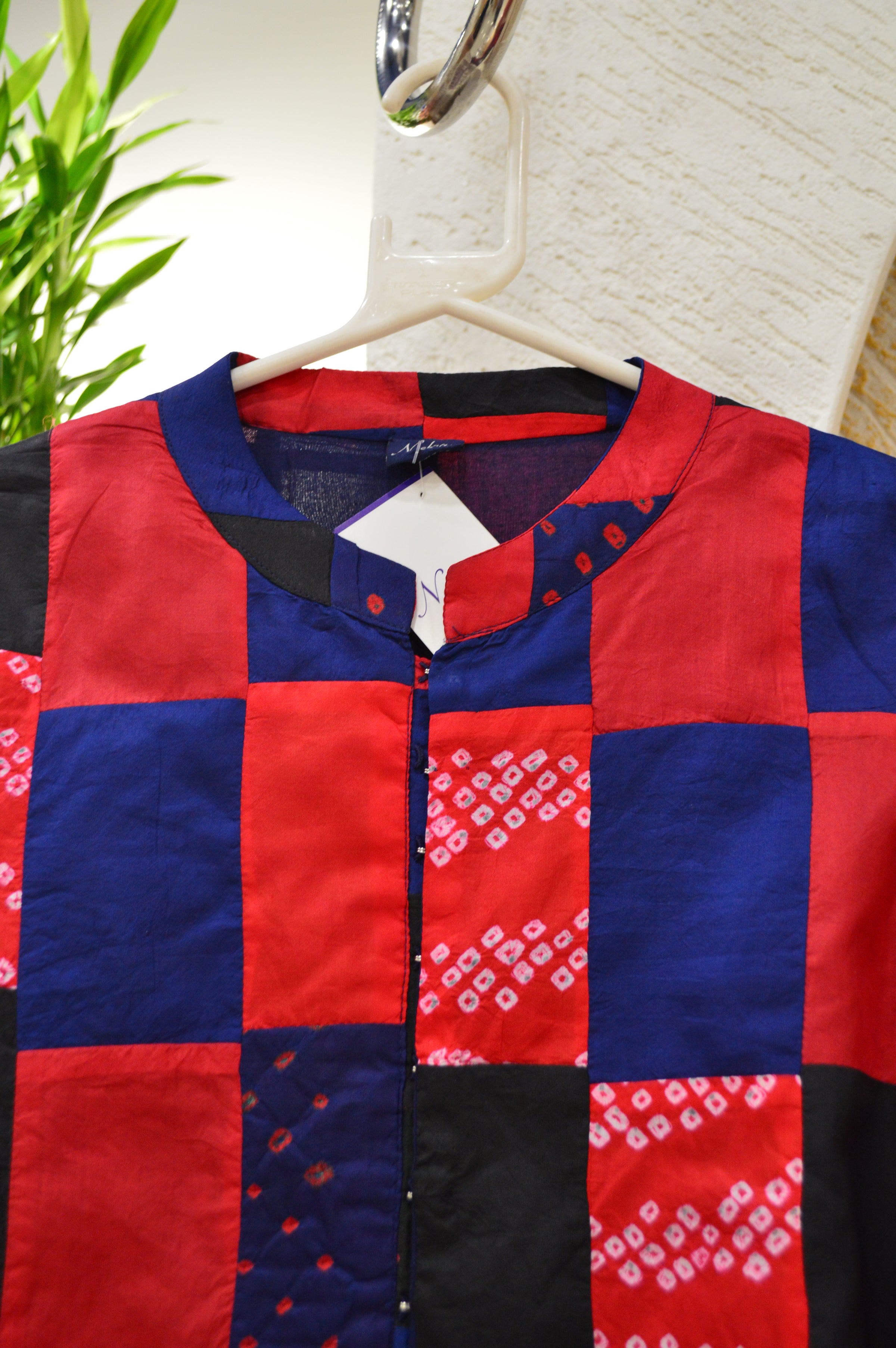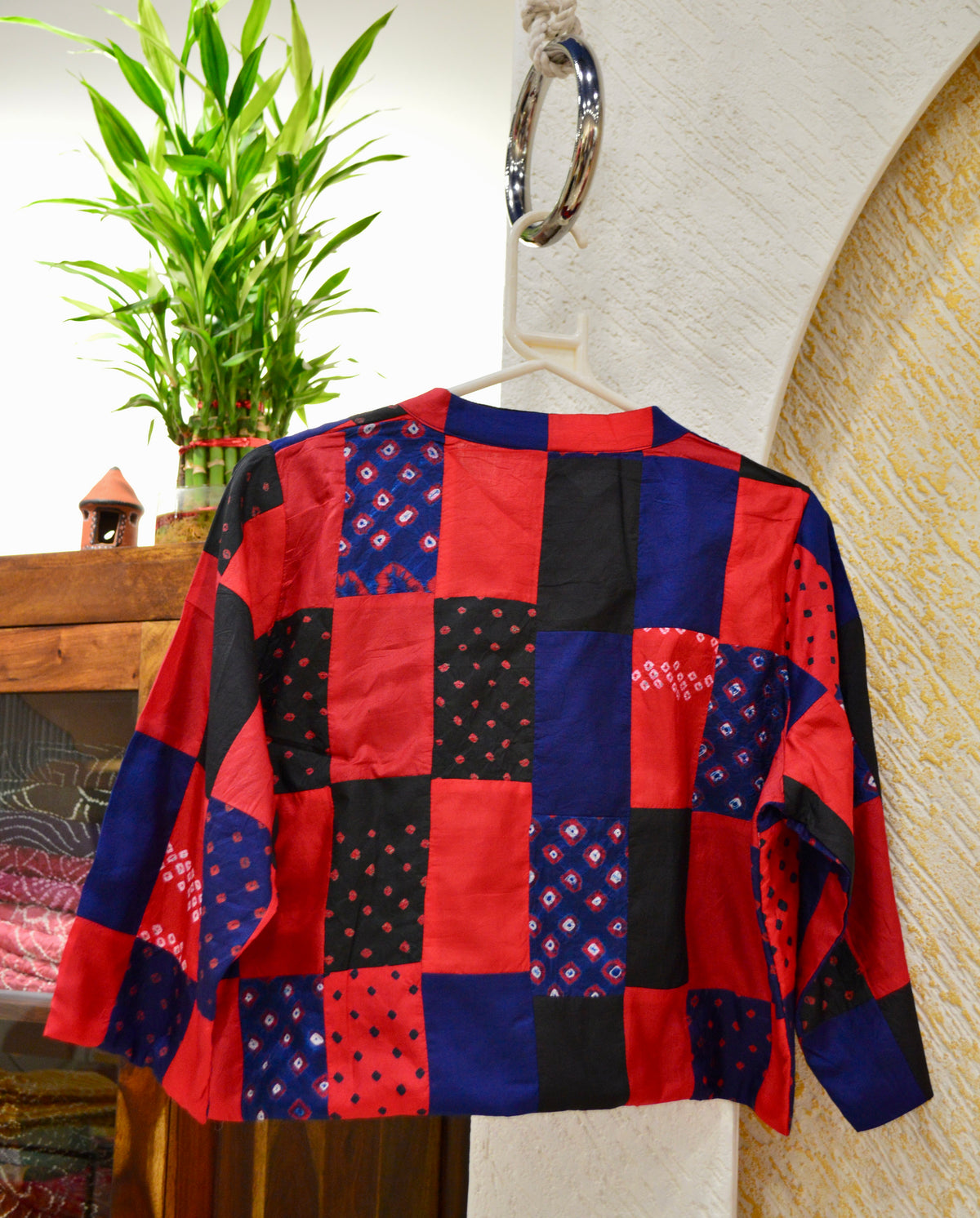BLUE-RED-BLACK PATCHWORK SILK BLOUSE