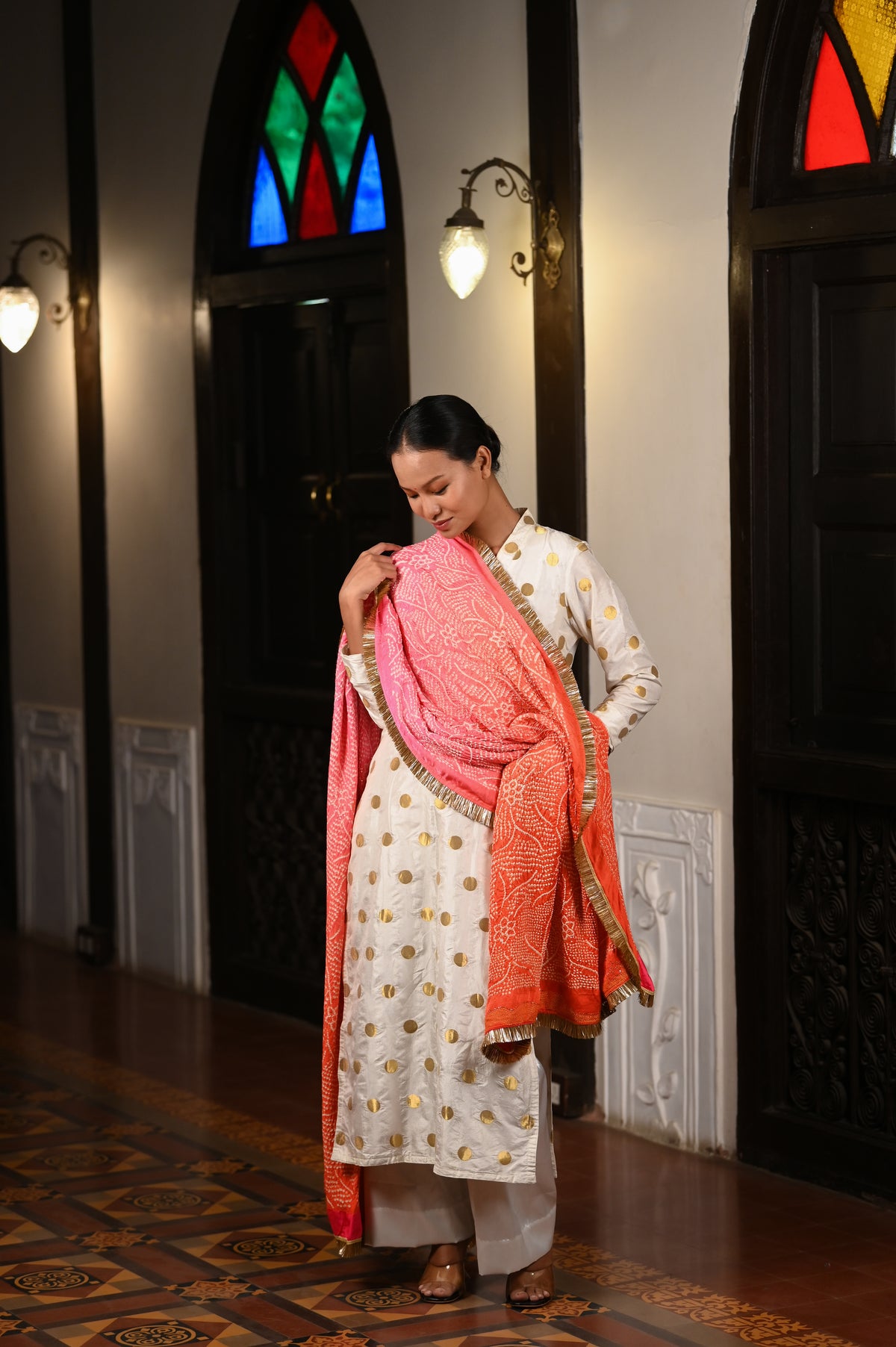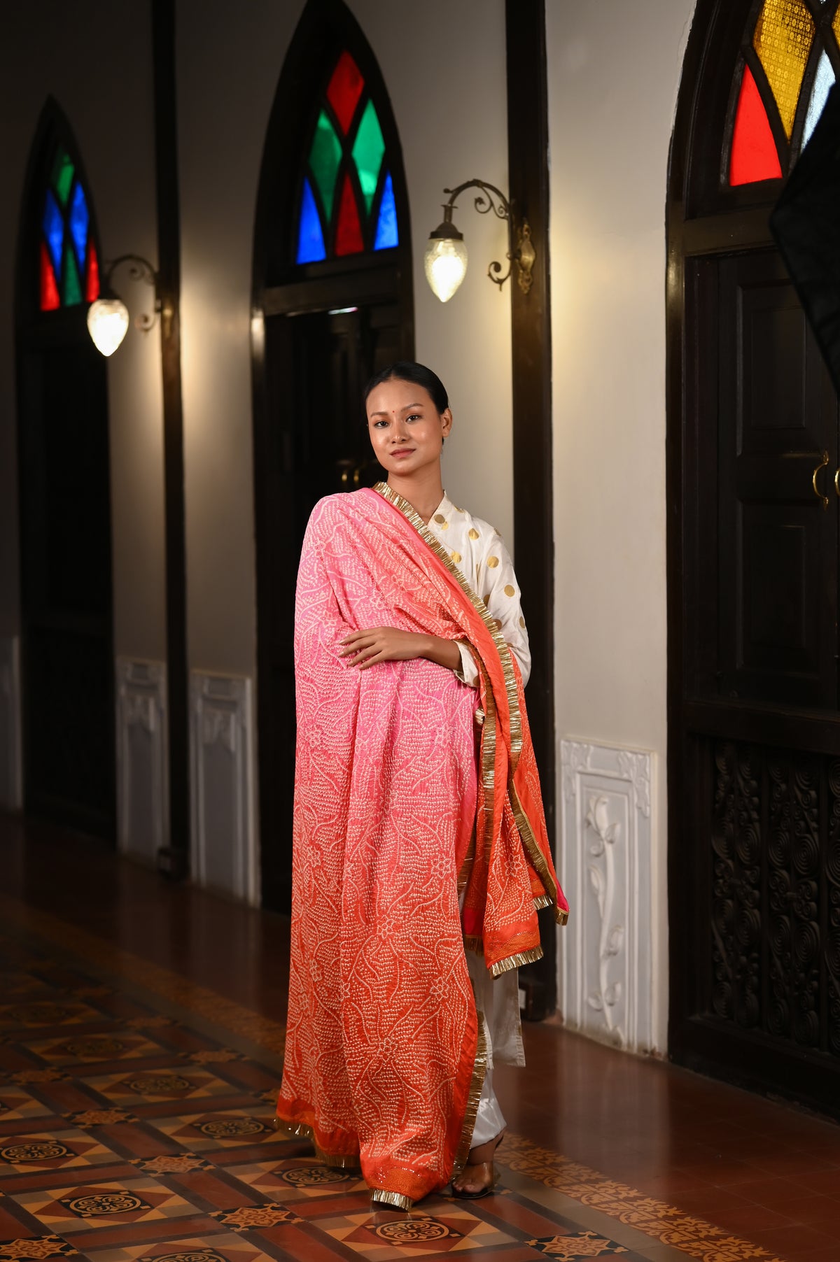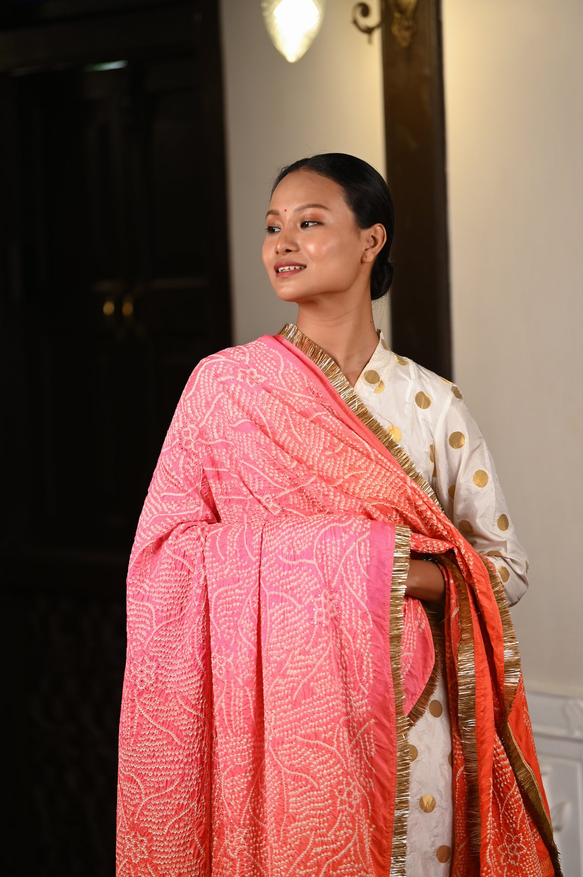 PEACH-PINK POPPY FLOWER BANDHANI SILK DUPATTA WITH KIRAN BORDER