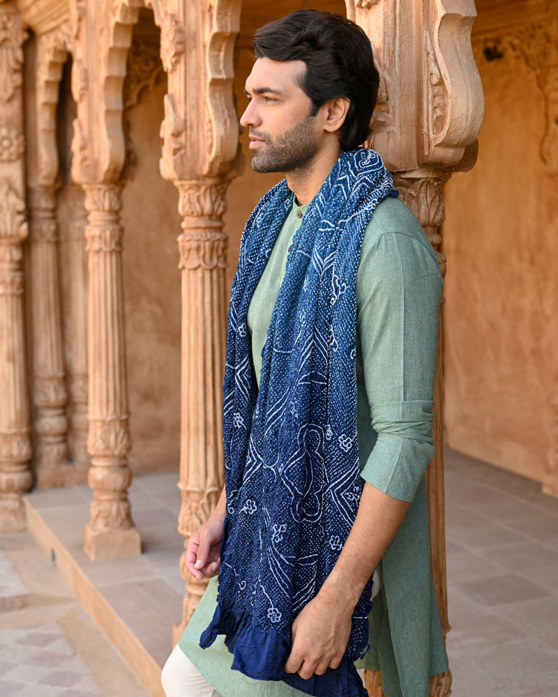 BLUE CIRCLE OF THE LIFE BANDHANI SILK DUPATTA WITH APPLIQUE BORDER AND TASSELS