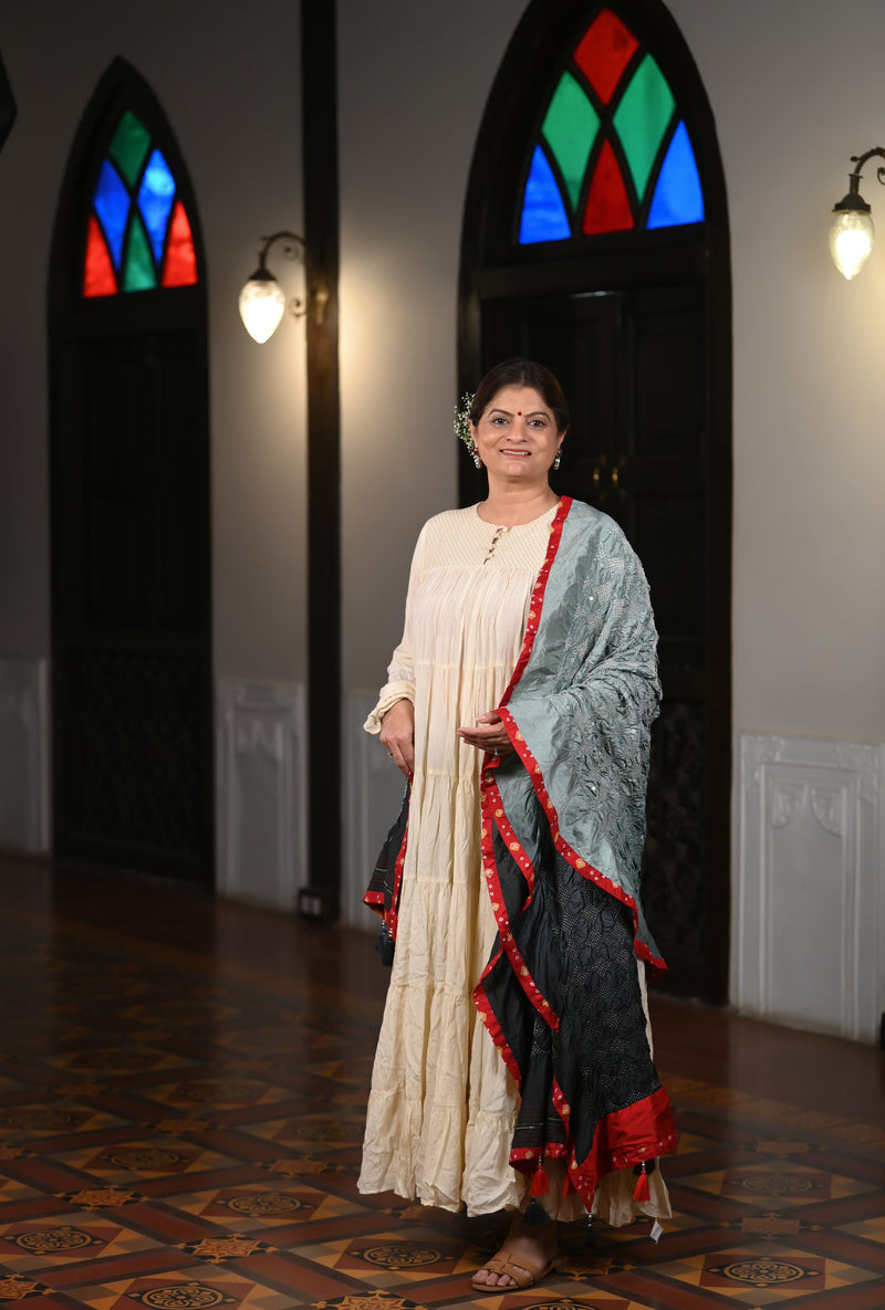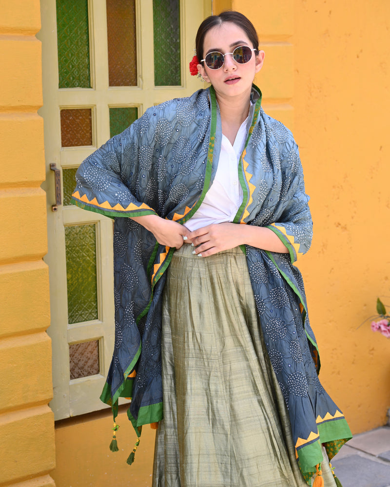 GREY CIRCLES OF THE LIFE BANDHANI SILK DUPATTA WITH LAMPI BORDER AND TASSELS
