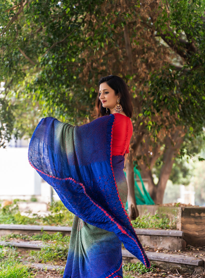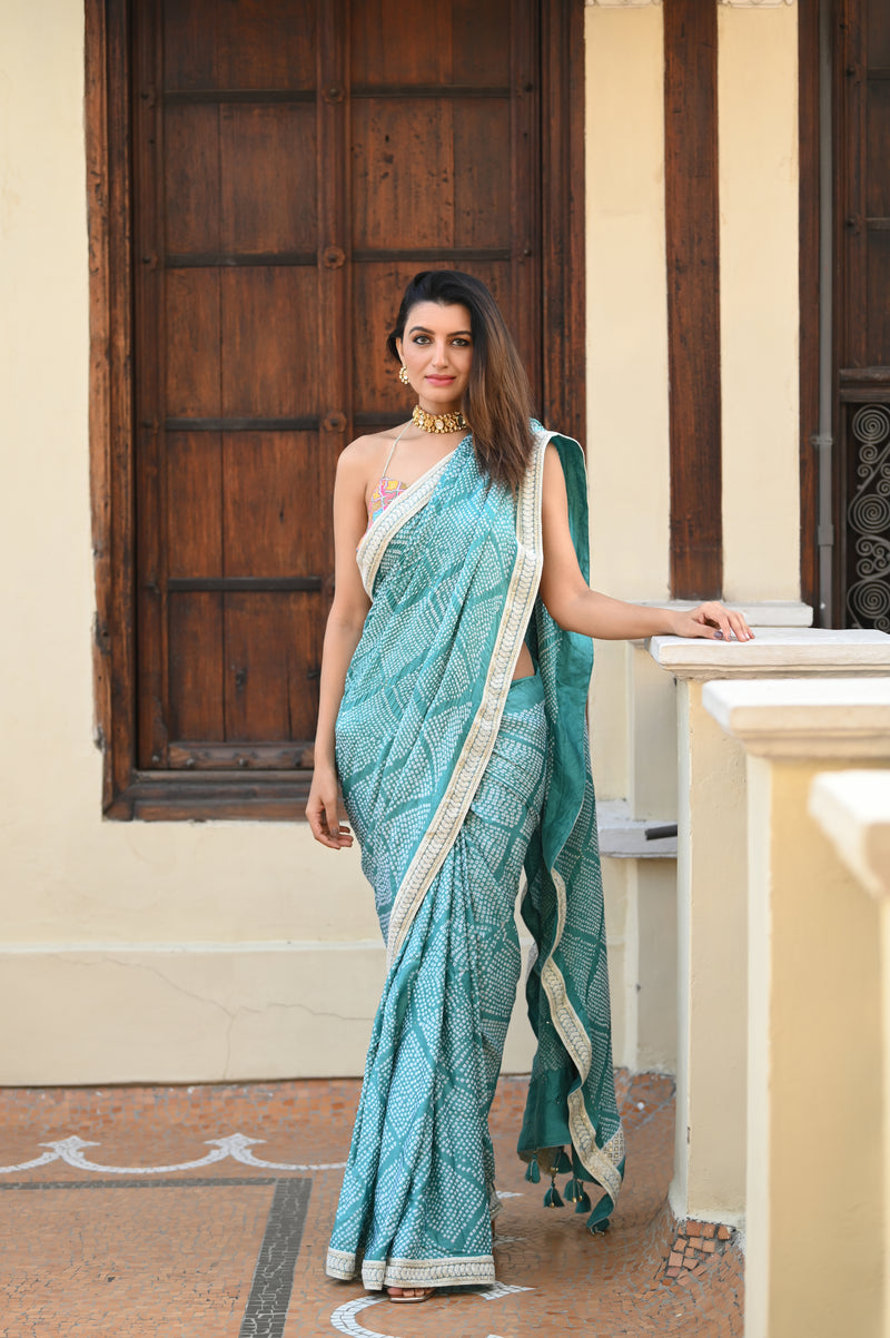 BLUE-GREEN ETERNAL DOTS BANDHANI SILK SAREE
