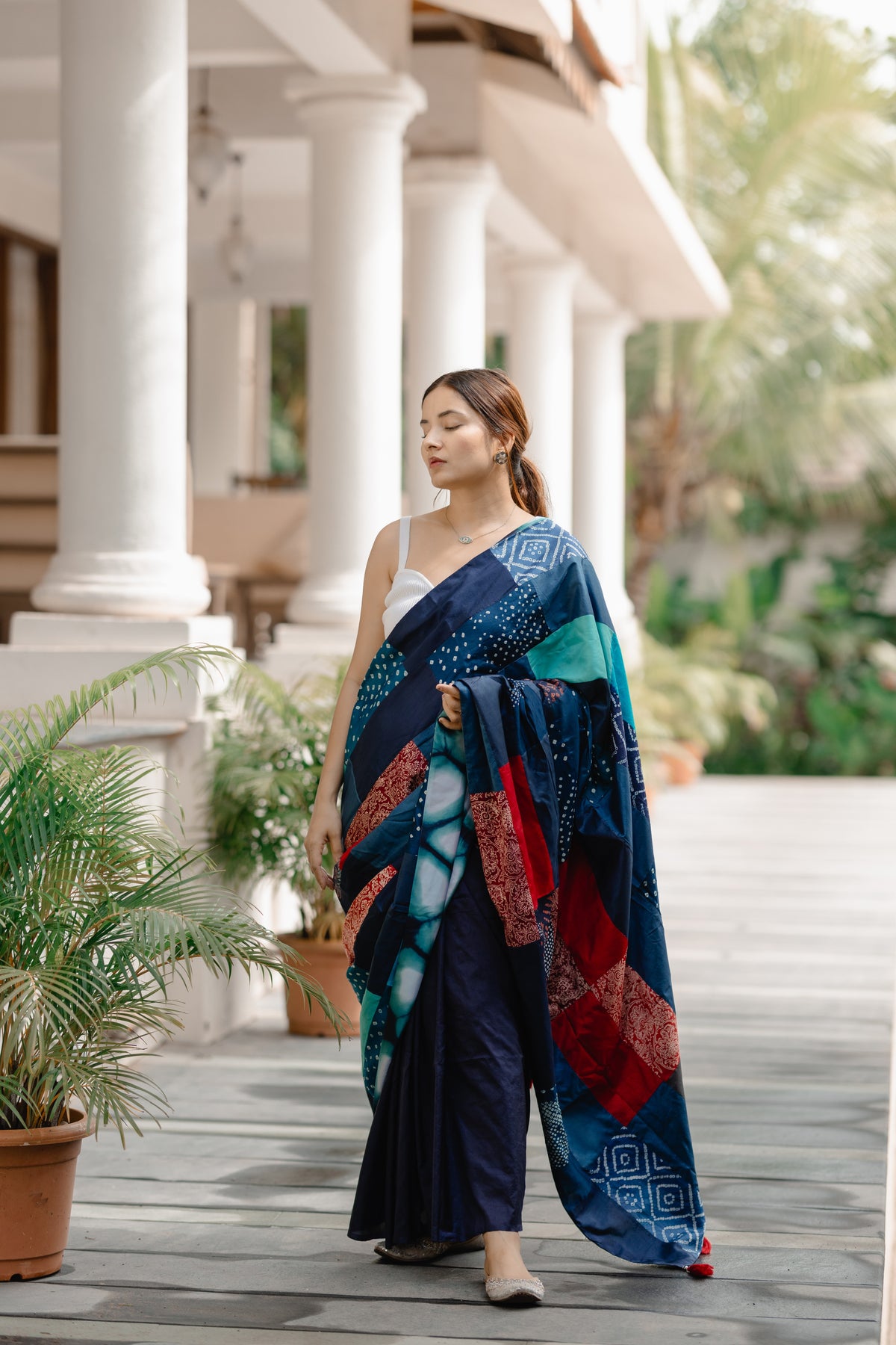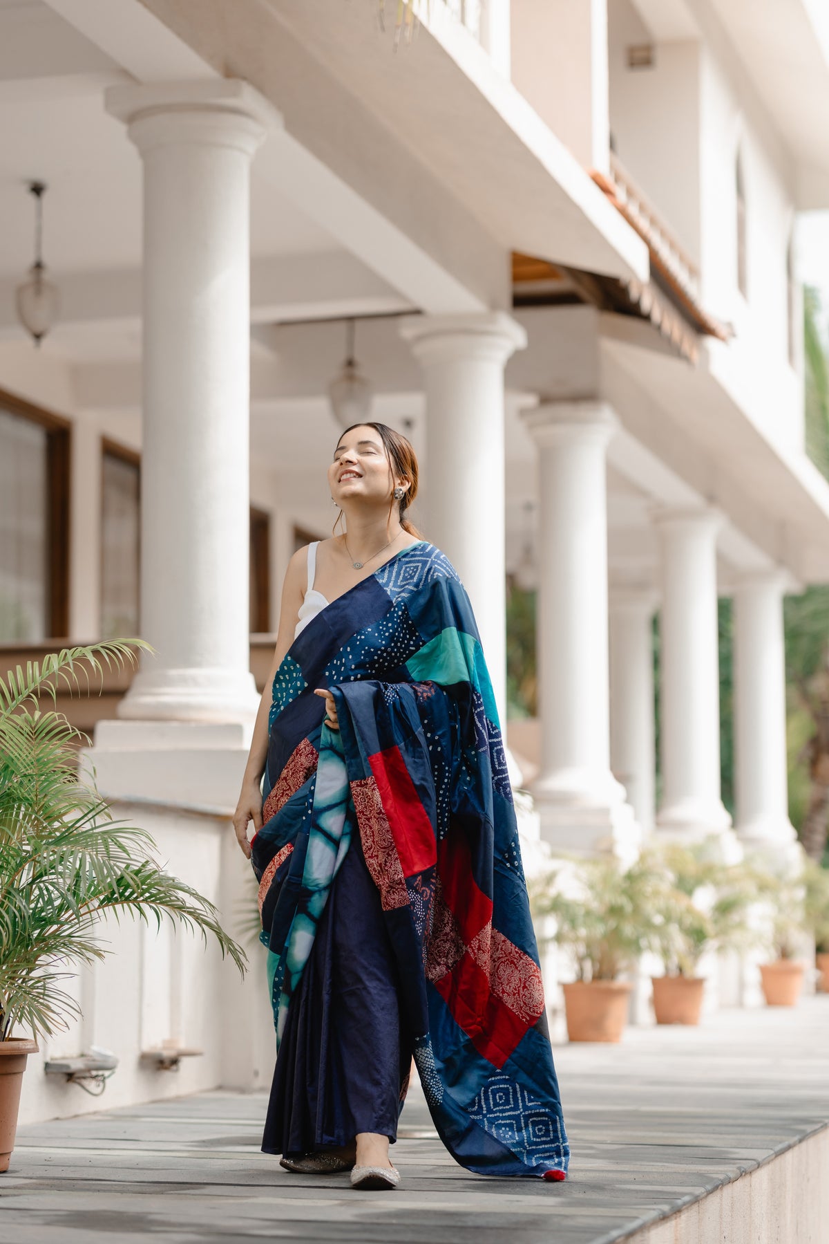 BLUE BARAADOZI PATCHWORK REVERSIBLE SILK SAREE
