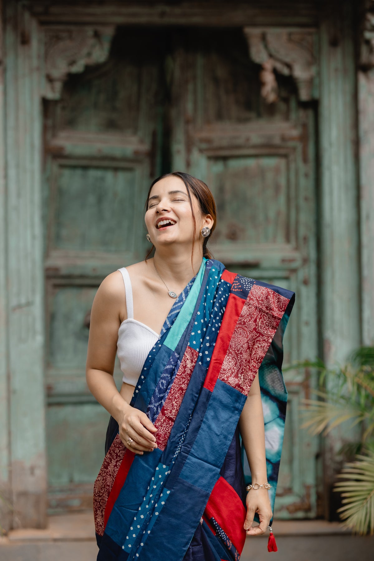 Neelgar's Patchwork Saree from the "Baradozi Collection" combines various fabric techniques to create a reversible masterpiece that can be worn on both sides, adding convenience to your wardrobe. Each saree is uniquely crafted with different patches, ensuring no two pieces are alike. It is made of pure silk and is super light, in addition to layers of fabric.