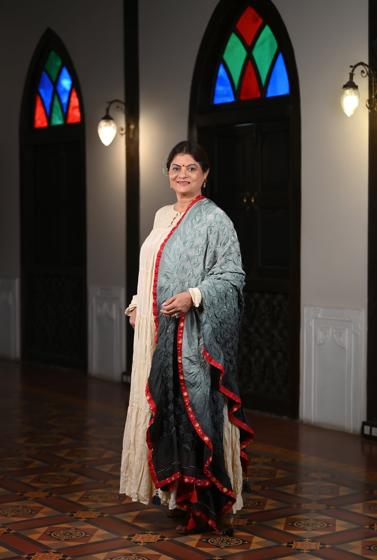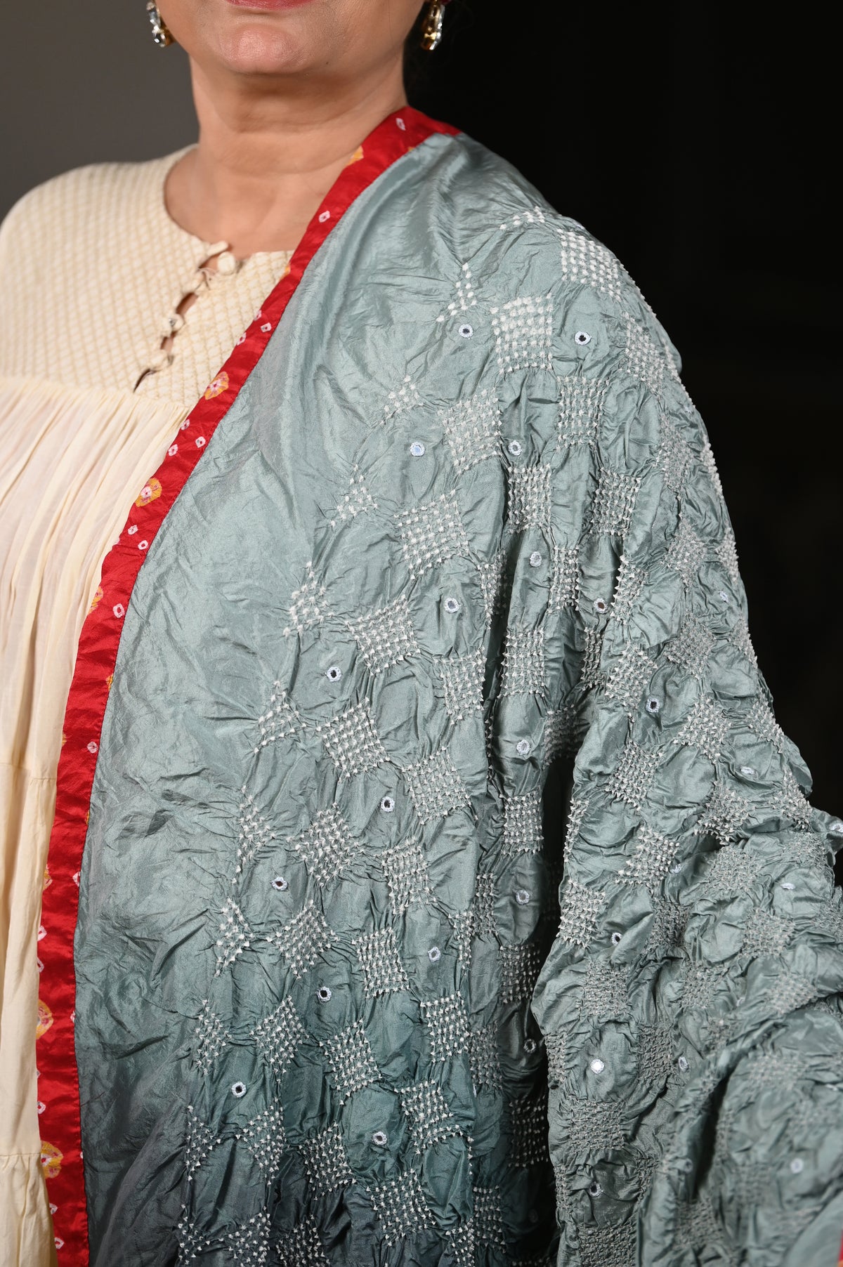 GREY-BLACK S3 DIAMOND BANDHANI SILK DUPATTA WITH MIRROR WORK AND SILK BORDER