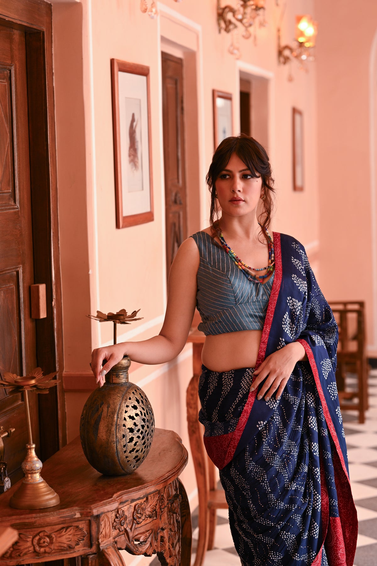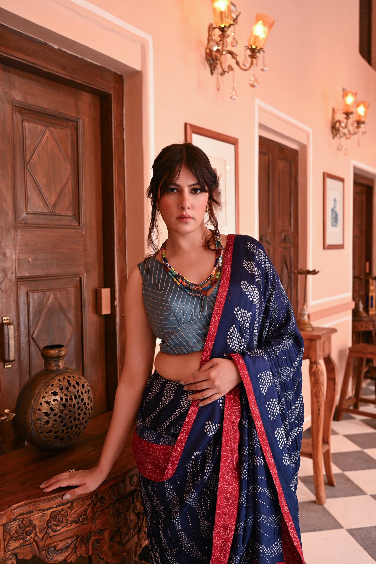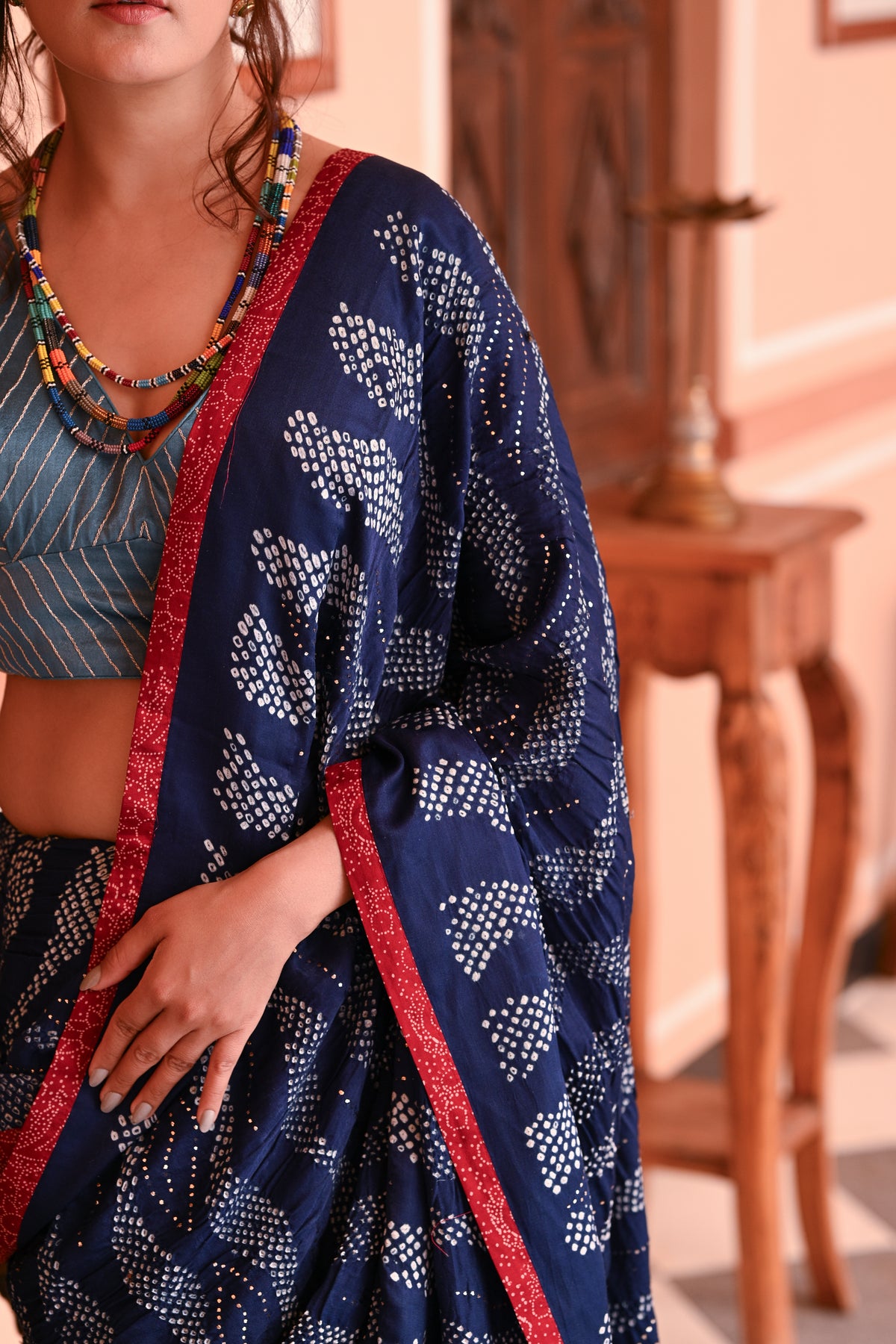 The blouse used on the model is not inclusive; a bandhani silk blouse is included with the saree.