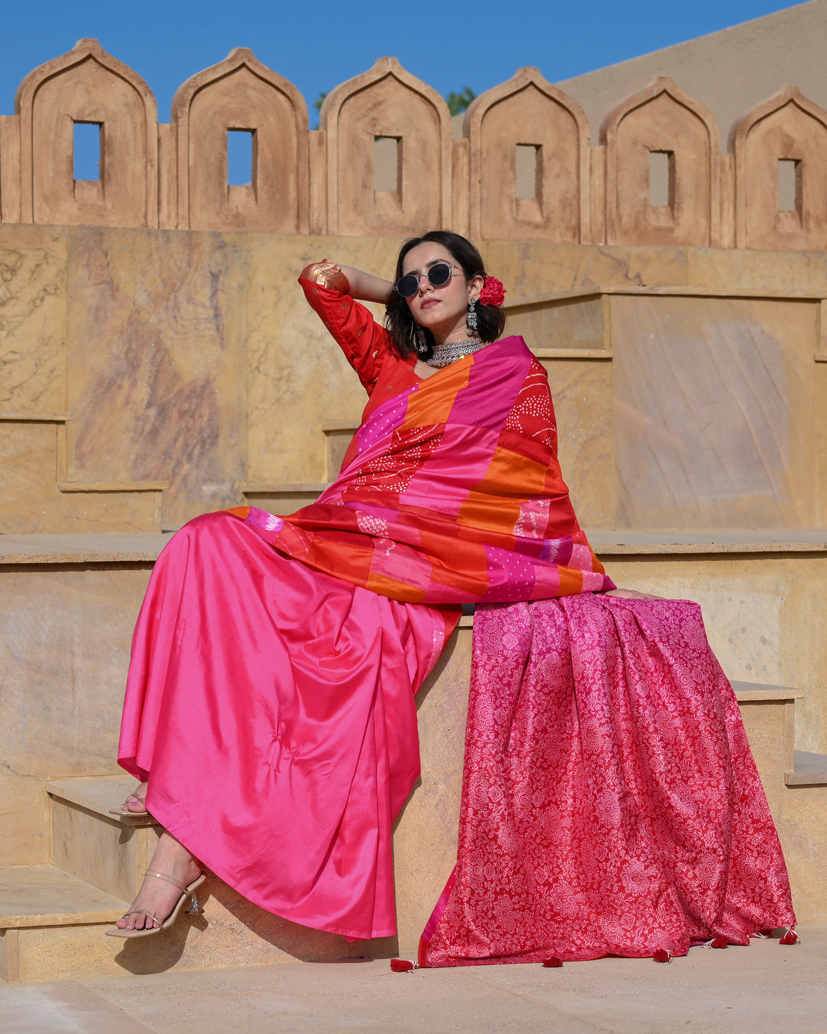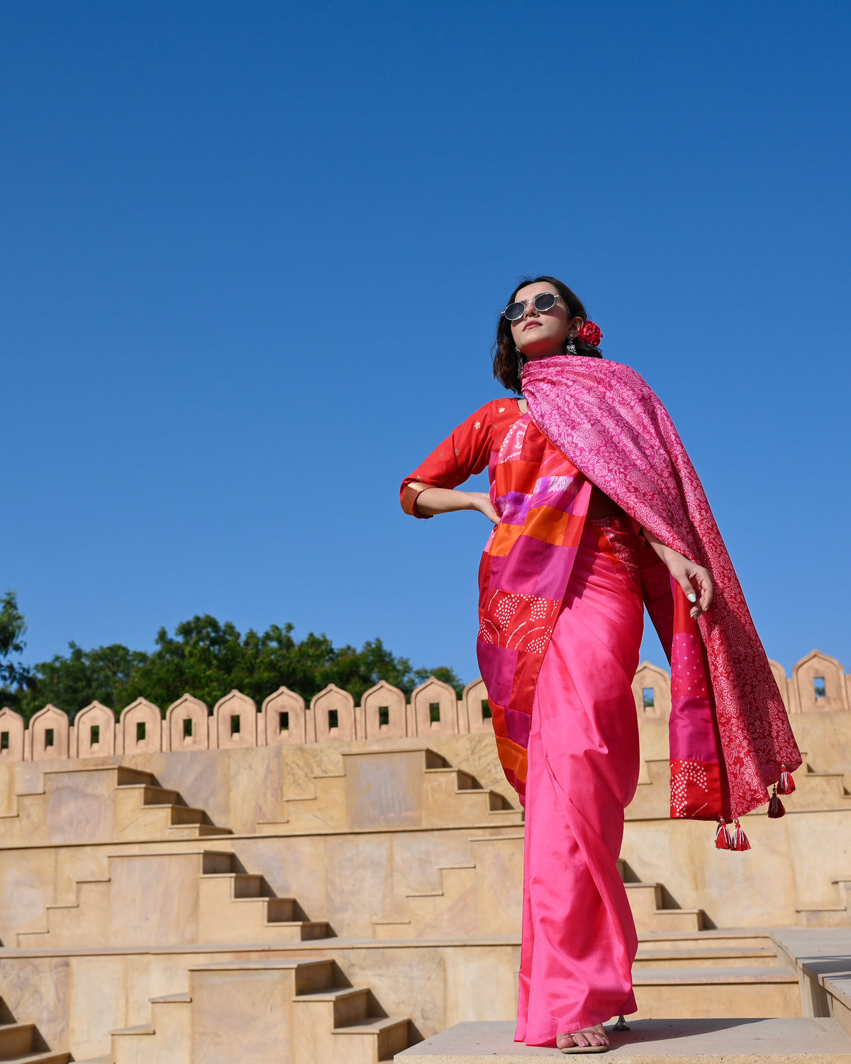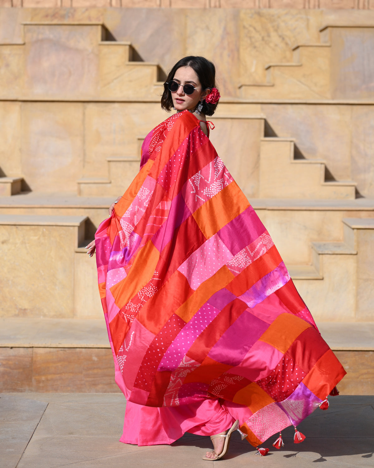 Our Reversible Patchwork Bandhani Dupattas, Stoles, and Sarees embody the perfect blend of tradition and versatility. Each piece is thoughtfully designed with two distinct sides, allowing you to easily switch between styles. On one side, you'll find an intricate patchwork of fabrics, each carefully stitched together to form a unique mosaic of textures and patterns. The reverse side features a classic bandhani design or a striking block print and wavy leheriya offering a contrasting yet complementary look. This dual design allows you to choose between a bold, artisanal appearance or a more understated, refined elegance. Each piece in this collection is a one-of-a-kind creation, with patches that share a consistent color theme but vary in design, ensuring that no two items are exactly alike. Perfect for any occasion, they are a statement of style, tradition, and individuality, adapting effortlessly to your mood and wardrobe needs.