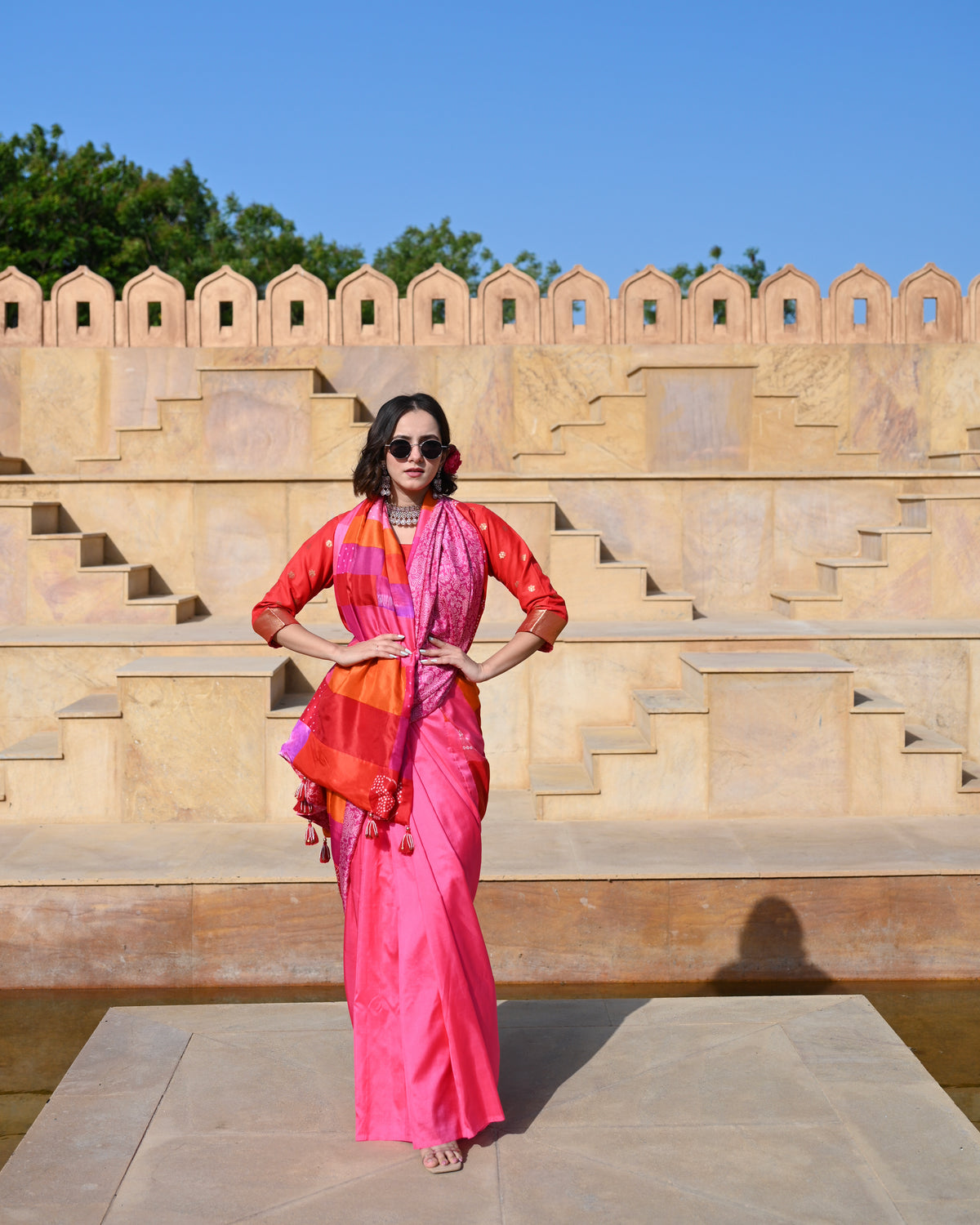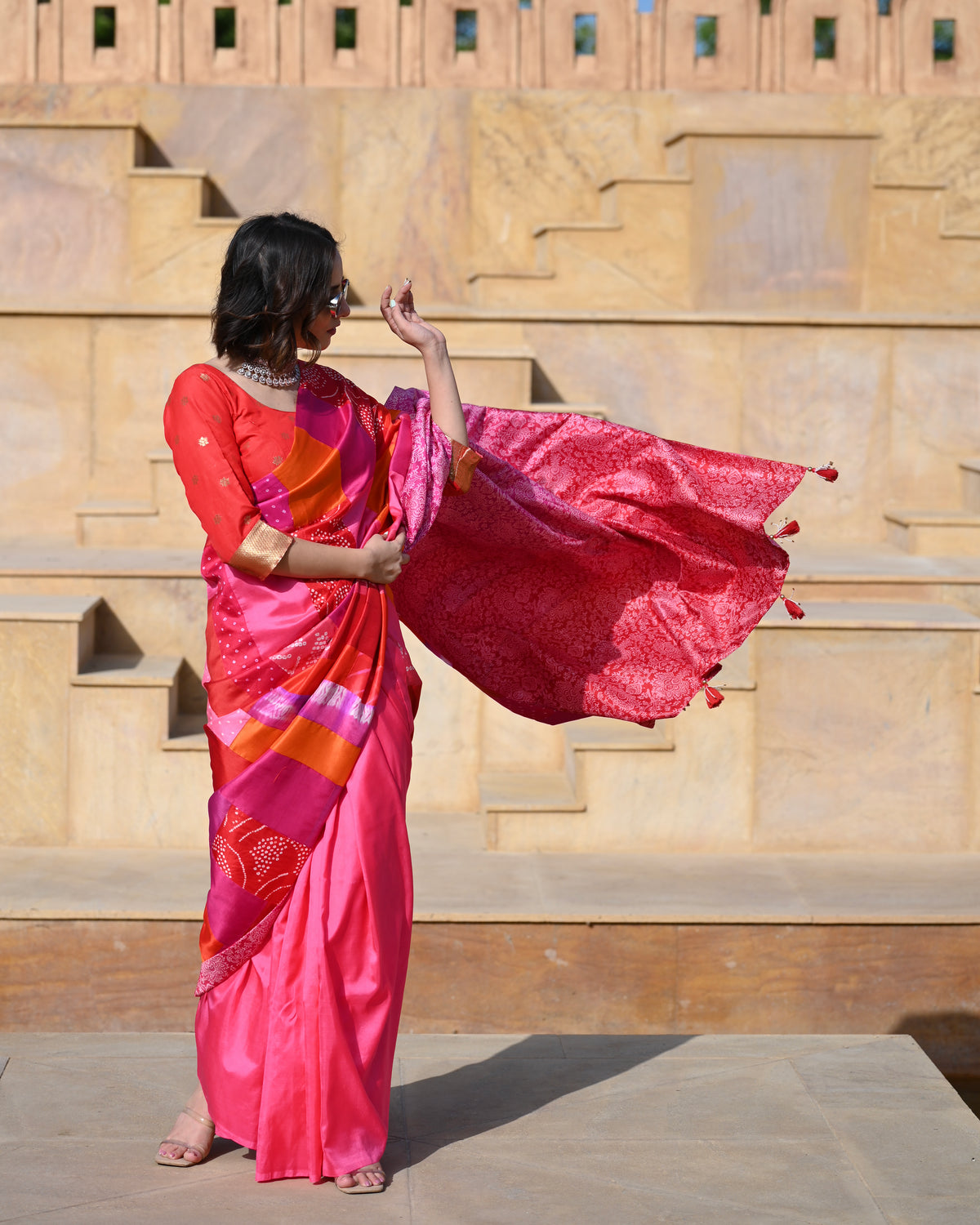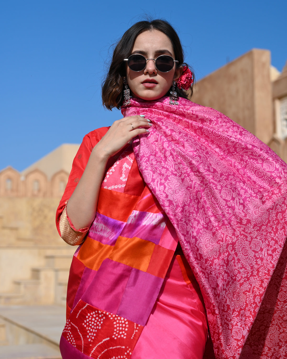 RED-PINK BAARADOZI PATCHWORK REVERSIBLE SILK SAREE