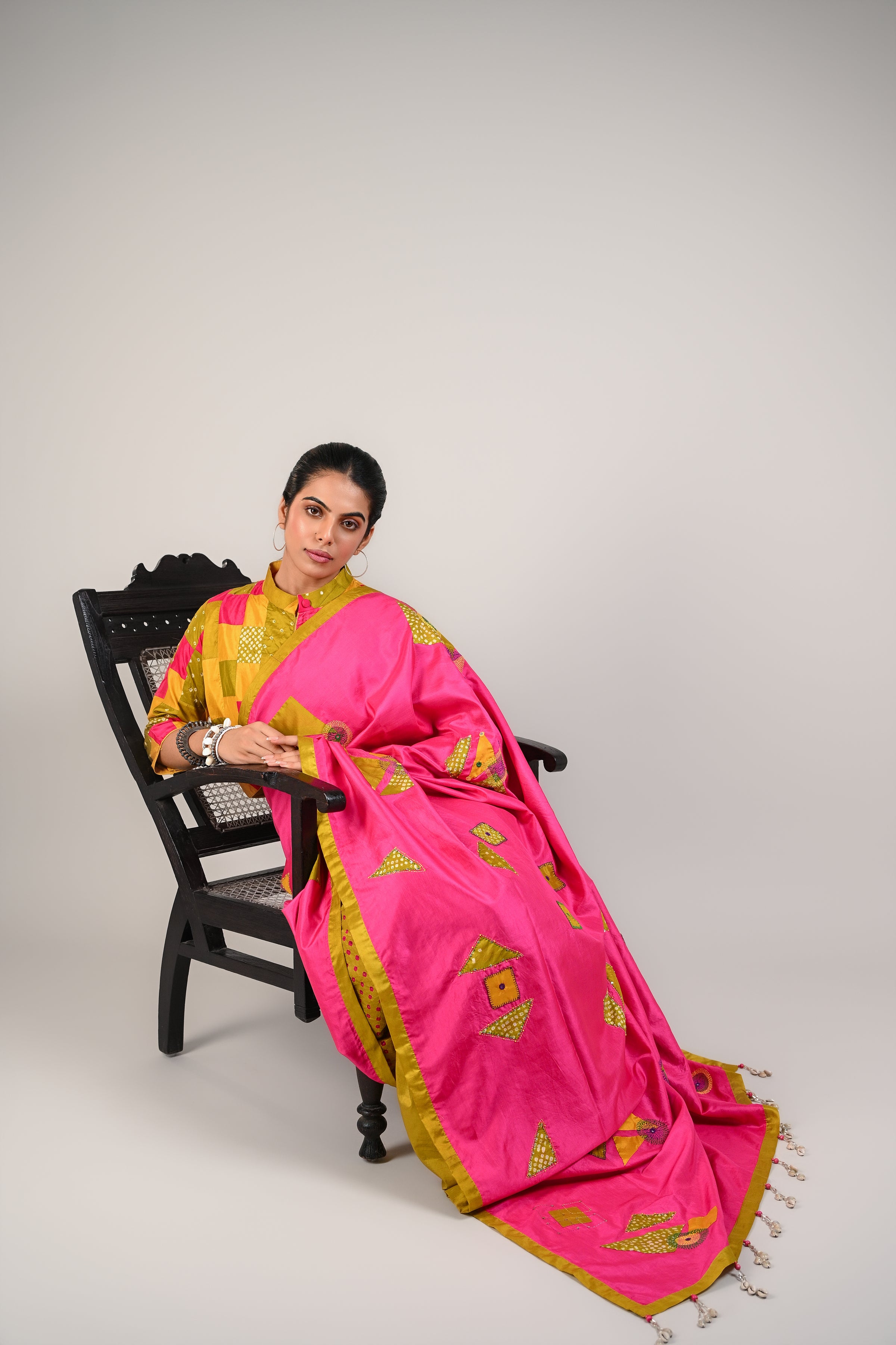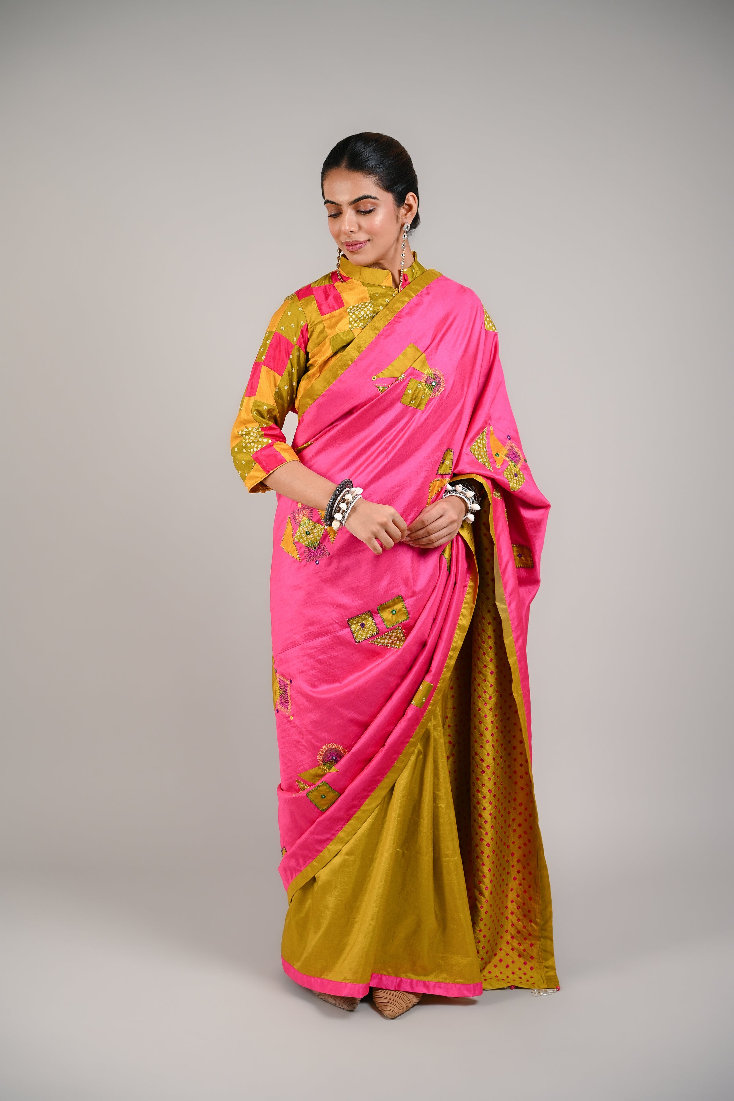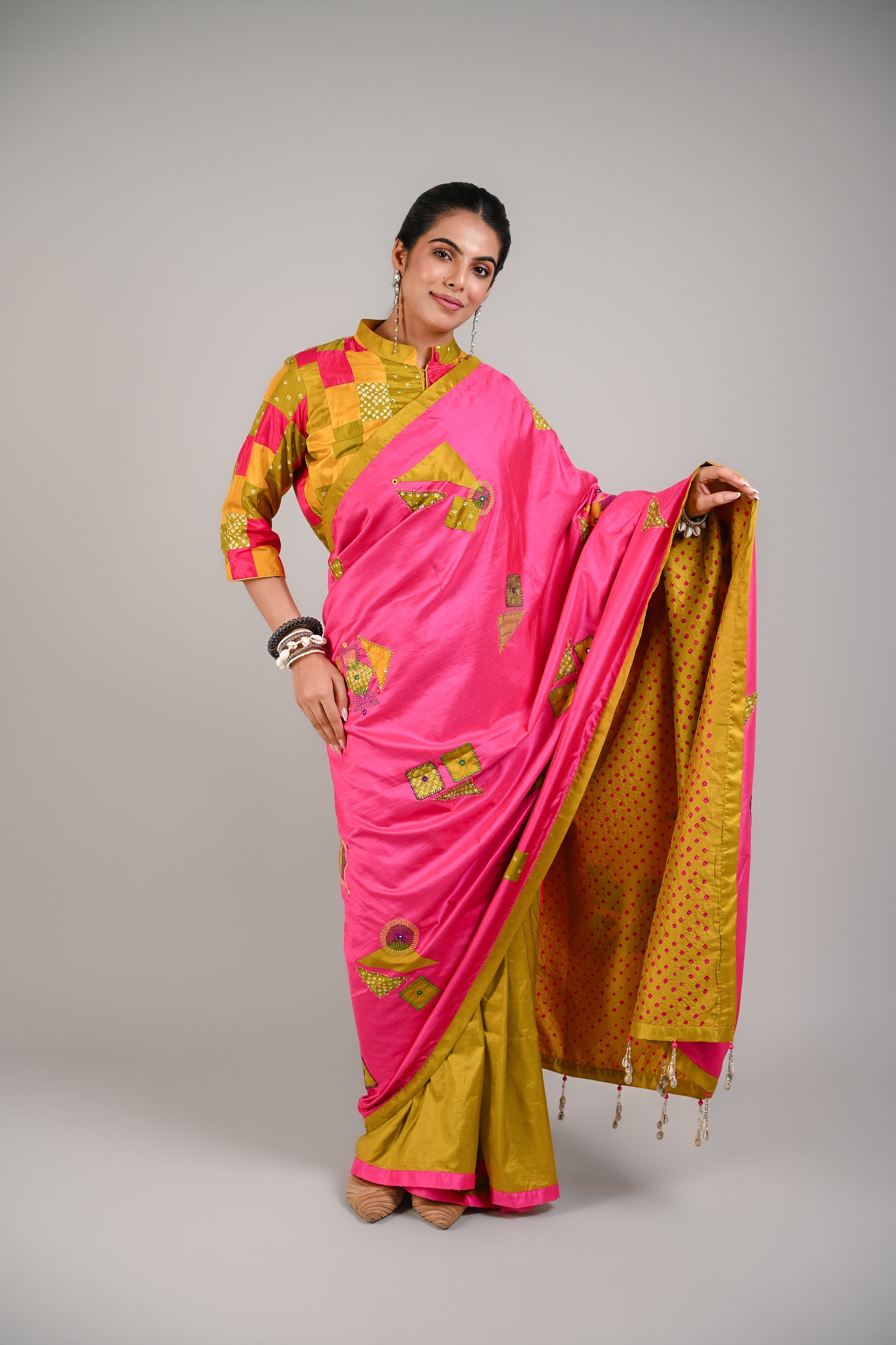 PINK - MUSTARD YELLOW WABI SABI REVERSIBLE EMBROIDERED SAREE