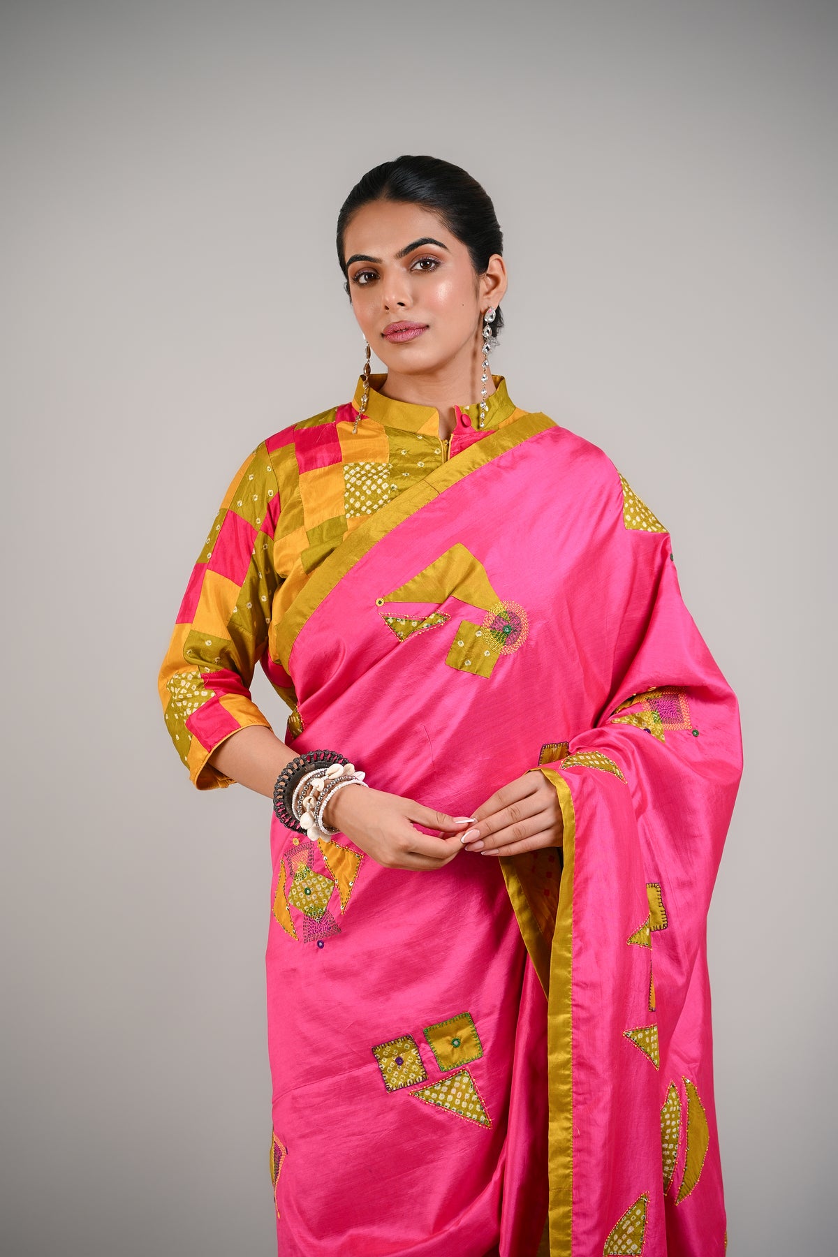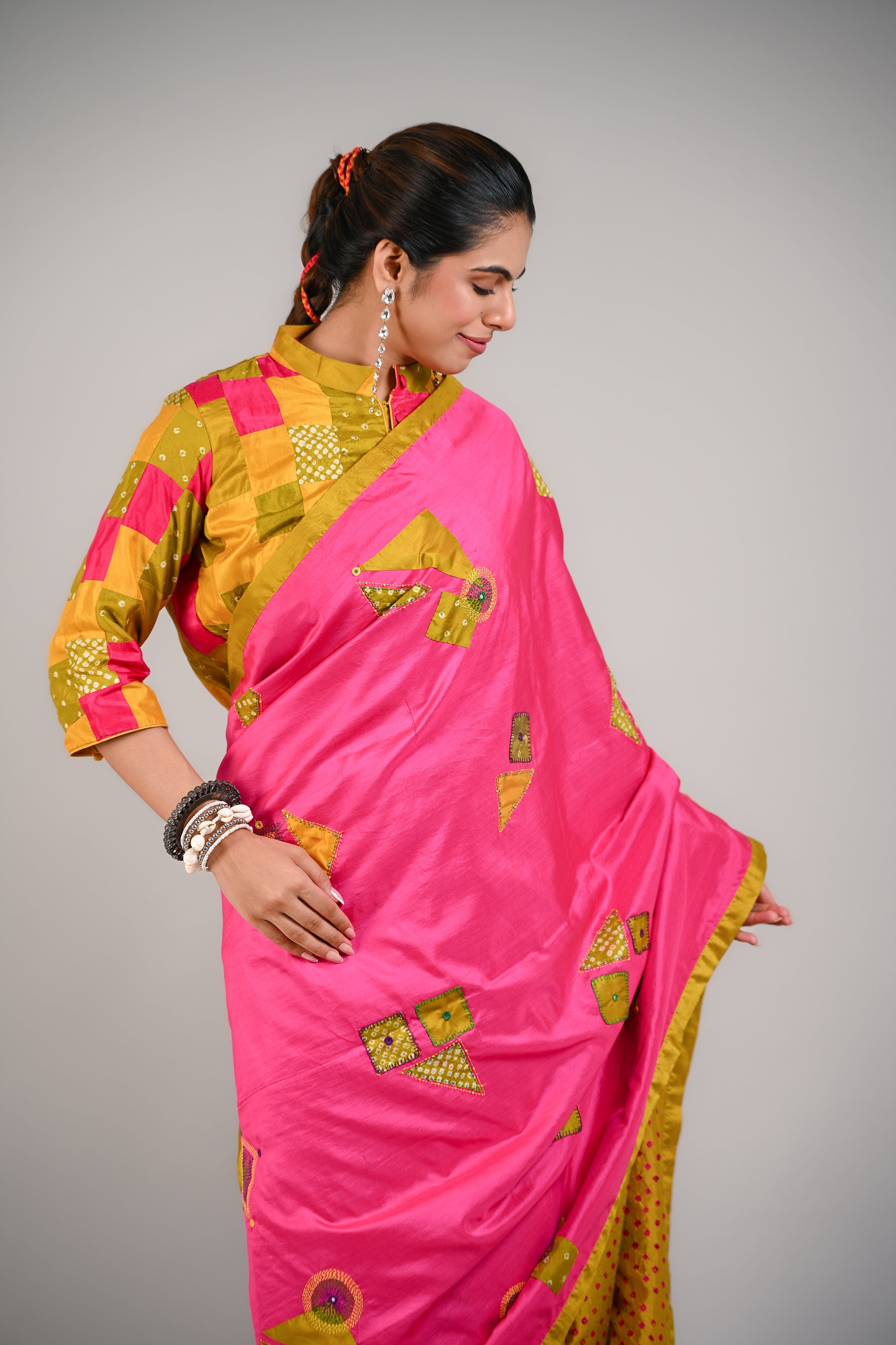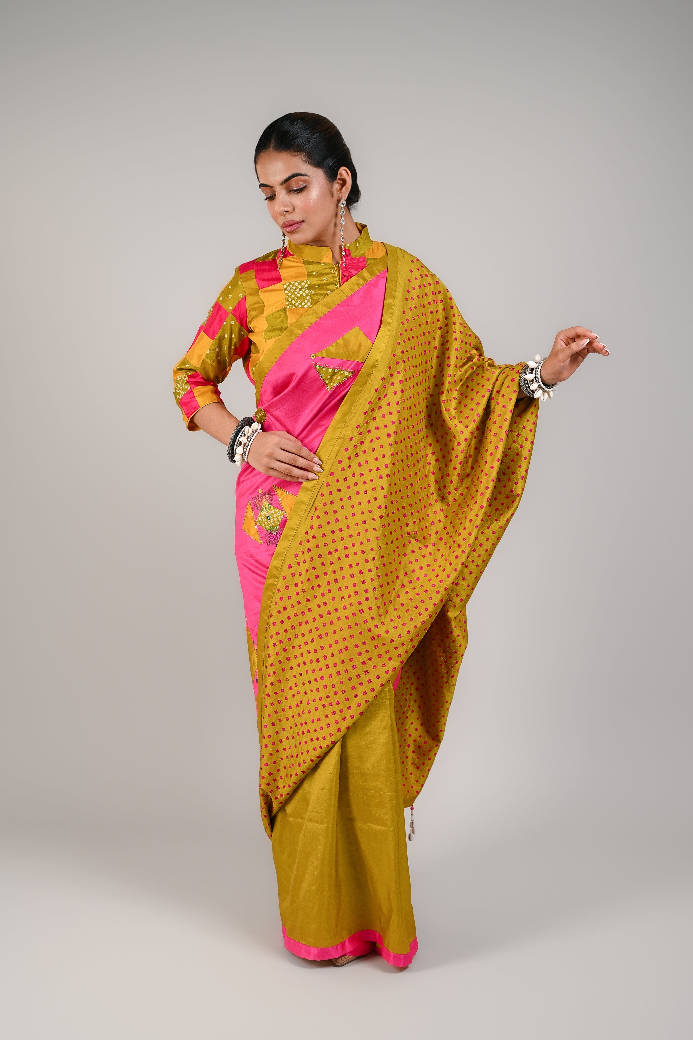 The blouse worn by the model is for styling only. A Bandhani silk blouse is included with the saree.
