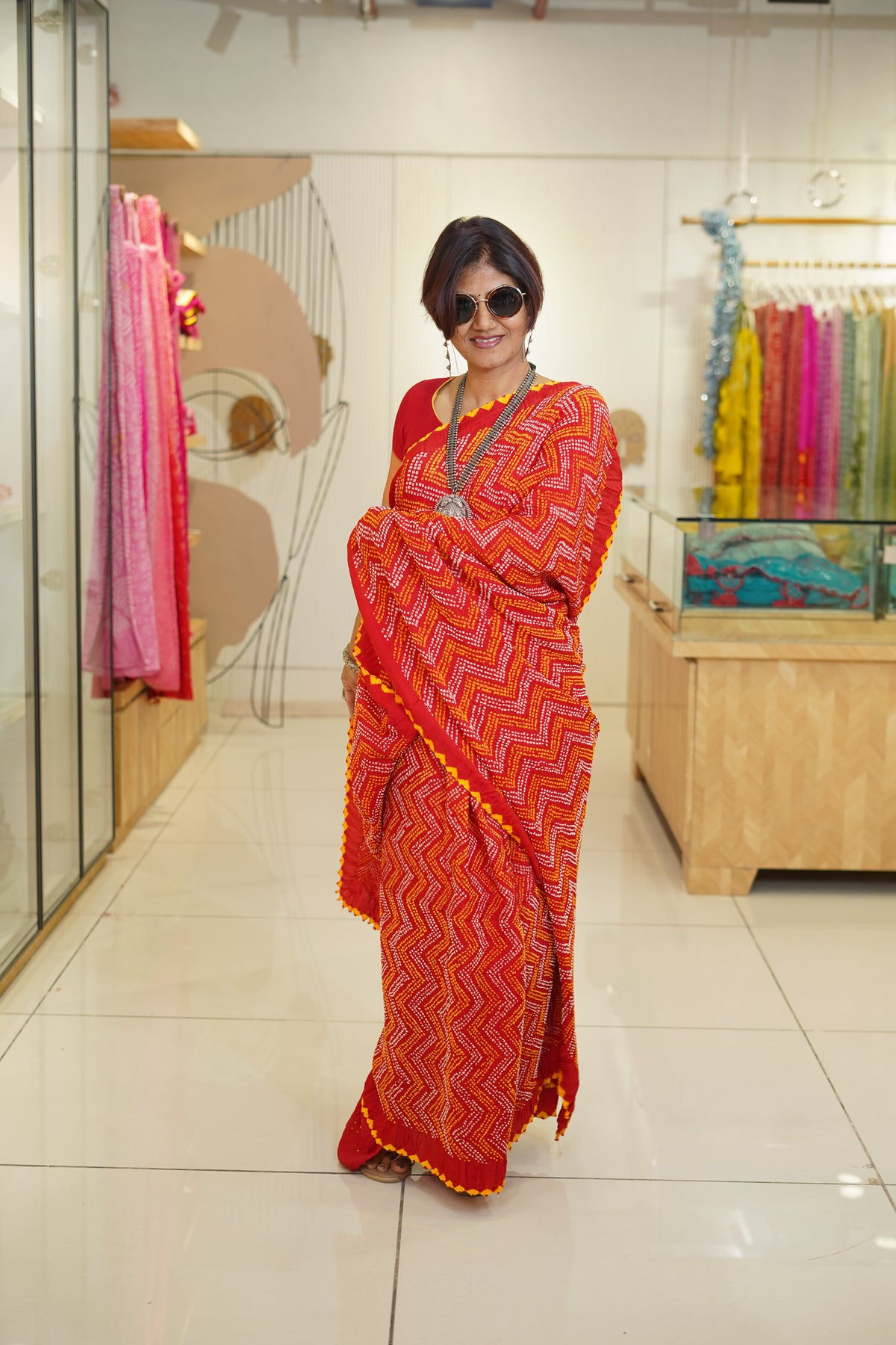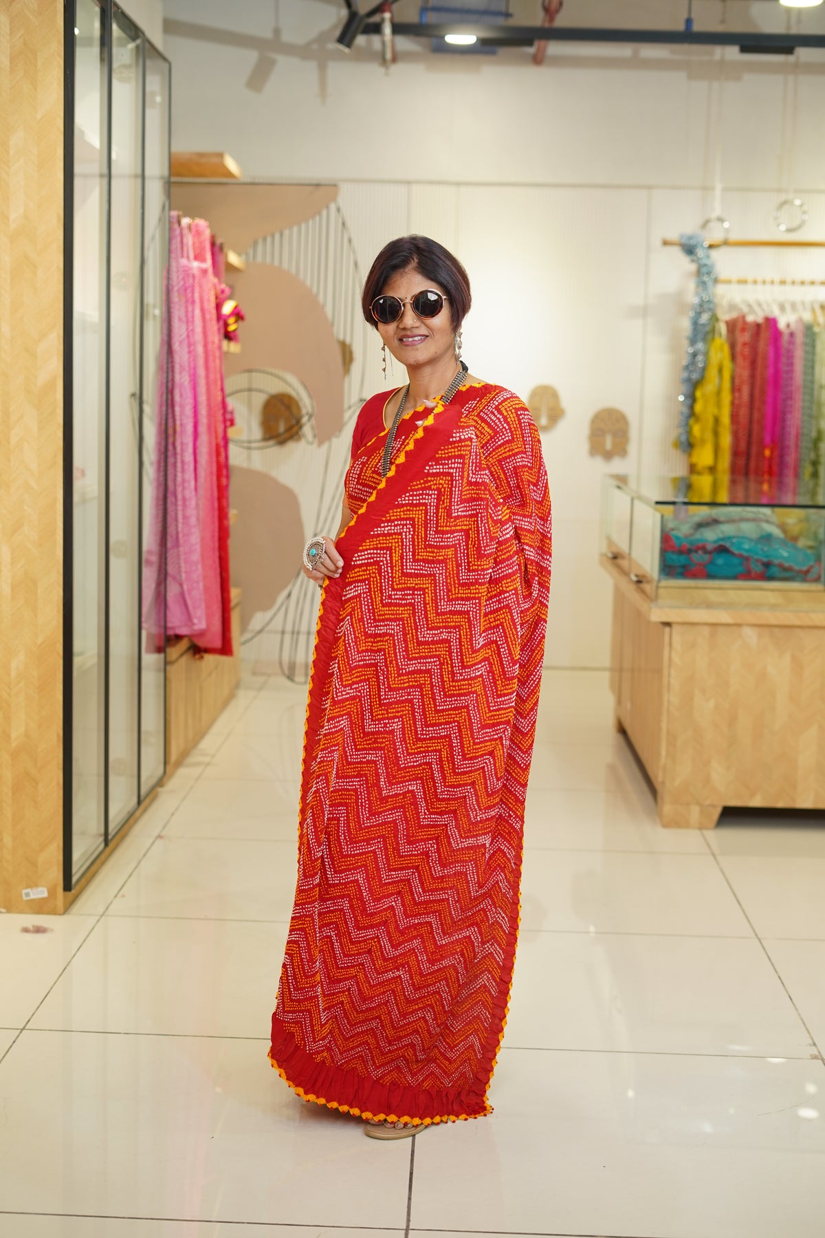 RED O3 CHEVRON SILK BANDHANI SAREE