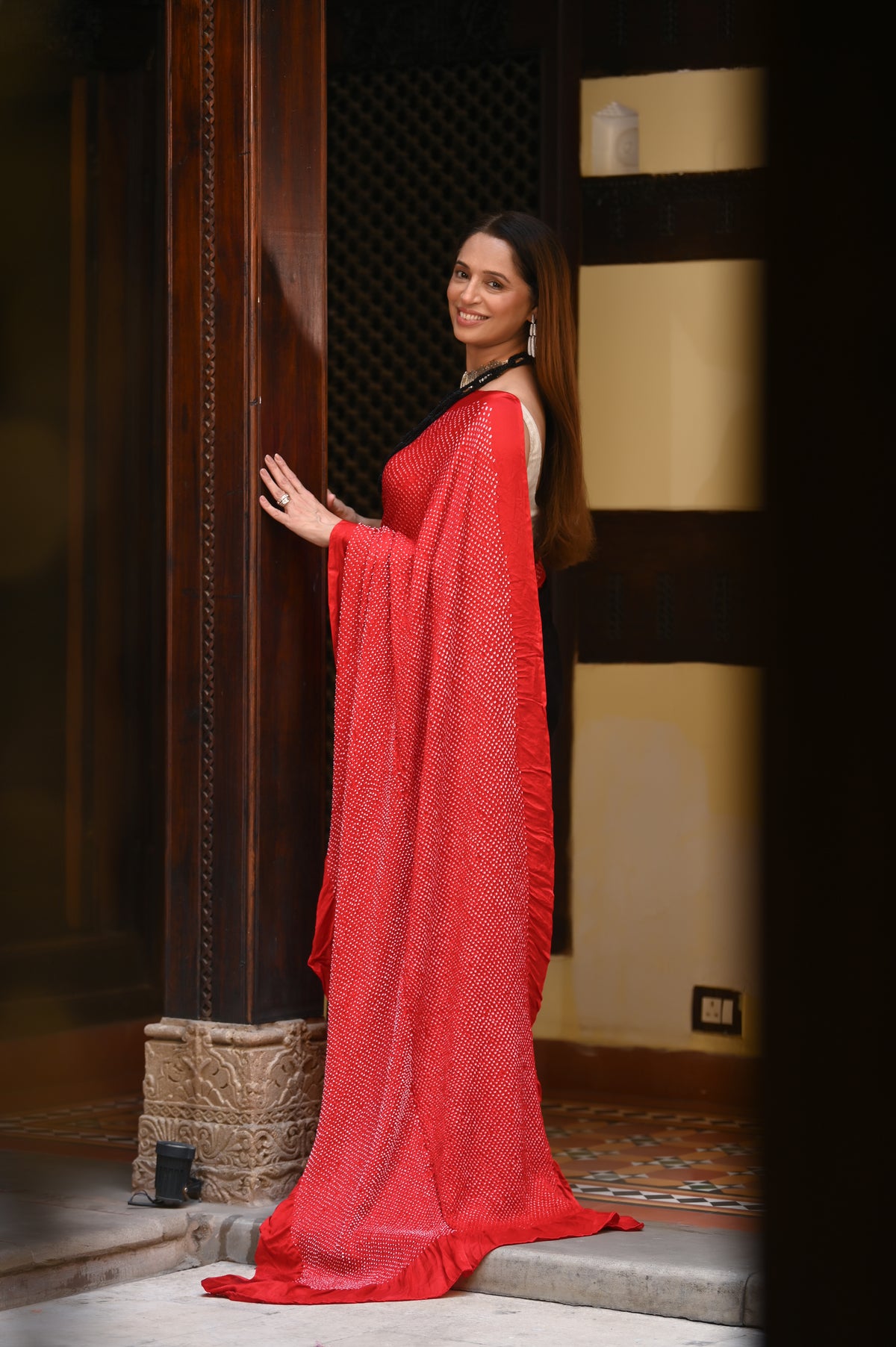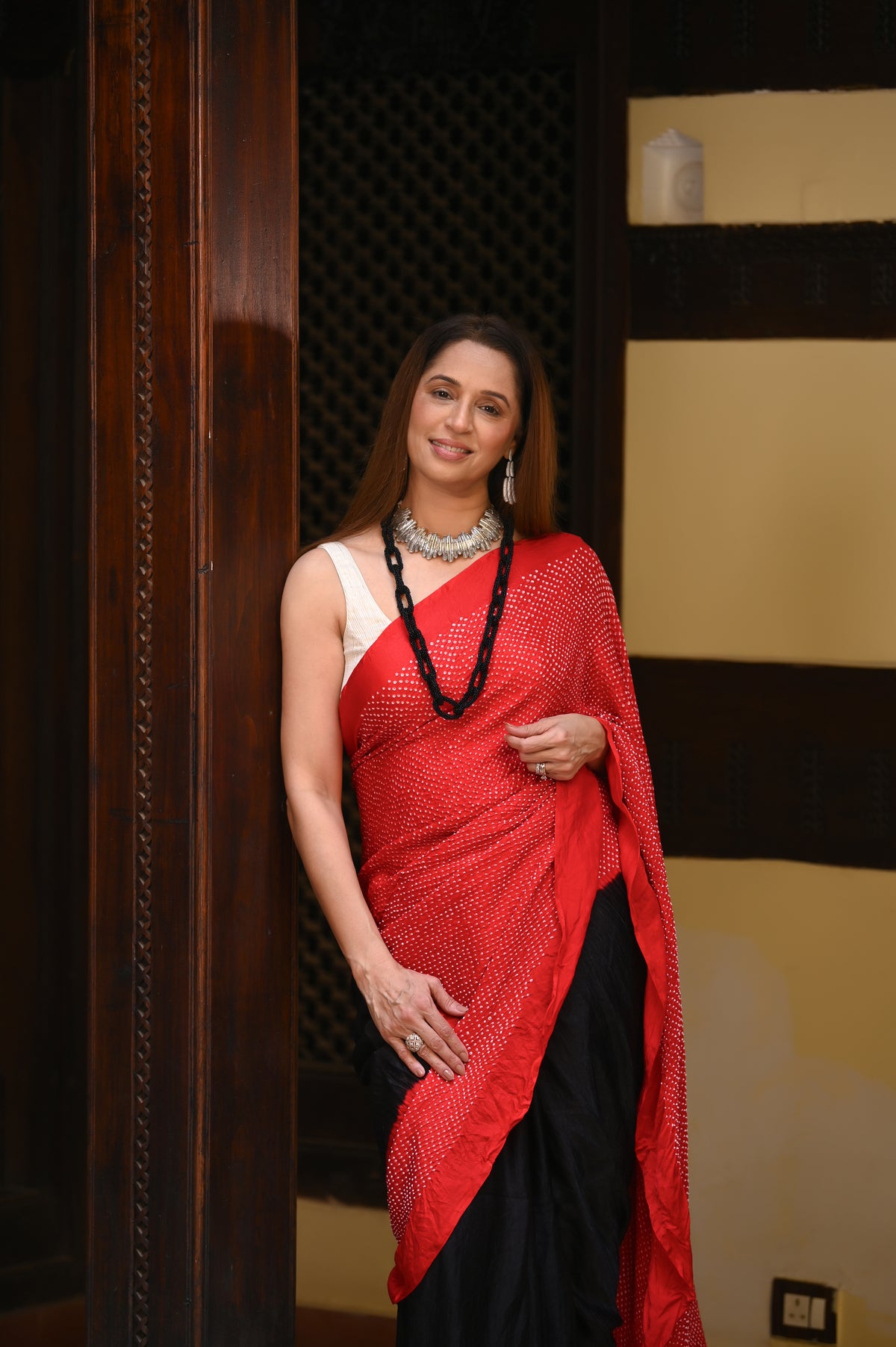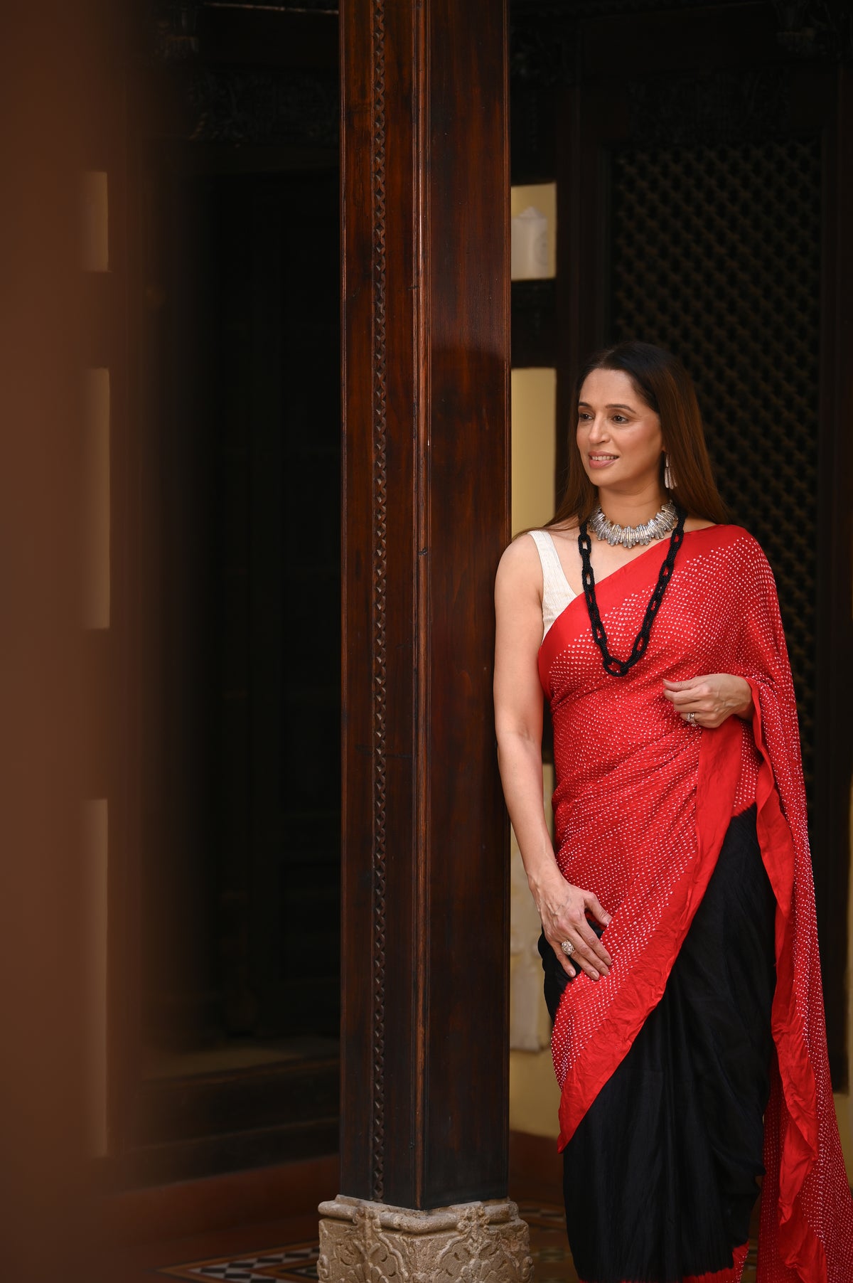 RED-BLACK YIN-YANG HALF FULL HALF EMPTY ETERNAL DOT BANDHANI SILK SAREE