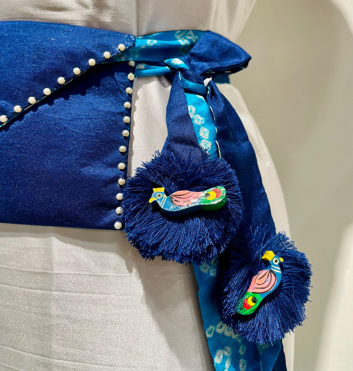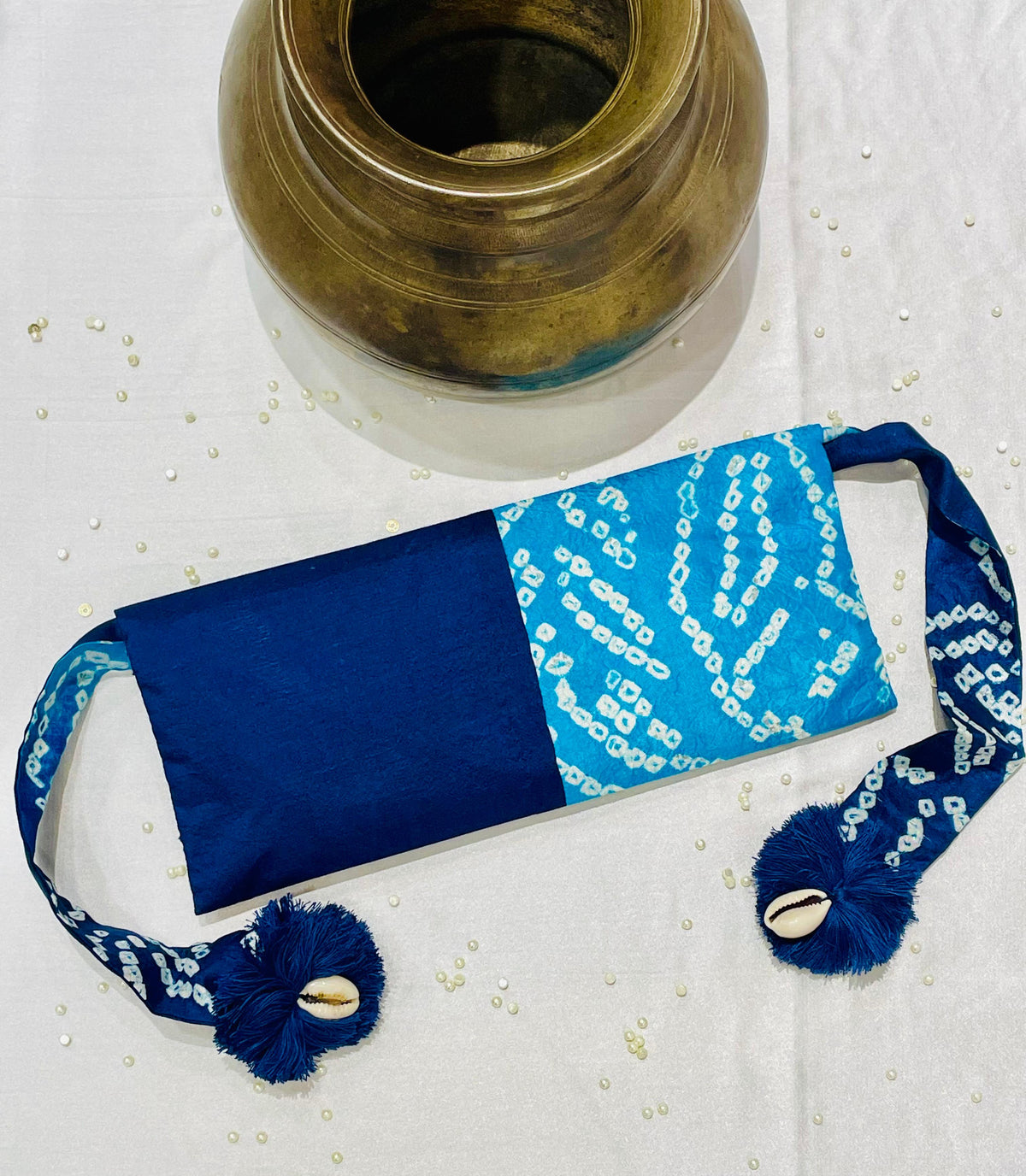LIGHT BLUE - INDIGO BLUE SILK WAIST BAG WITH HANDMADE TASSELS AND STONEWORK