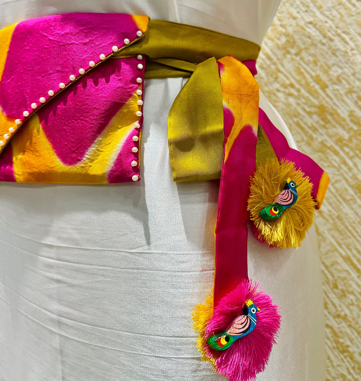 PINK-YELLOW SILK WAIST BAG WITH HANDMADE TASSELS