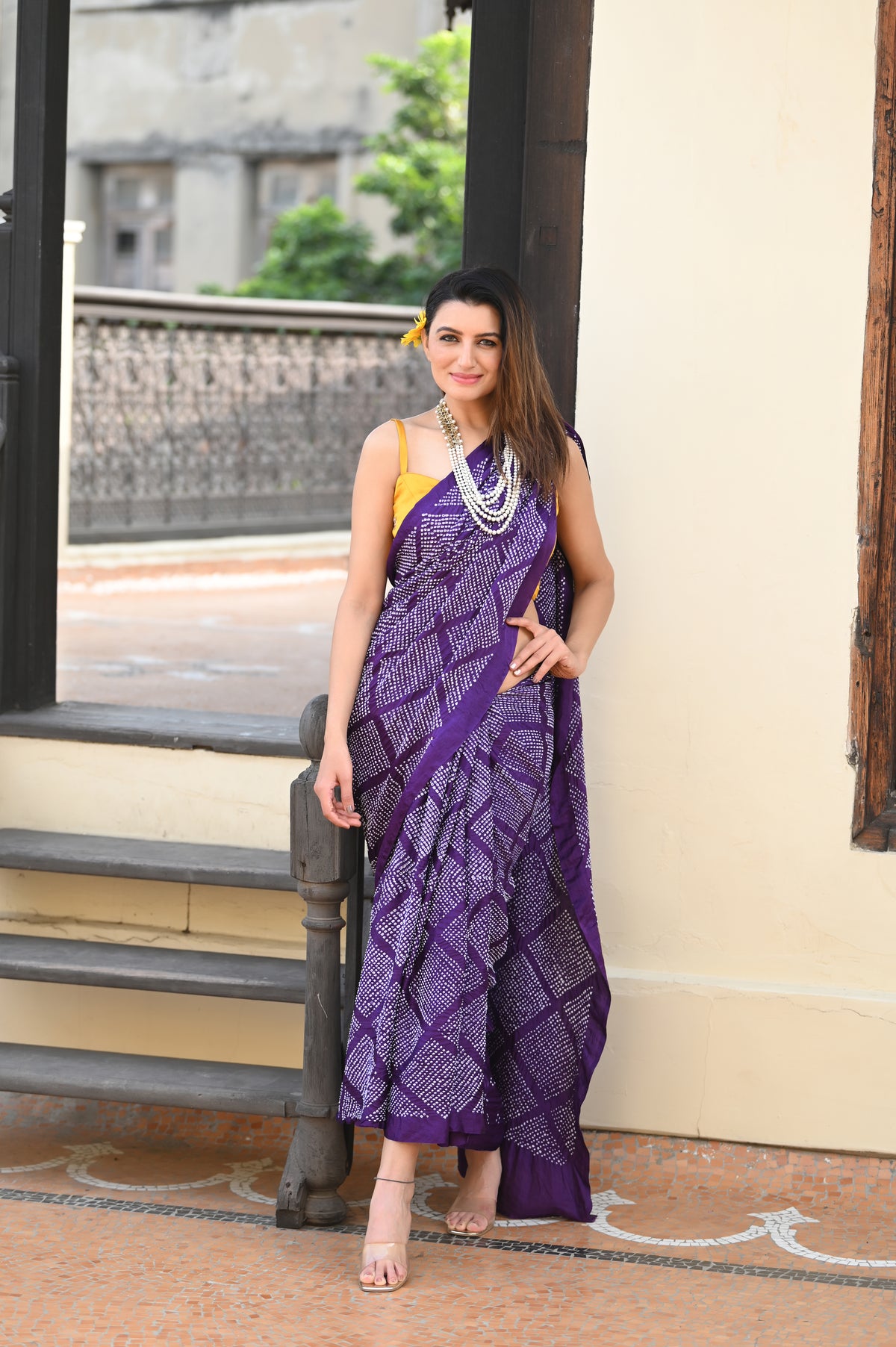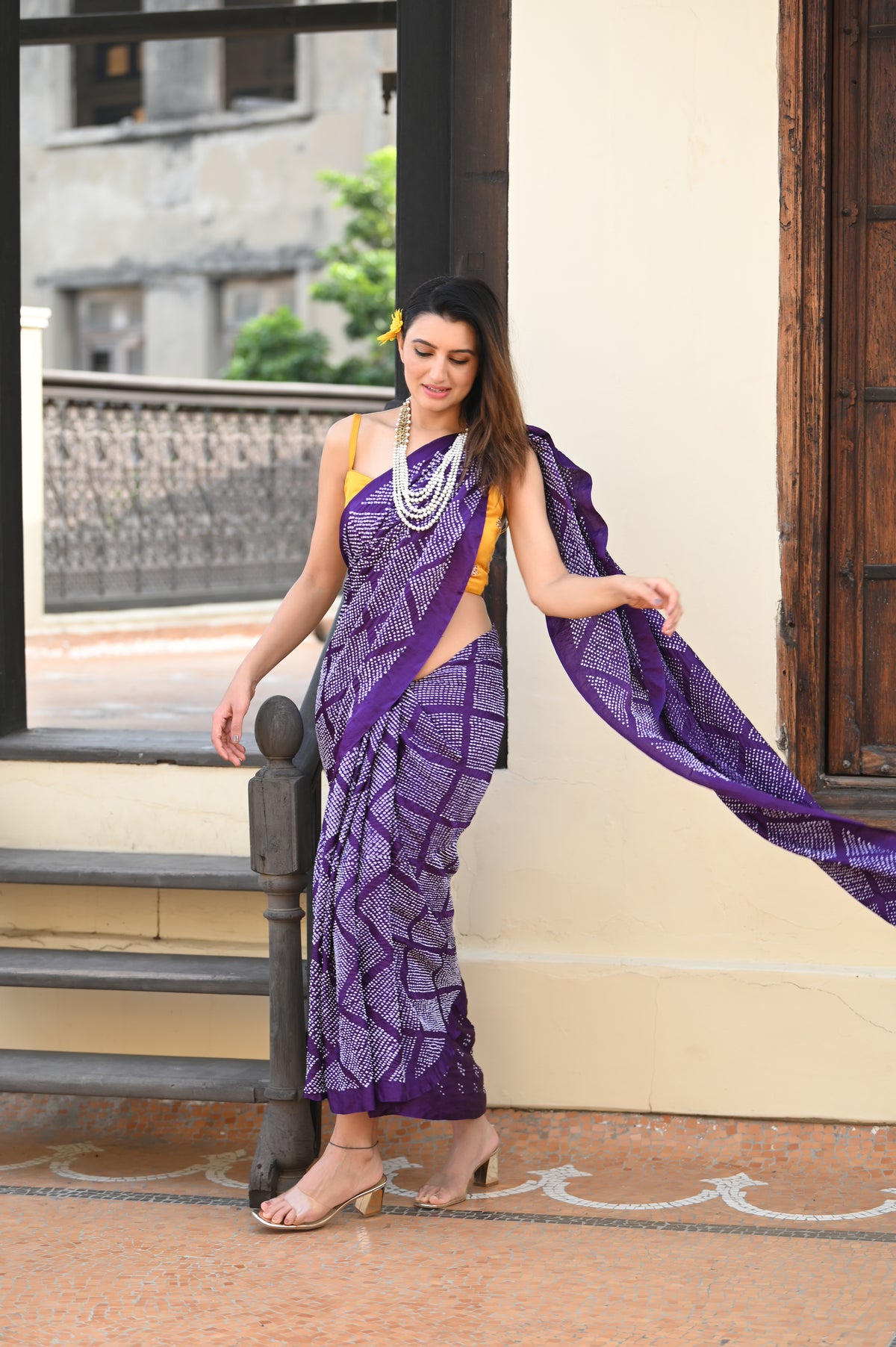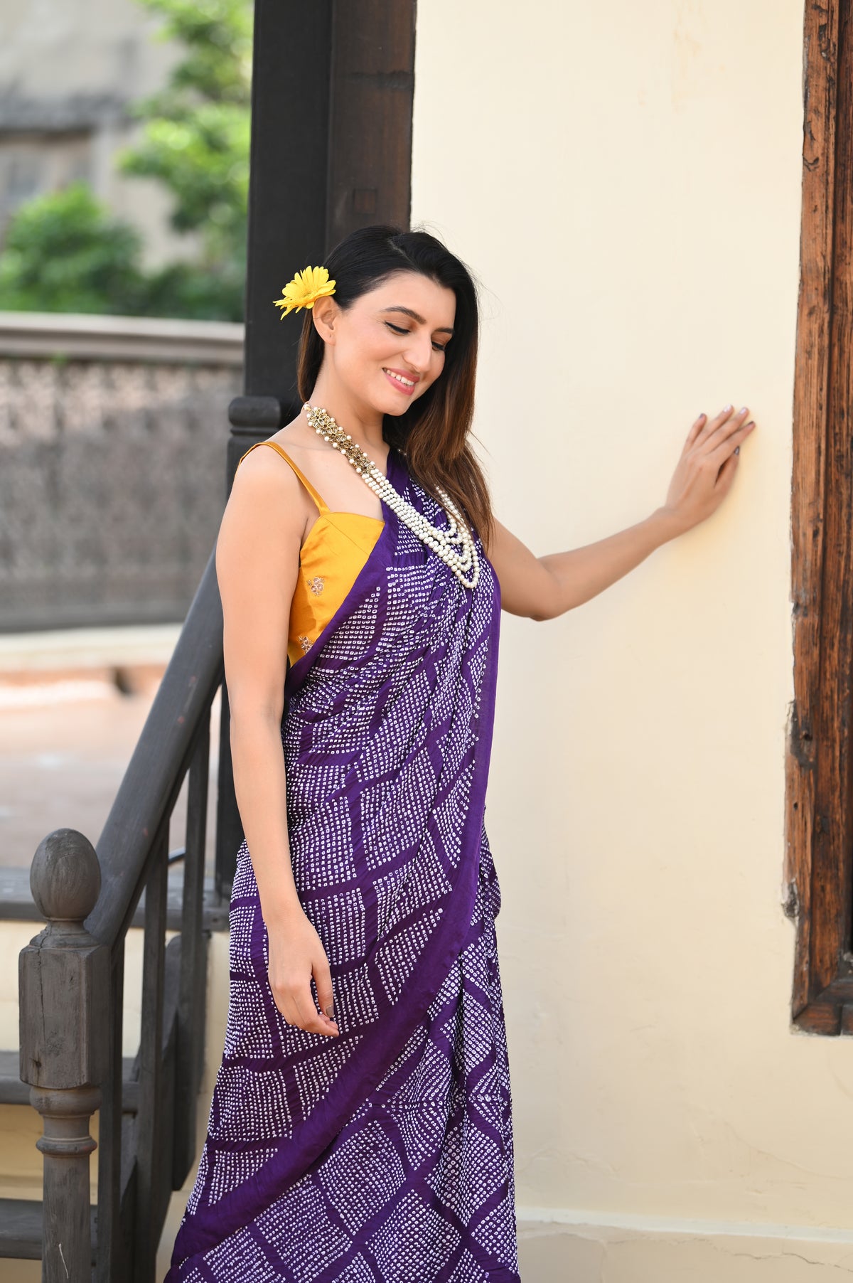 The blouse used on the model is not inclusive, a bandhani silk blouse is included with the saree.