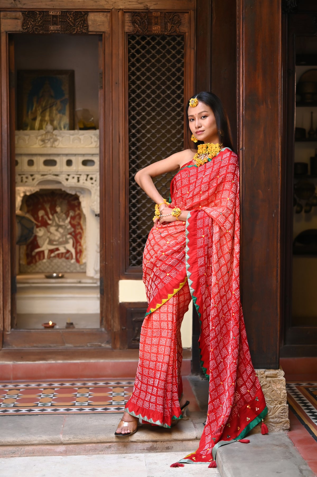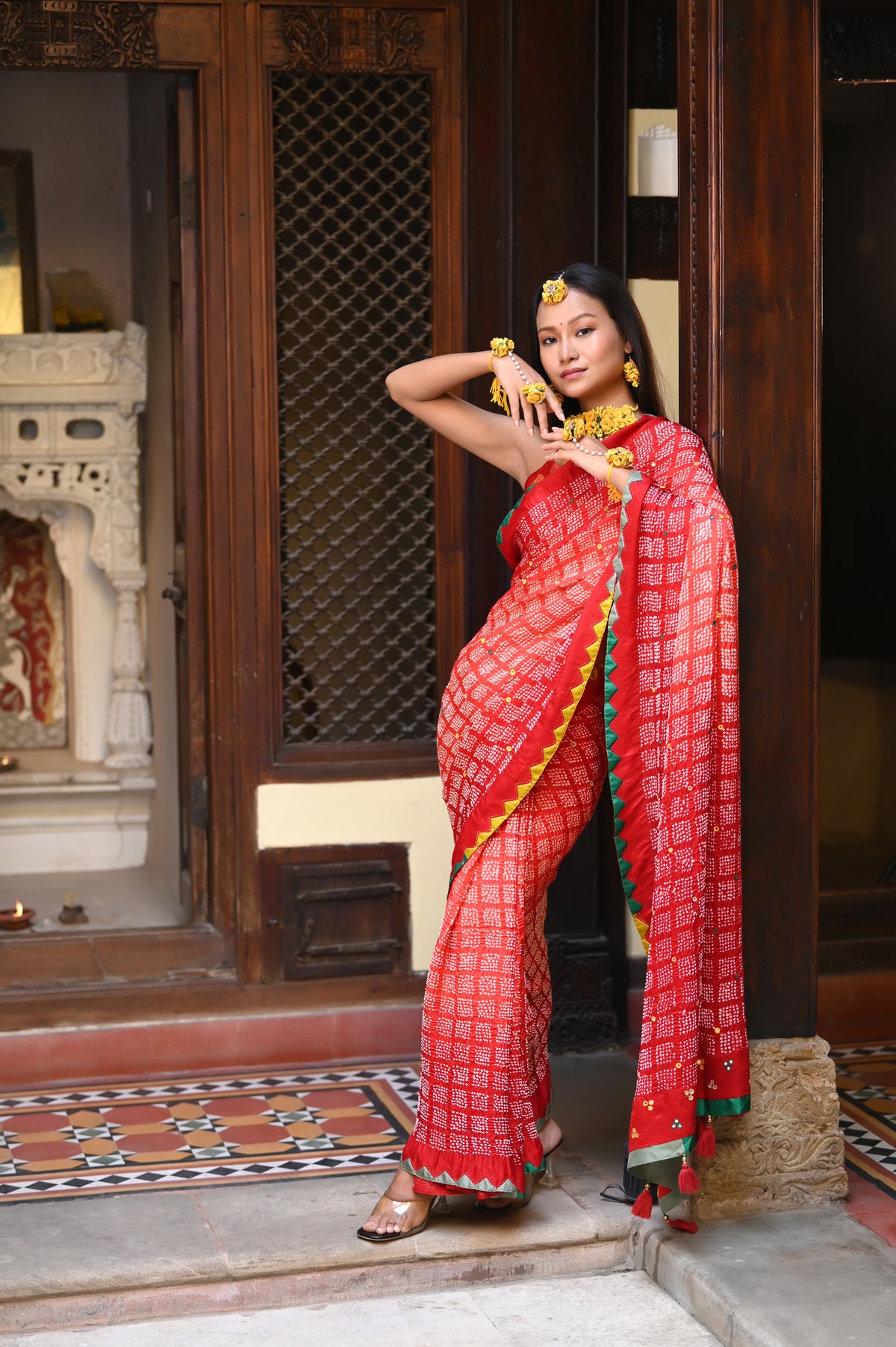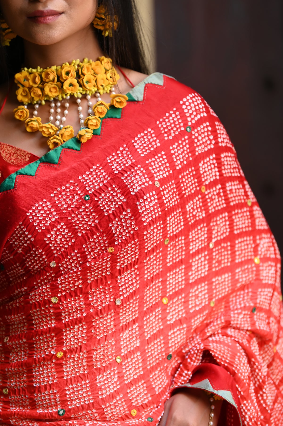 Geometric shapes redefine the traditional diamond patterns in Bandhani, creating classic and uniquely modern designs. This innovative approach offers a fresh way to wear and appreciate the timeless bandhani.