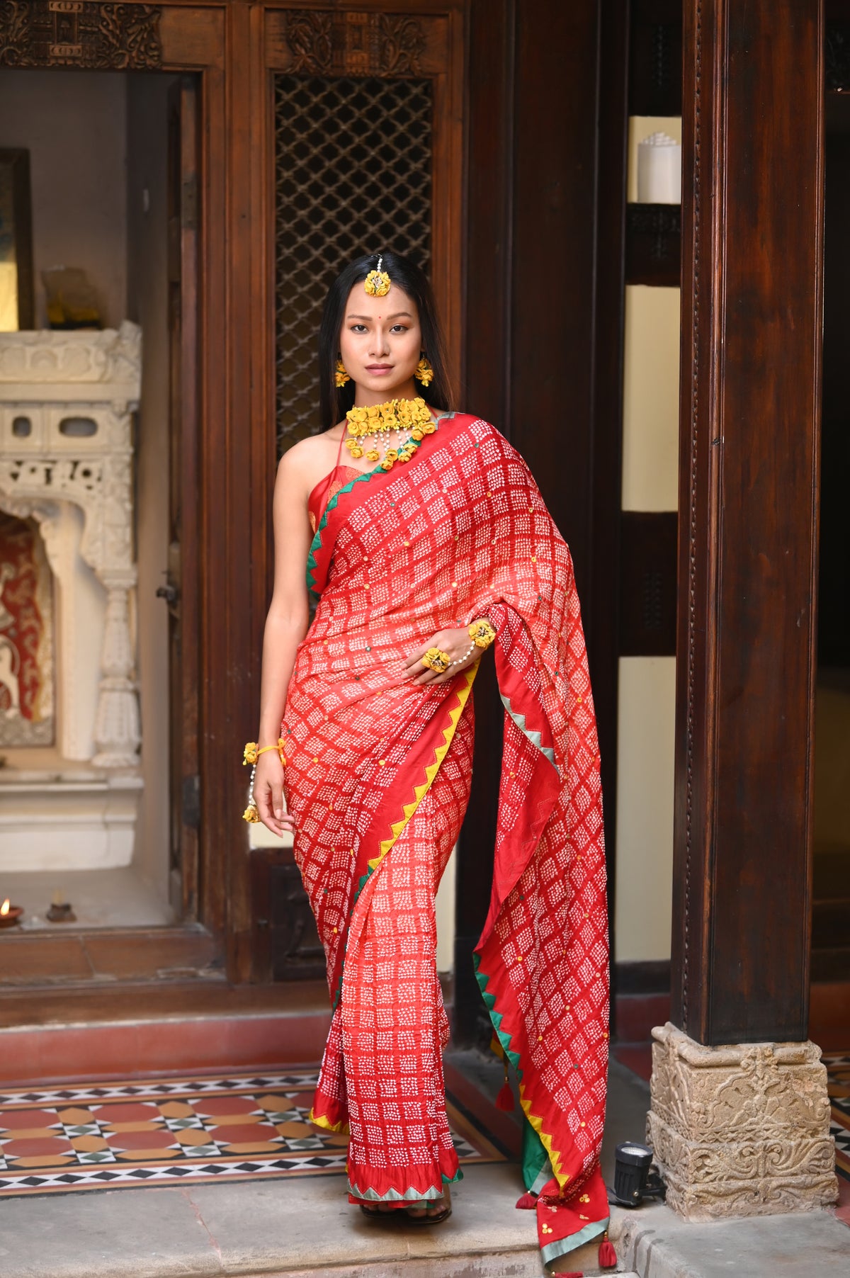 The blouse used on the model is not inclusive, a bandhani silk blouse is included with the saree.