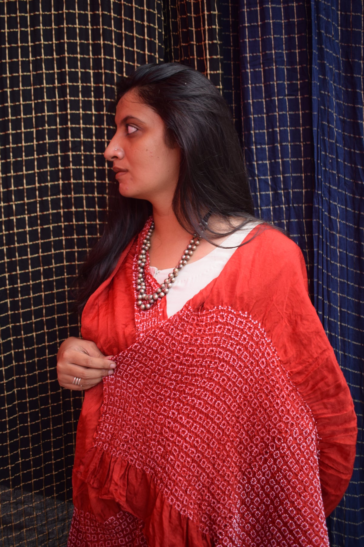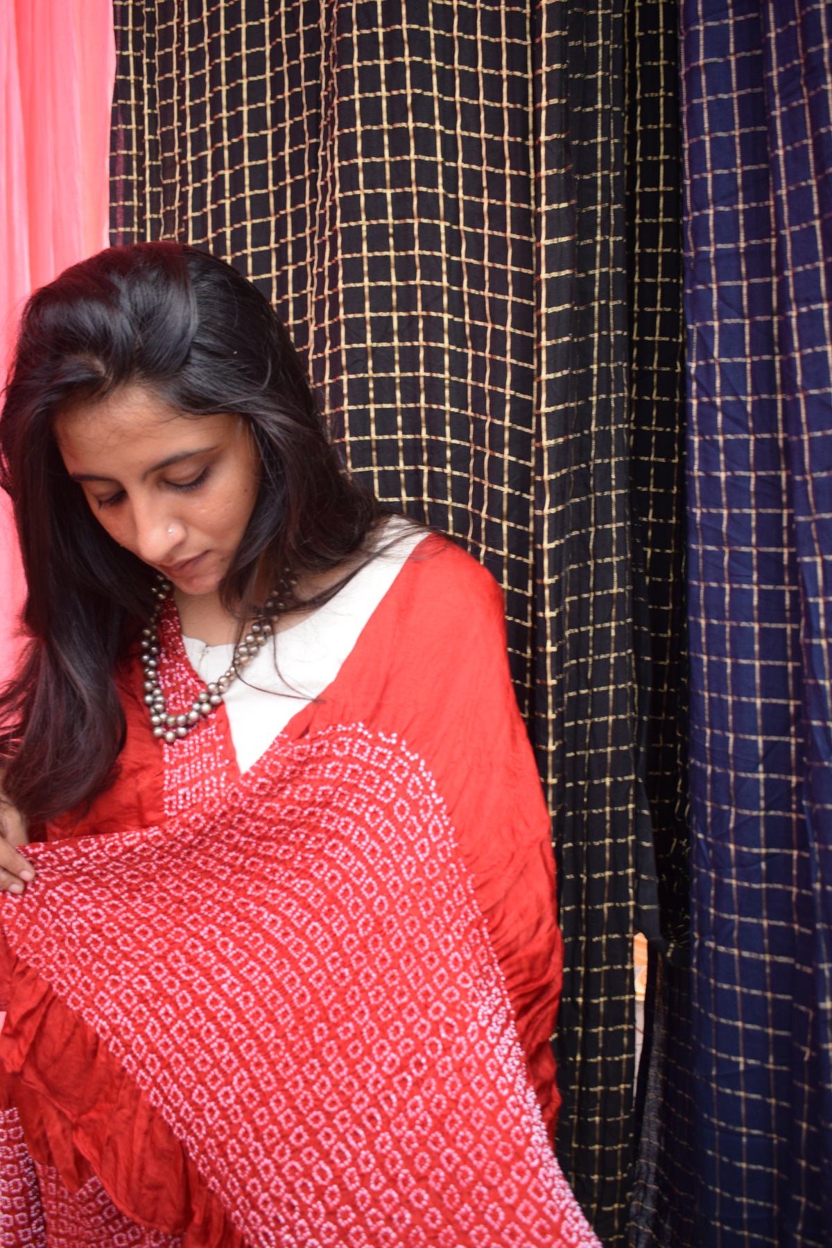 RED LINES AND DOTS BANDHANI SILK DUPATTA