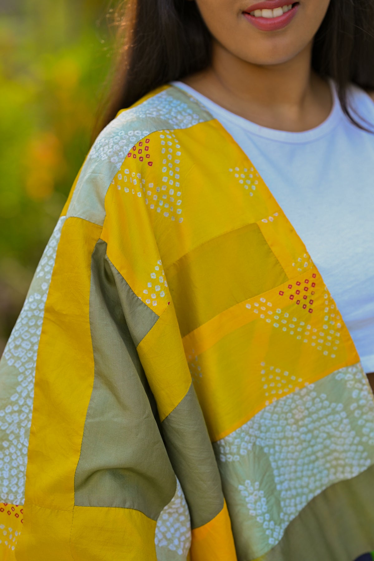 Our Reversible Patchwork Bandhani Dupattas, Stoles, and Sarees embody the perfect blend of tradition and versatility. Each piece is thoughtfully designed with two distinct sides, allowing you to switch between styles with ease. On one side, you'll find an intricate patchwork of fabrics, each carefully stitched together to form a unique mosaic of textures and patterns. The reverse side features either a classic bandhani design or a striking block print and wavy leheriya offering a contrasting yet complementary look. This dual design allows you to choose between a bold, artisanal appearance or a more understated, refined elegance. Each piece in this collection is a one-of-a-kind creation, with patches that share a consistent color theme but vary in design, ensuring that no two items are exactly alike. Perfect for any occasion, they are a statement of style, tradition, and individuality, adapting effortlessly to your mood and wardrobe needs.