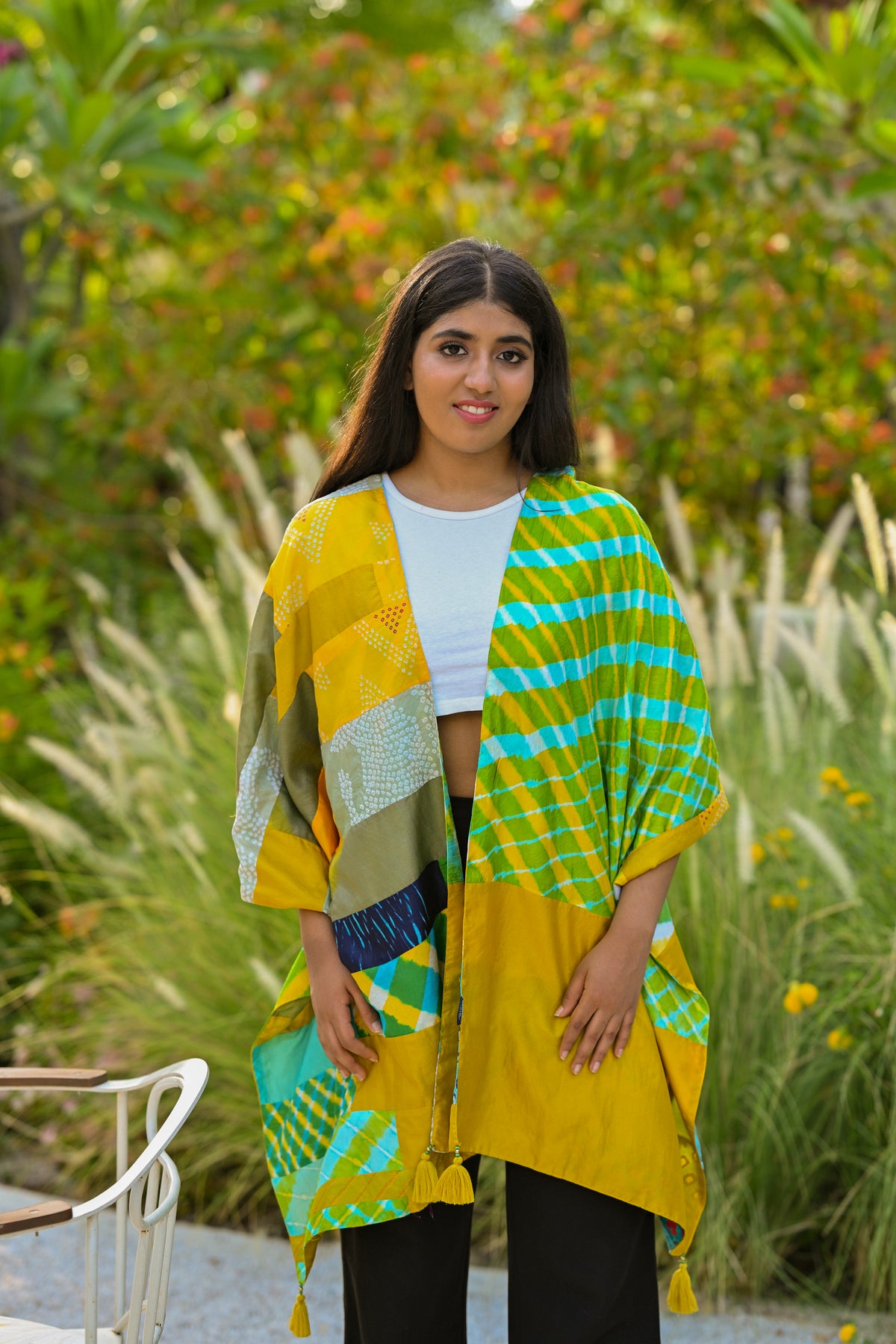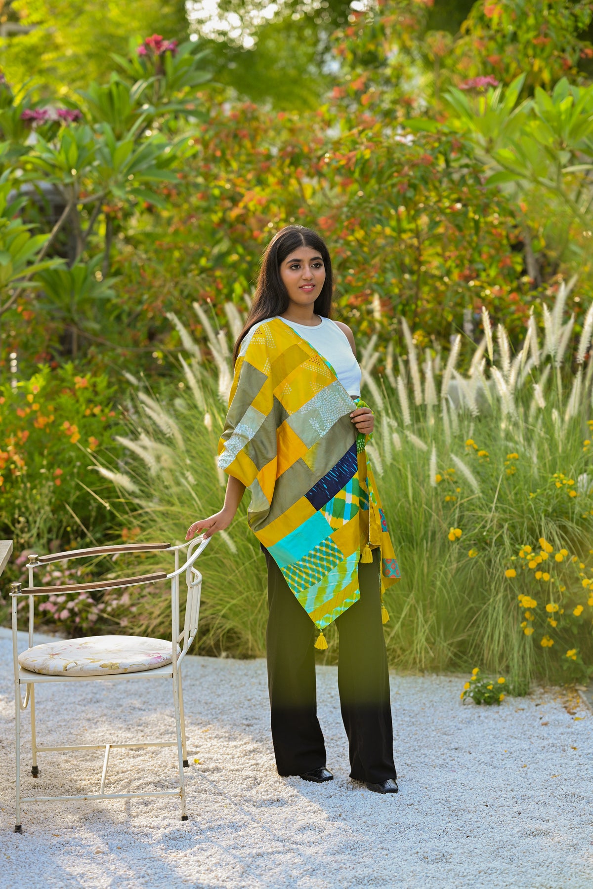 YELLOW-GREEN BAARADOZI PATCHWORK REVERSIBLE SILK STOLE WITH TASSELS