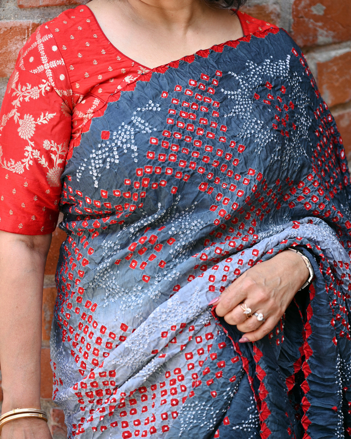 The blouse used on the model is not inclusive; a bandhani silk blouse is included with the saree.