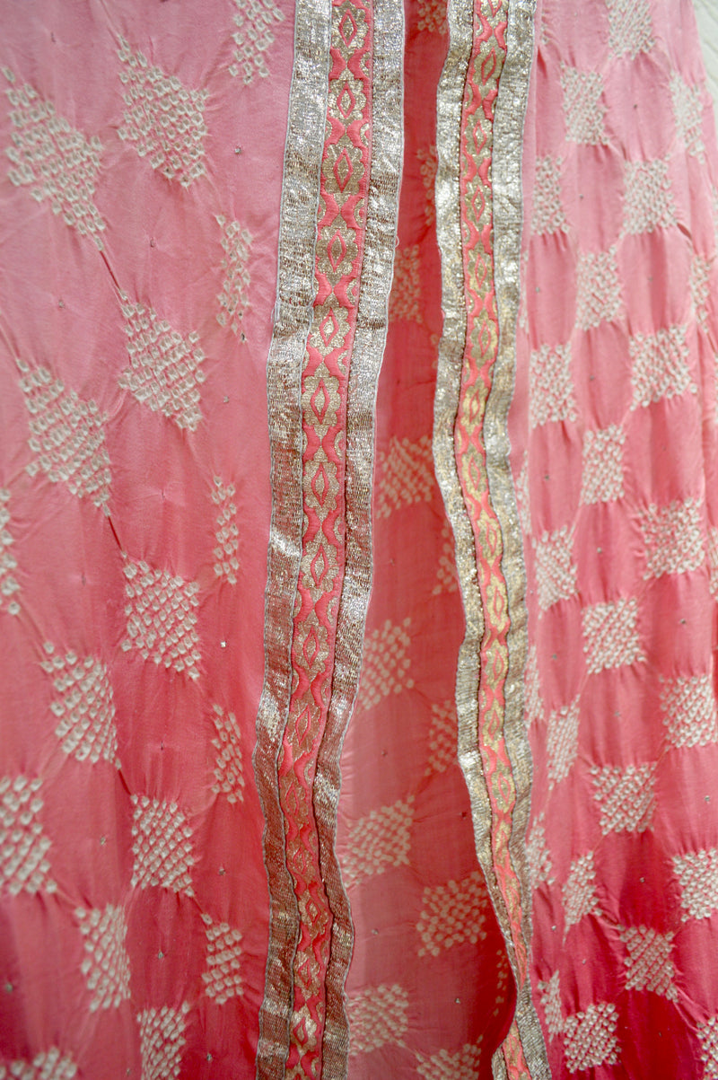 PINK SQUARE GEOMETRIC BANDHANI SILK DUPATTA WITH BORDER AND MUKAISH WORK