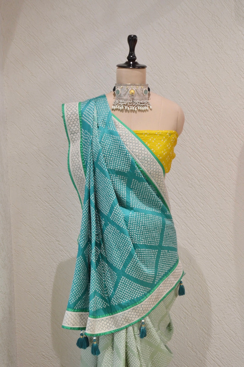 LIGHT GREEN DIAMOND SILK BANDHANI SAREE WITH BORDER AND TASSELS