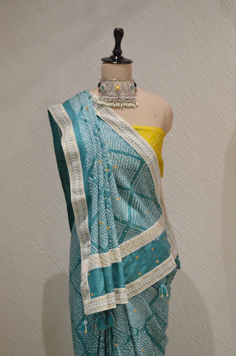 LIGHT BLUE DIAMOND SILK BANDHANI SAREE WITH MIRROR WORK, TASSELS AND BORDER