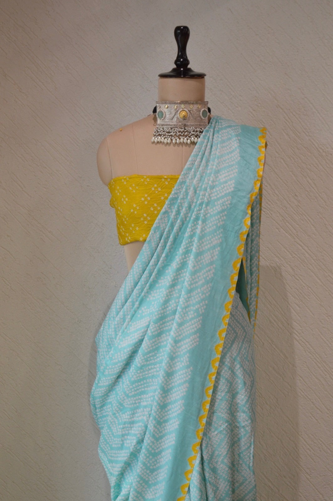 The Zig-Zag saree introduces a fresh take on bandhani, blending the essence of leheriya with a unique design found only at Neelgar. This creation combines colors and subtle hues, offering a rare and exquisite bandhani pattern.