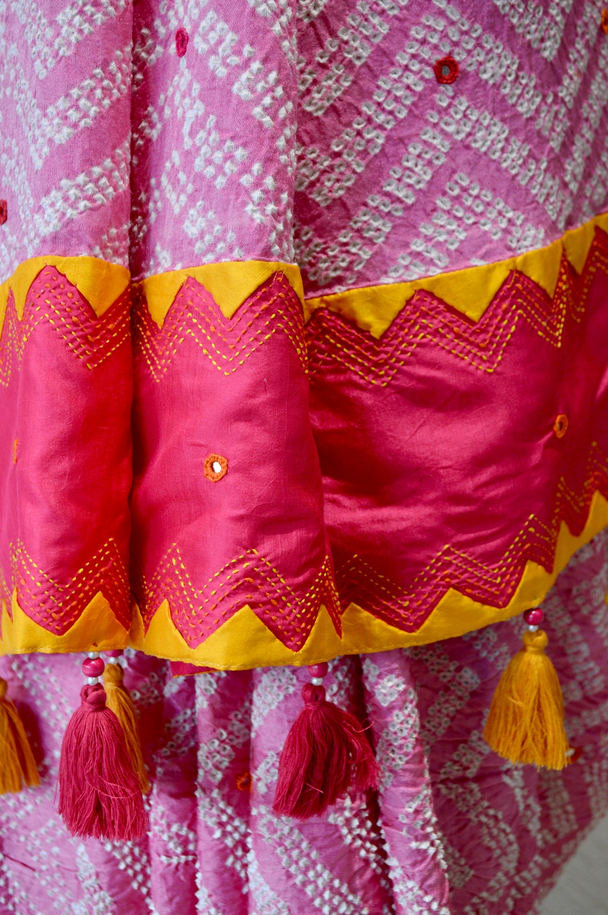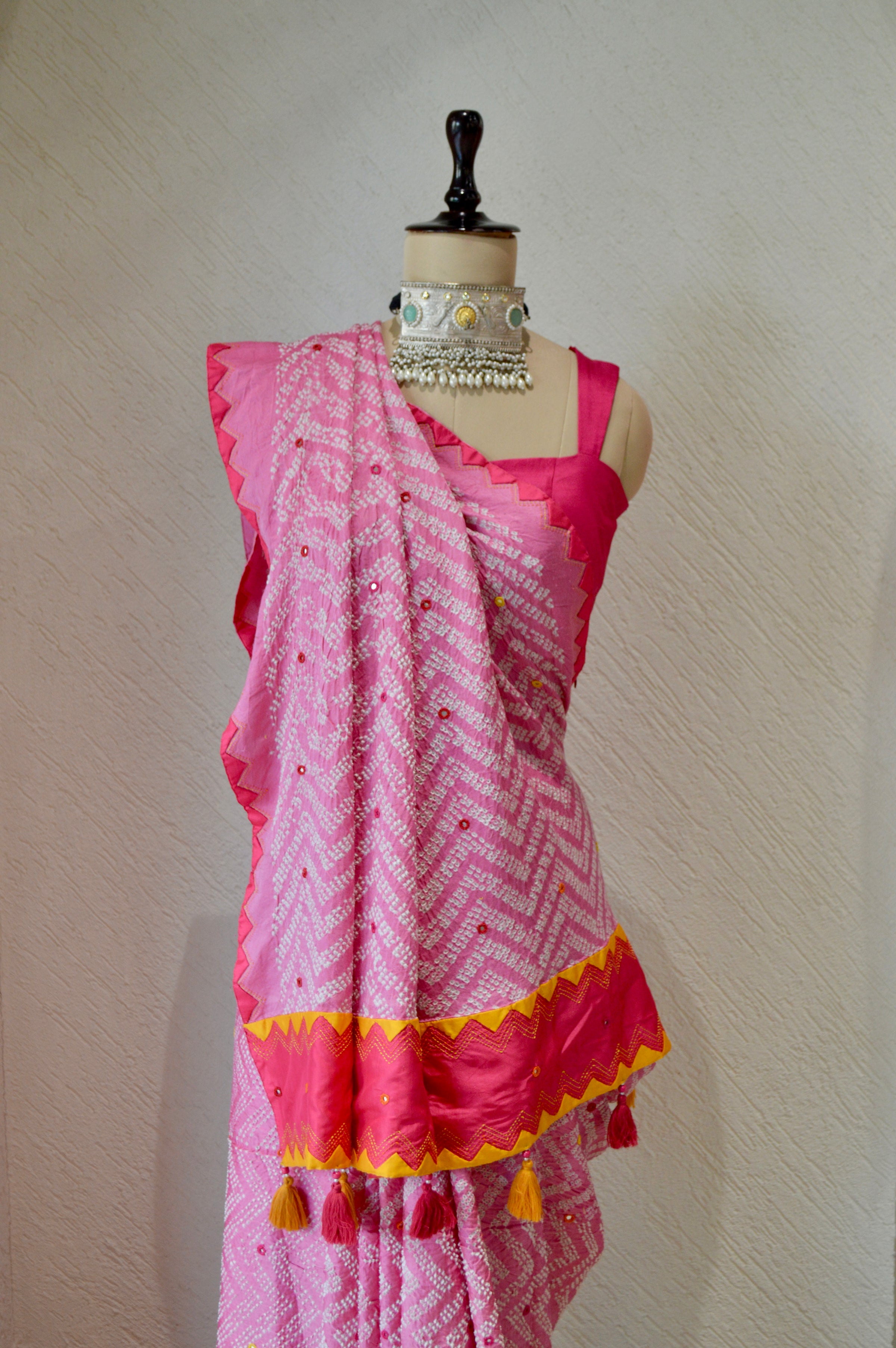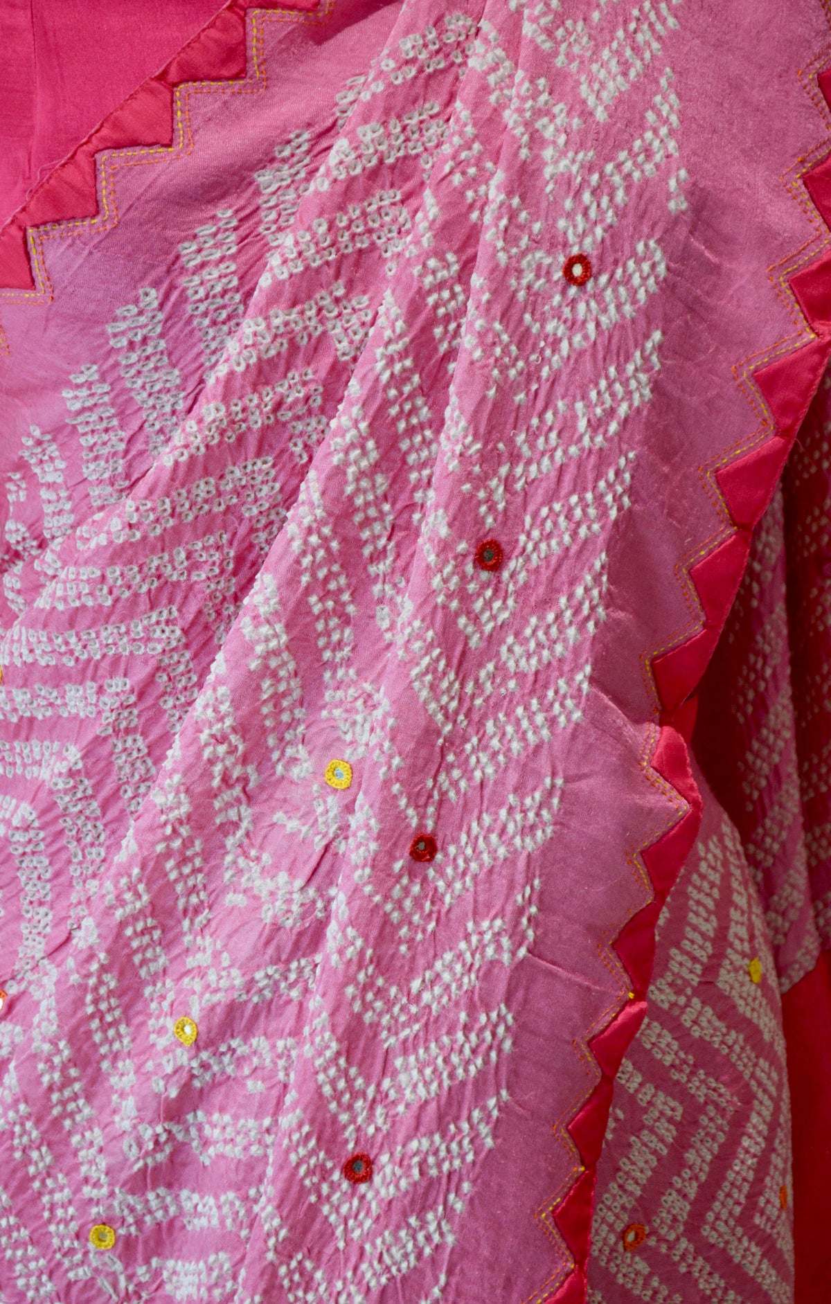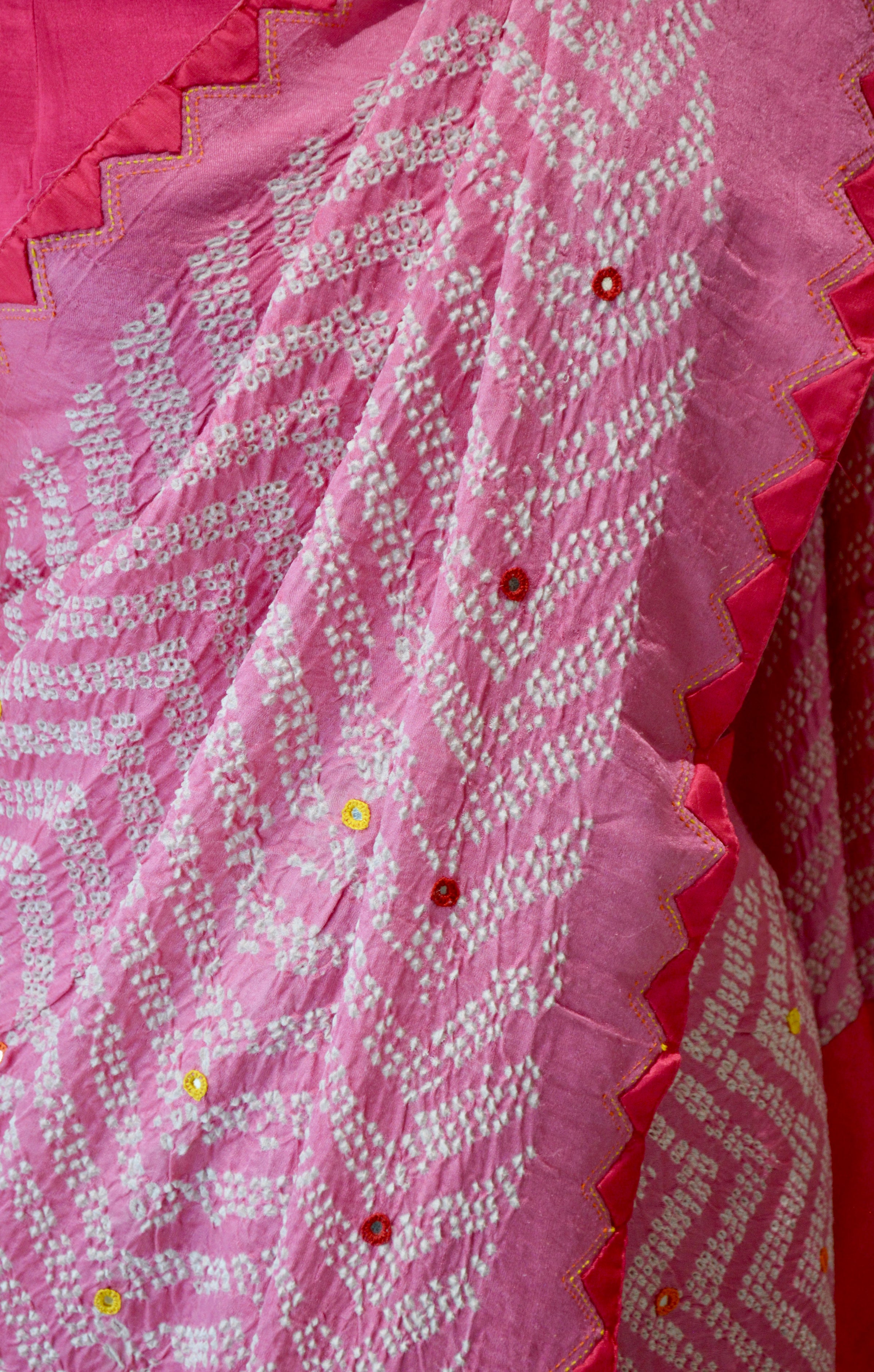 PINK CHEVRON SILK BANDHANI EMBROIDERED SAREE WITH MIRROR WORK AND APPLIQUE