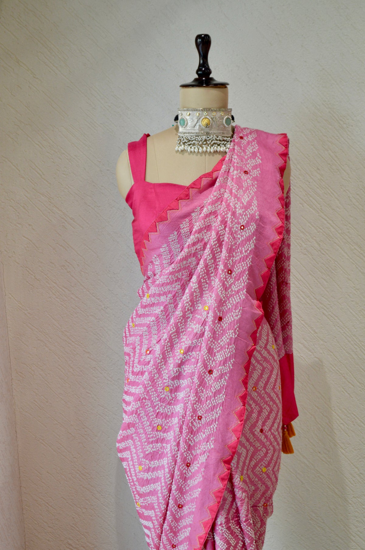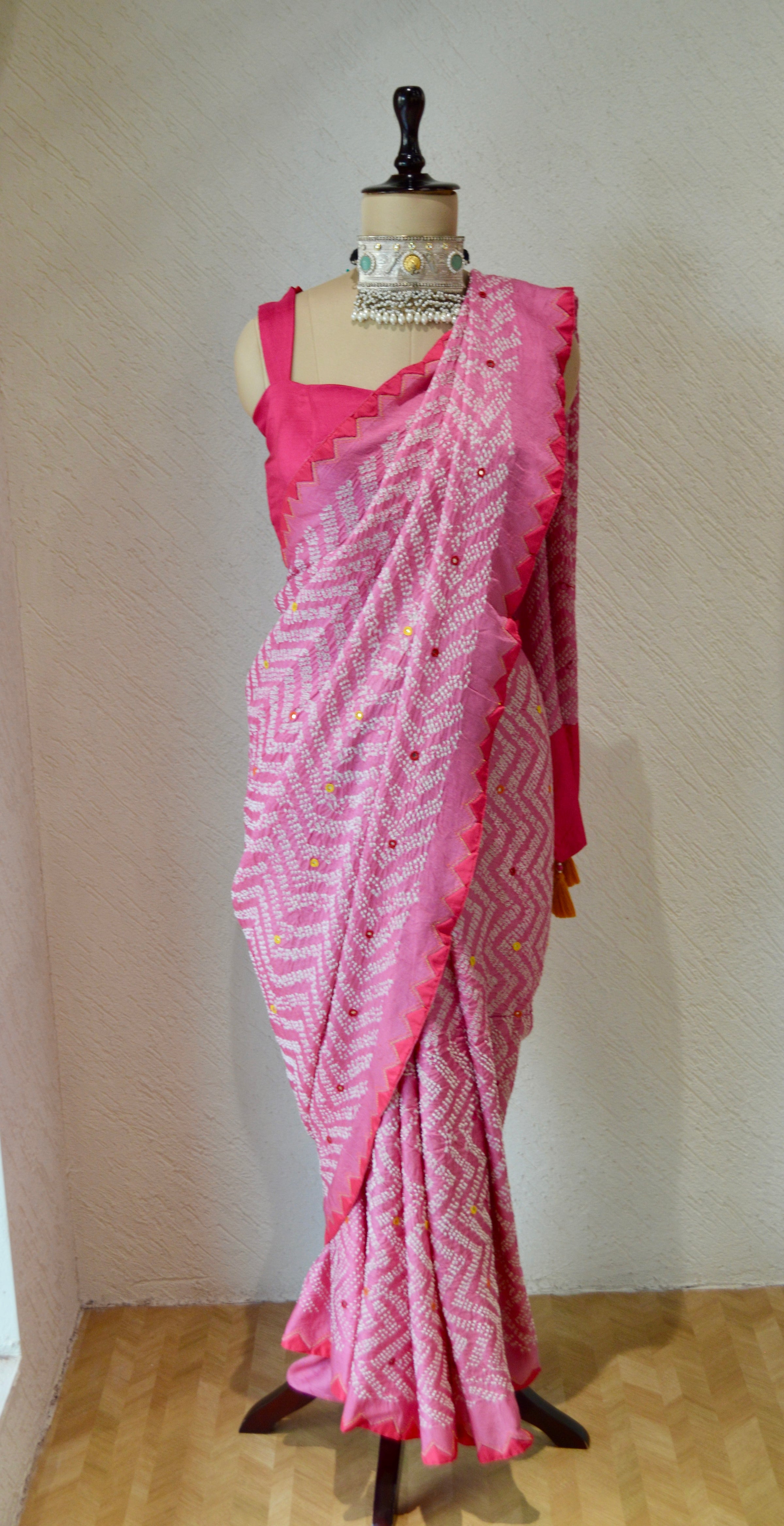 The blouse used on the Mannequin is not included; a bandhani silk blouse is included with the saree.