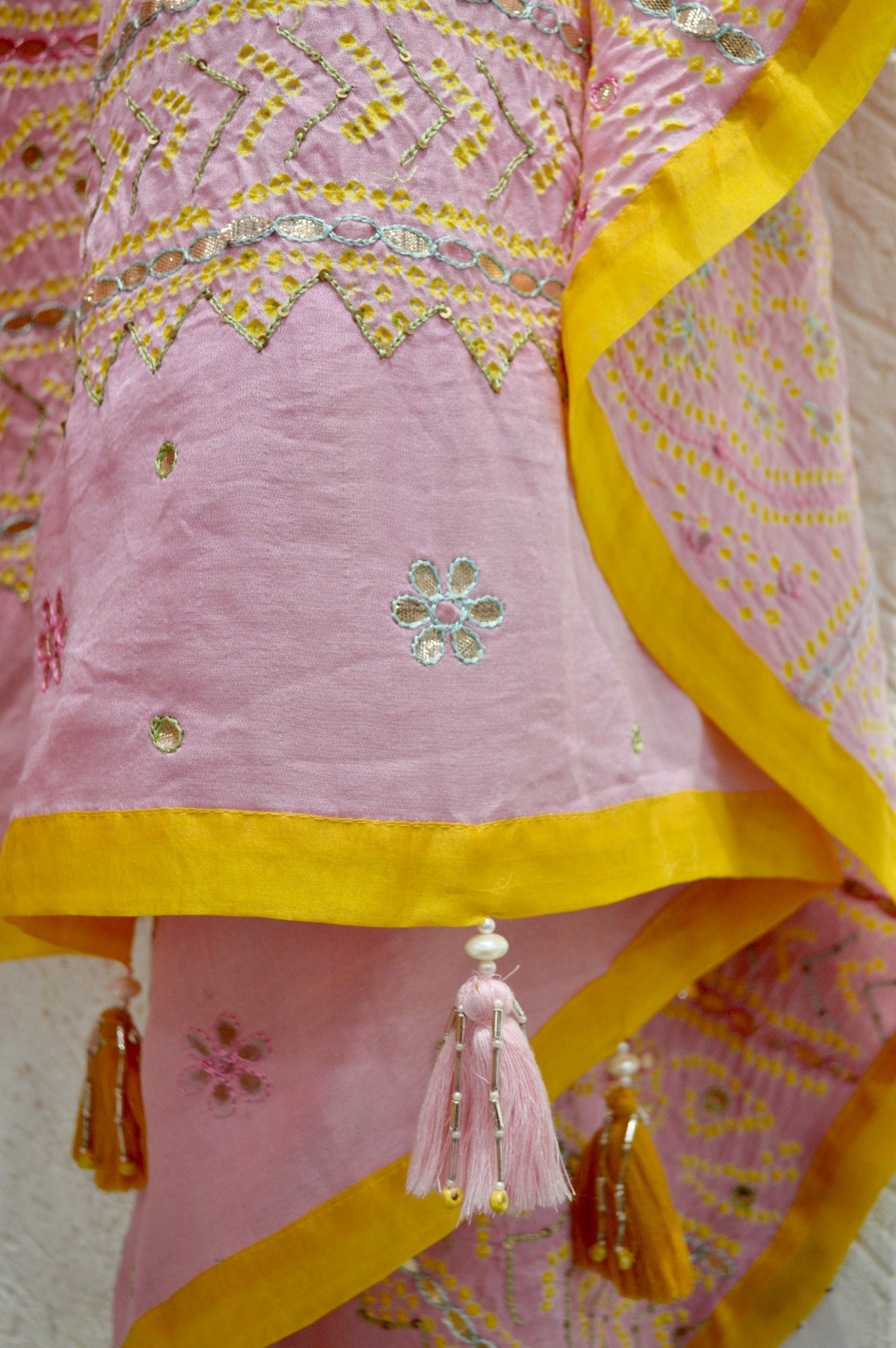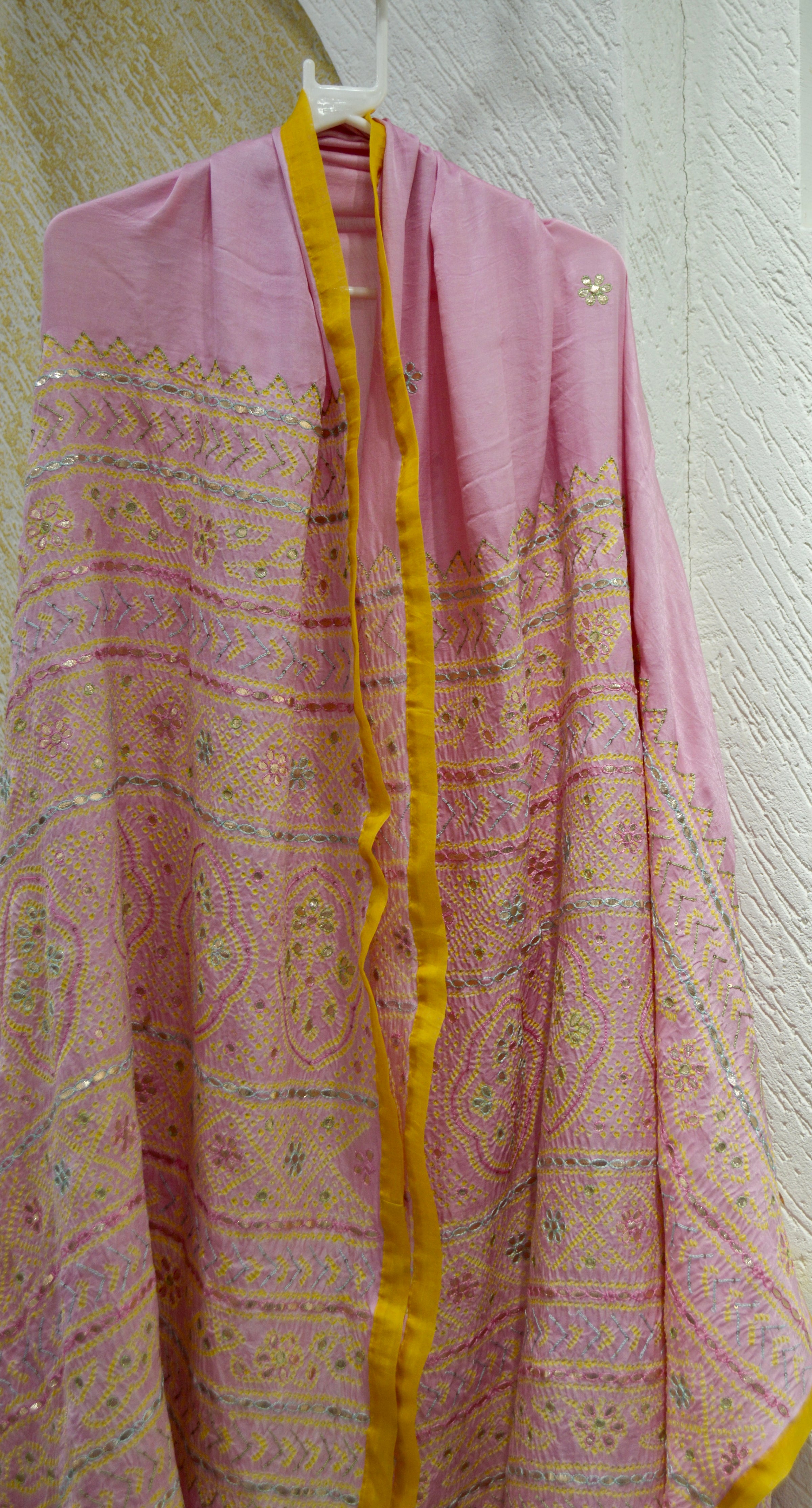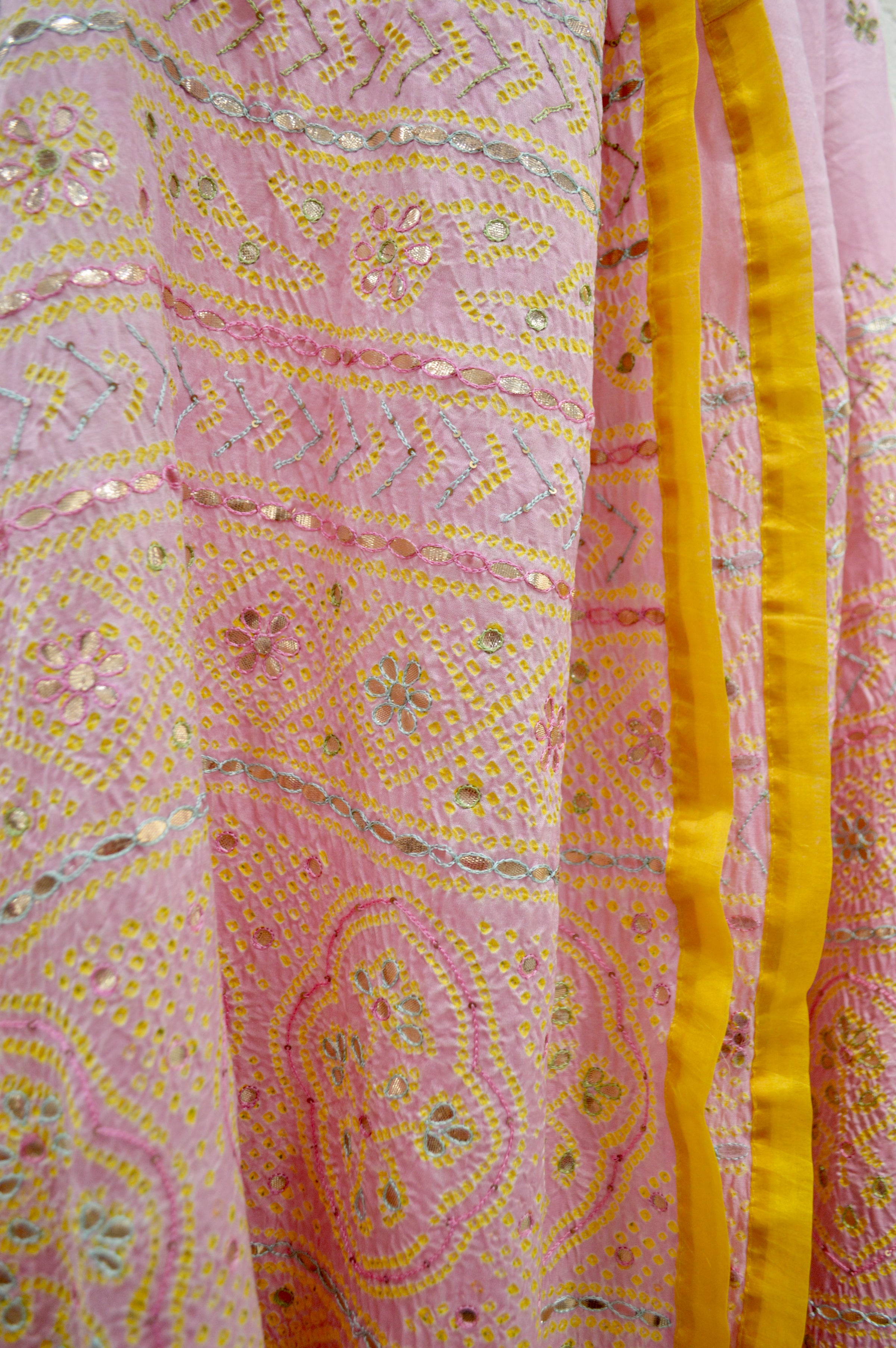 PINK-ORANGE YIN-YANG HALF FULL HALF EMPTY BANDHANI SILK EMBROIDERED DUPATTA