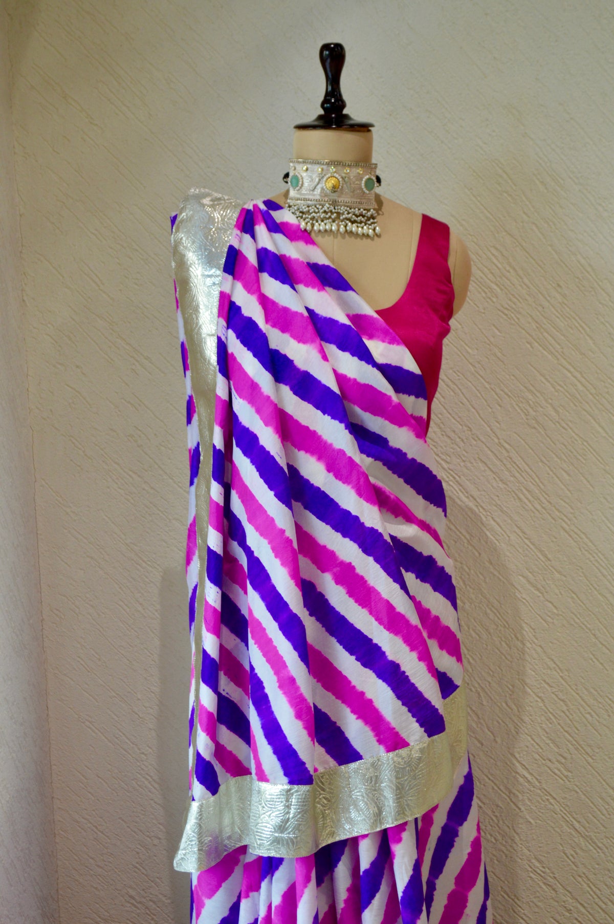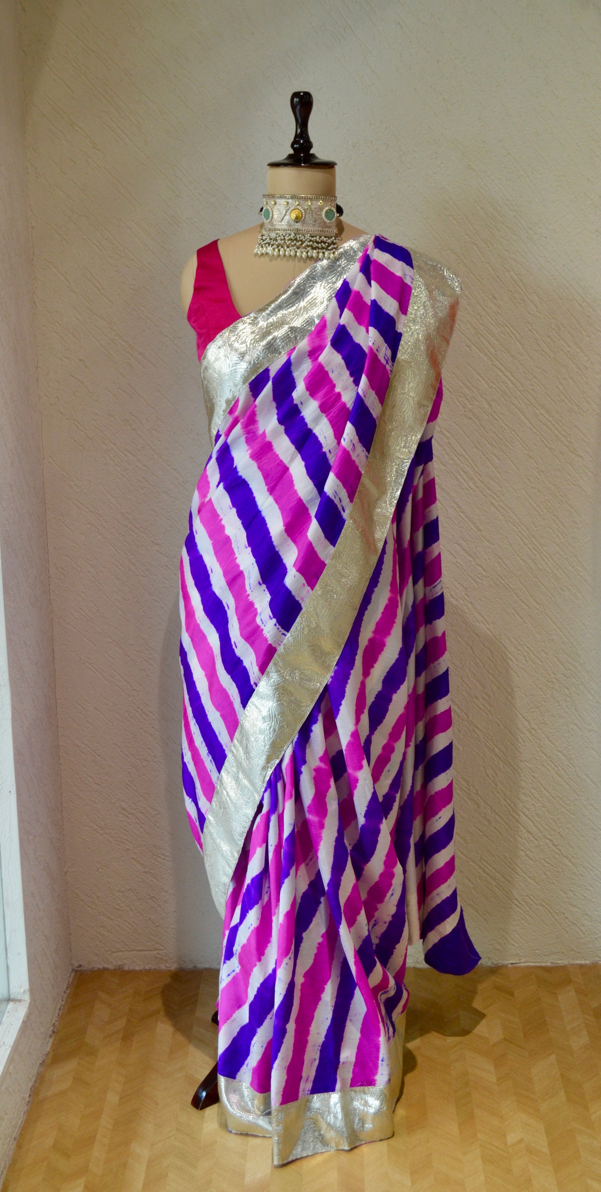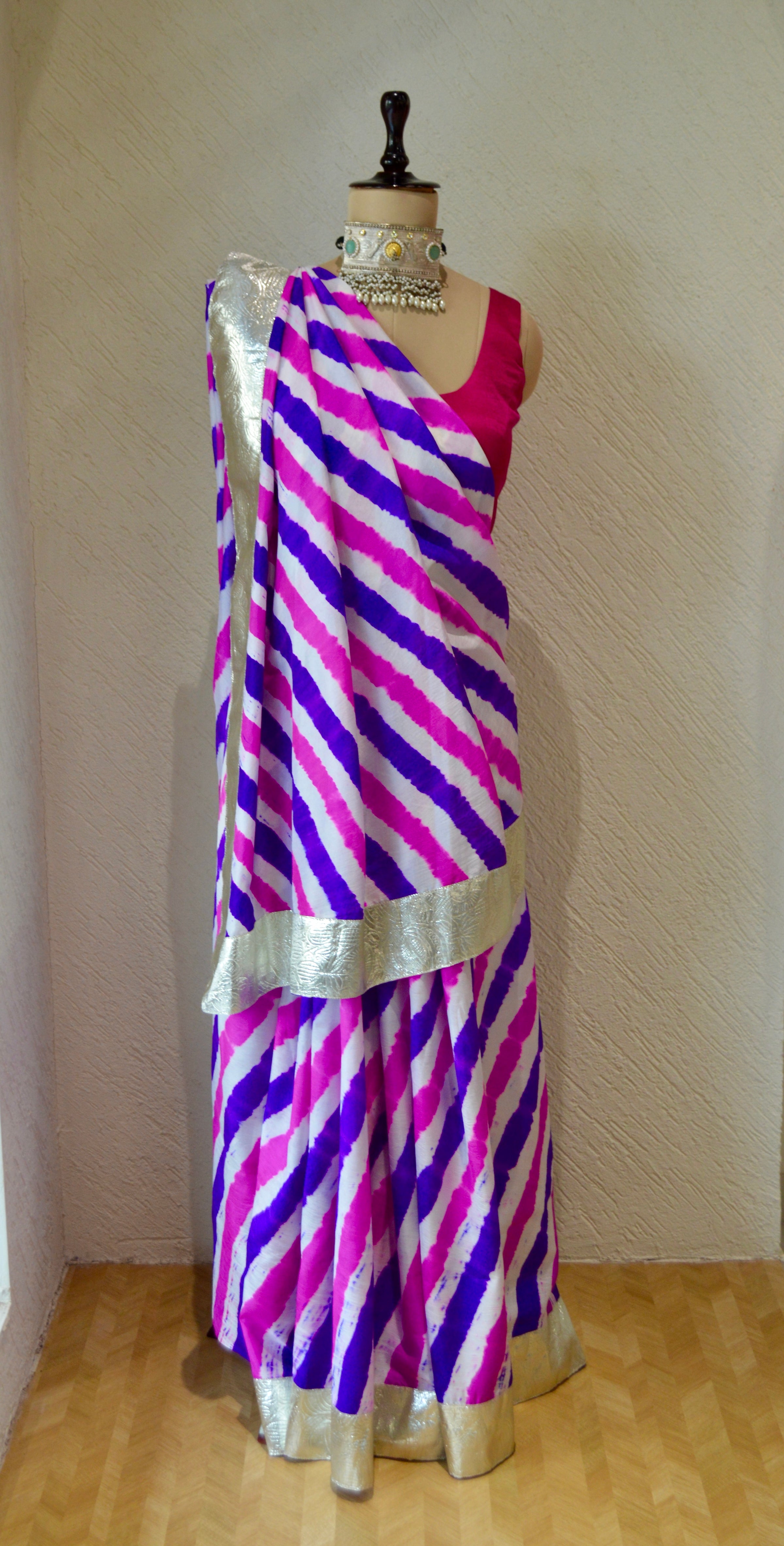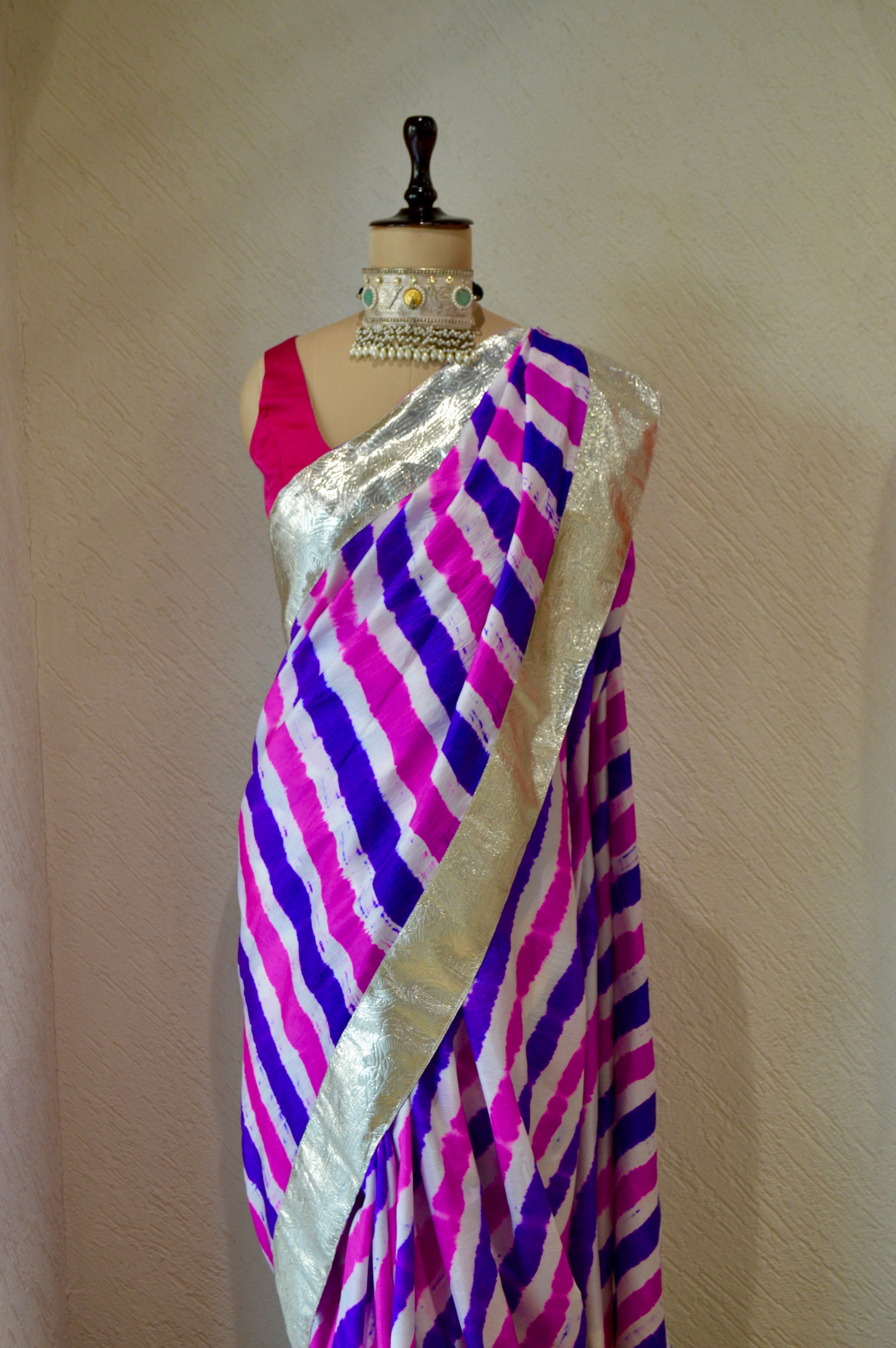 The blouse used on the Mannequin is not included, a bandhani silk blouse is included with the saree.